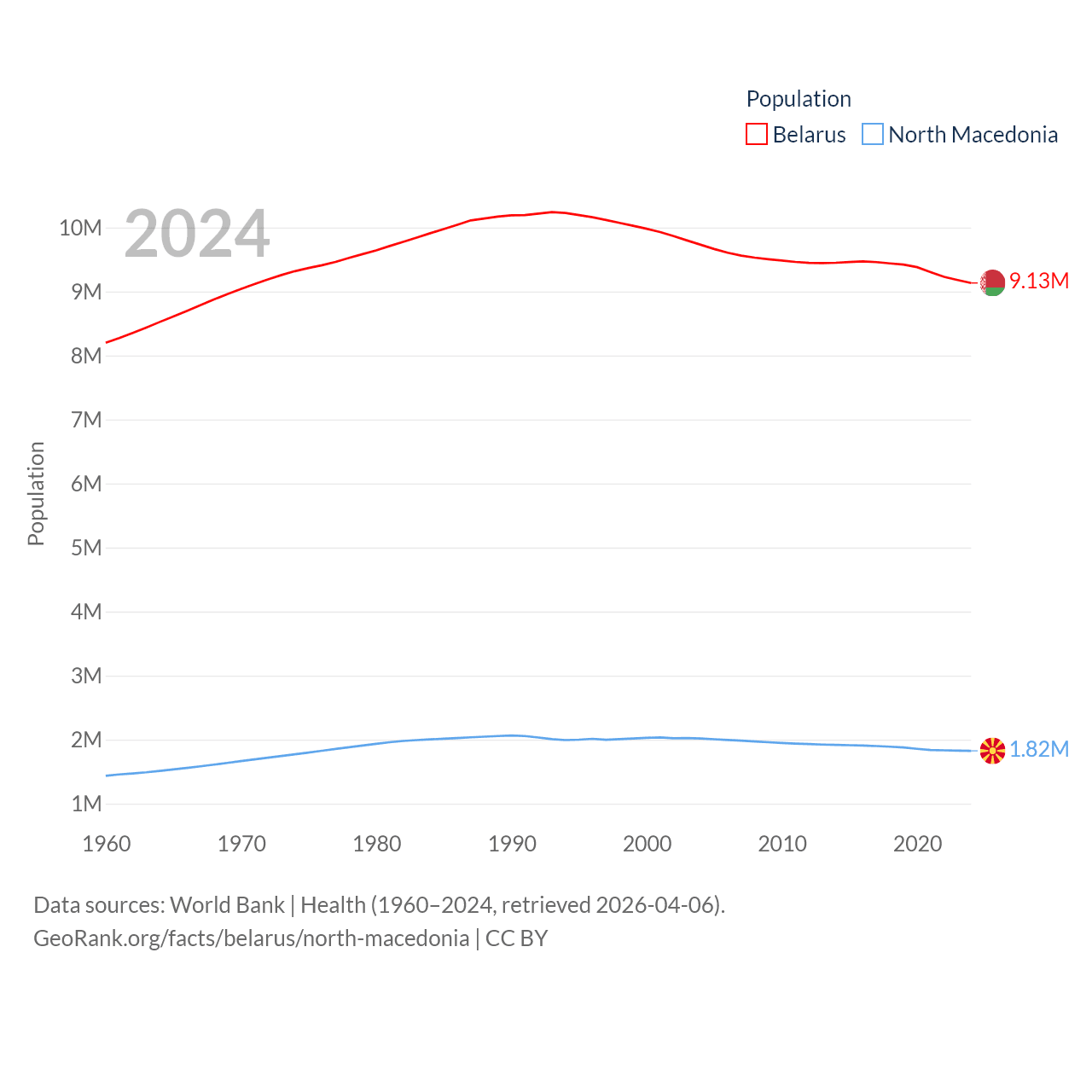 Belarus has a population of 9.13M (ranked 100/197), compared with 1.82M in North Macedonia (ranked 150/197). Belarus' land area is 78,372 sq mi versus 9,737 sq mi for North Macedonia (ranked 83rd vs. 145th).
