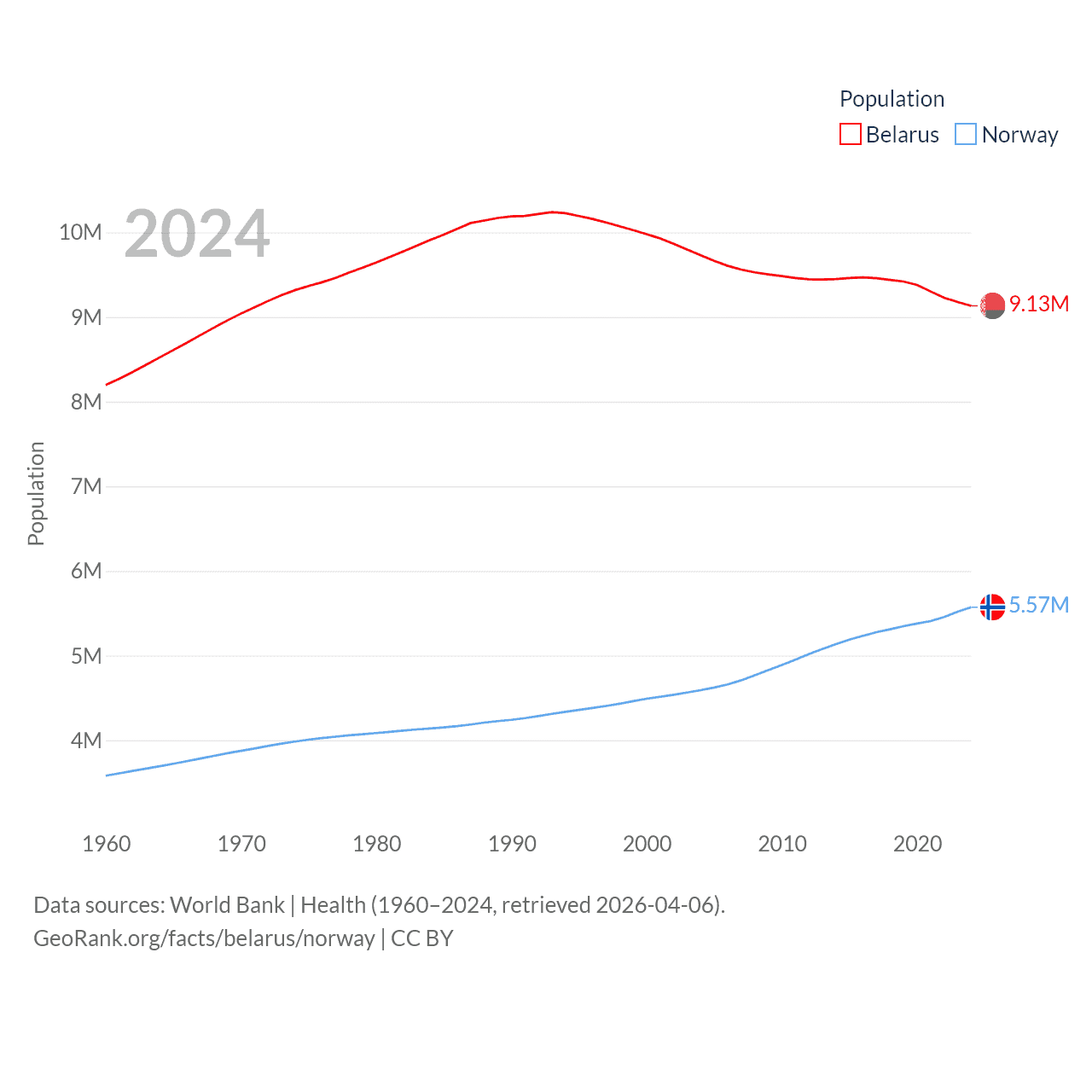 Belarus has a population of 9.13M (ranked 100/197), compared with 5.57M in Norway (ranked 118/197). Belarus' land area is 78,372 sq mi versus 140,645 sq mi for Norway (ranked 83rd vs. 62nd).