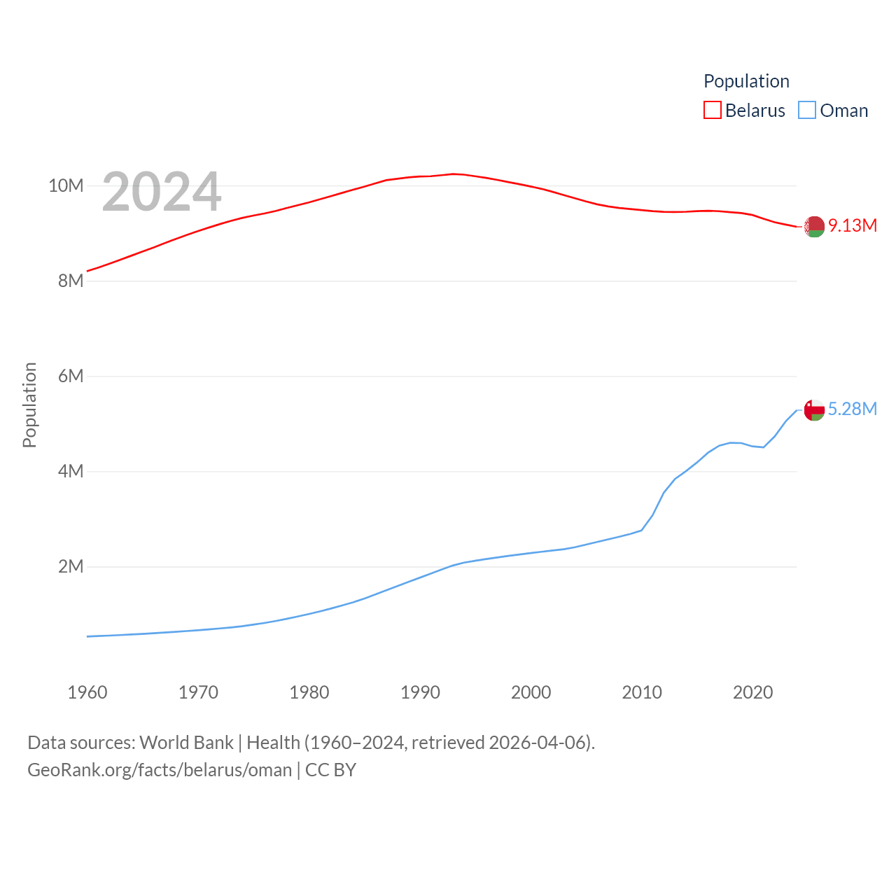 Belarus has a population of 9.13M (ranked 100/197), compared with 5.28M in Oman (ranked 124/197). Belarus' land area is 78,372 sq mi versus 119,499 sq mi for Oman (ranked 83rd vs. 68th).