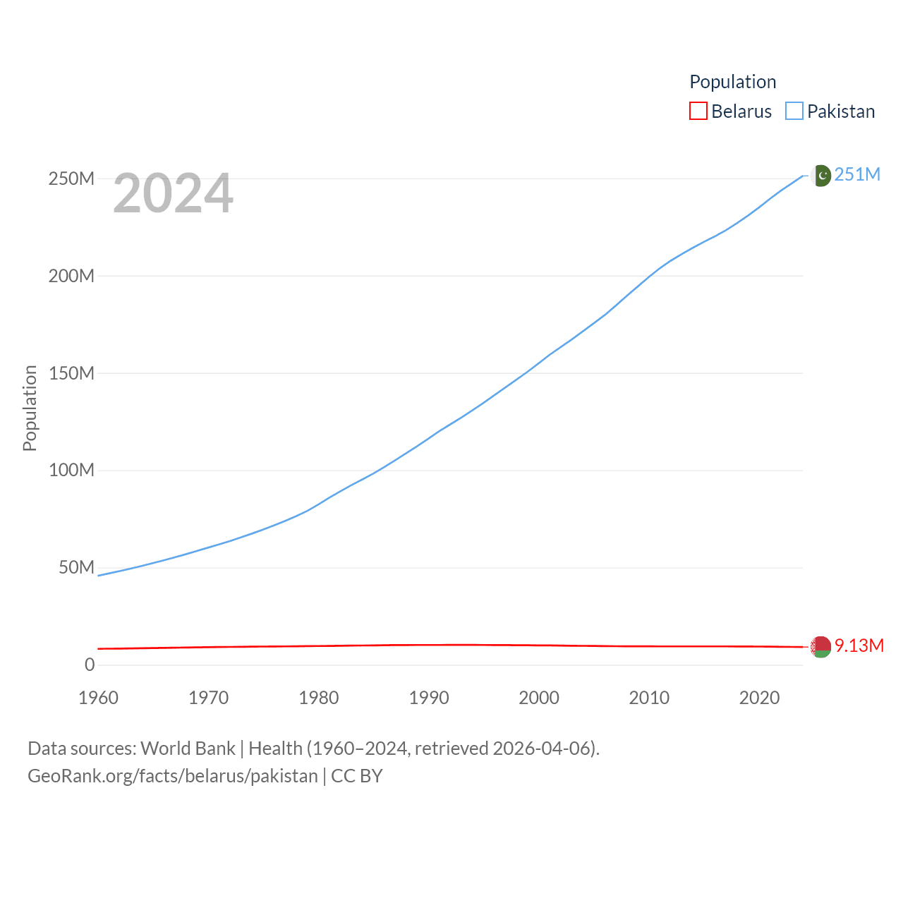 Belarus has a population of 9.13M (ranked 100/197), compared with 251M in Pakistan (ranked 5/197). Belarus' land area is 78,372 sq mi versus 297,638 sq mi for Pakistan (ranked 83rd vs. 35th).
