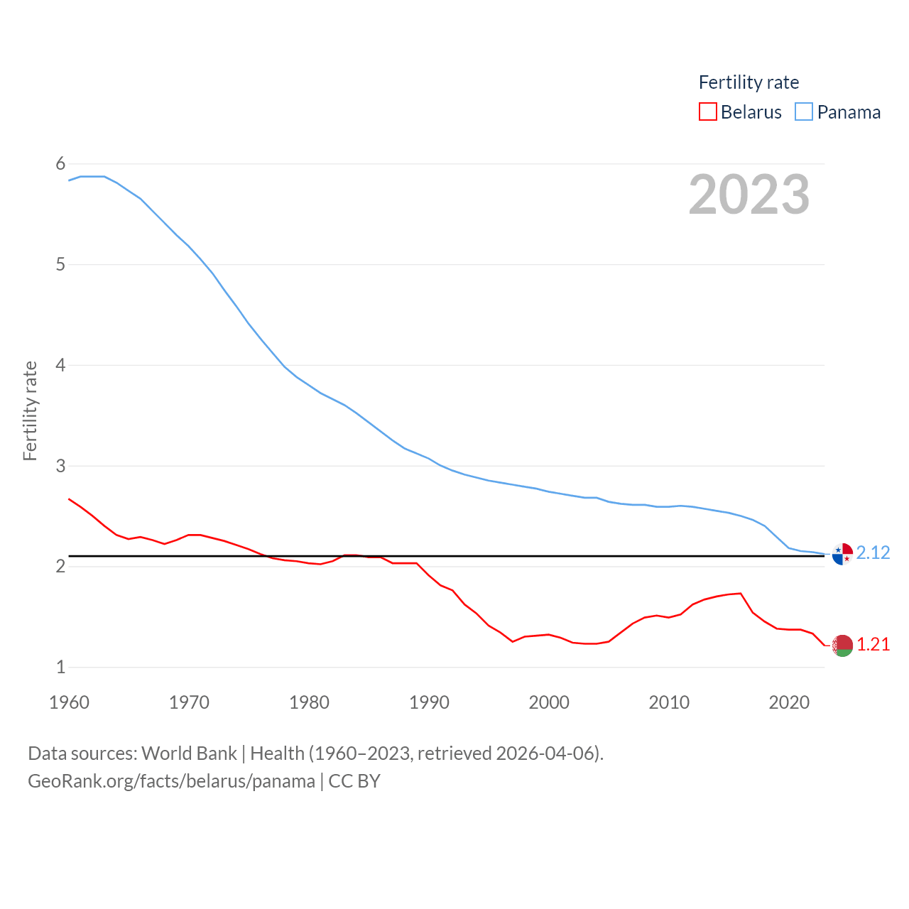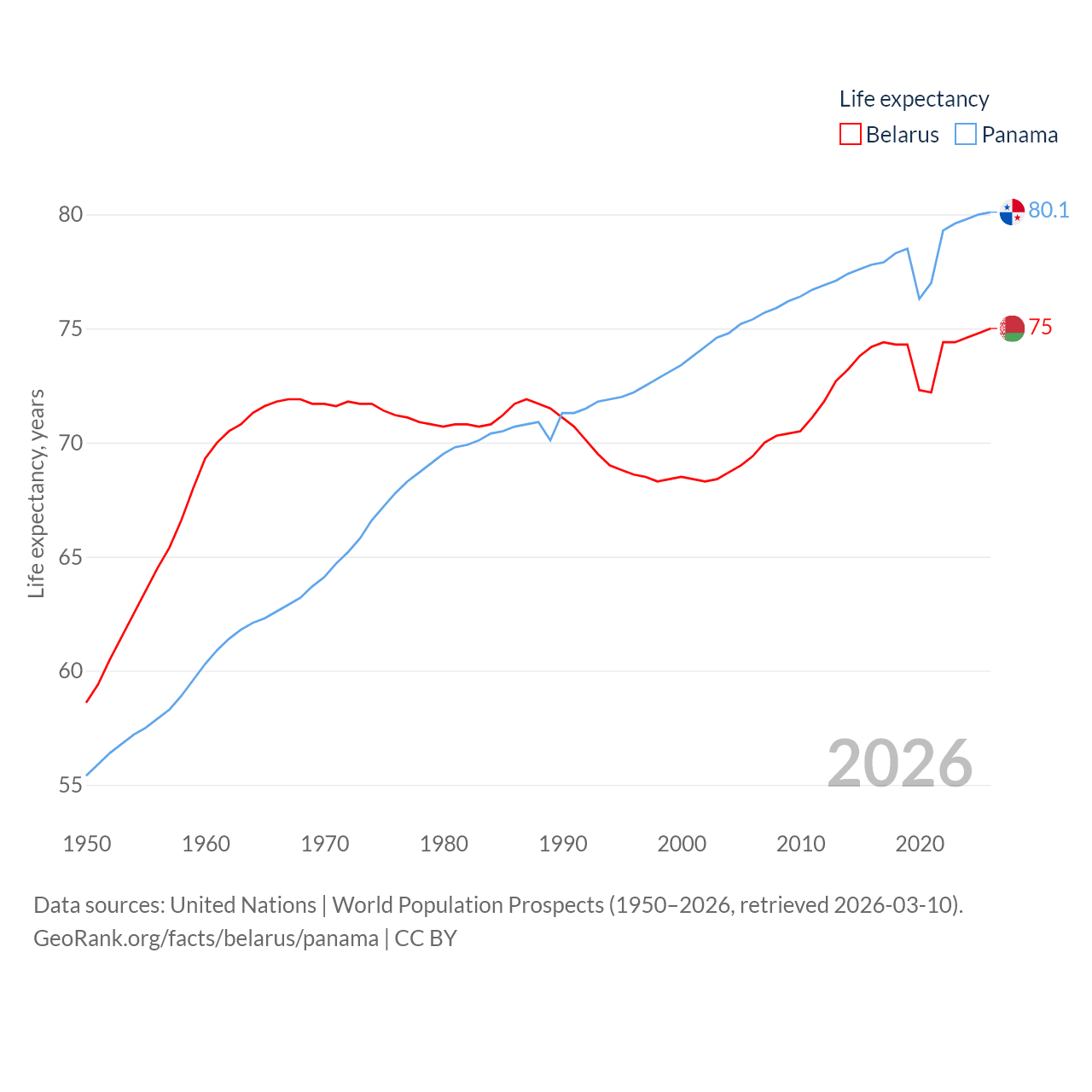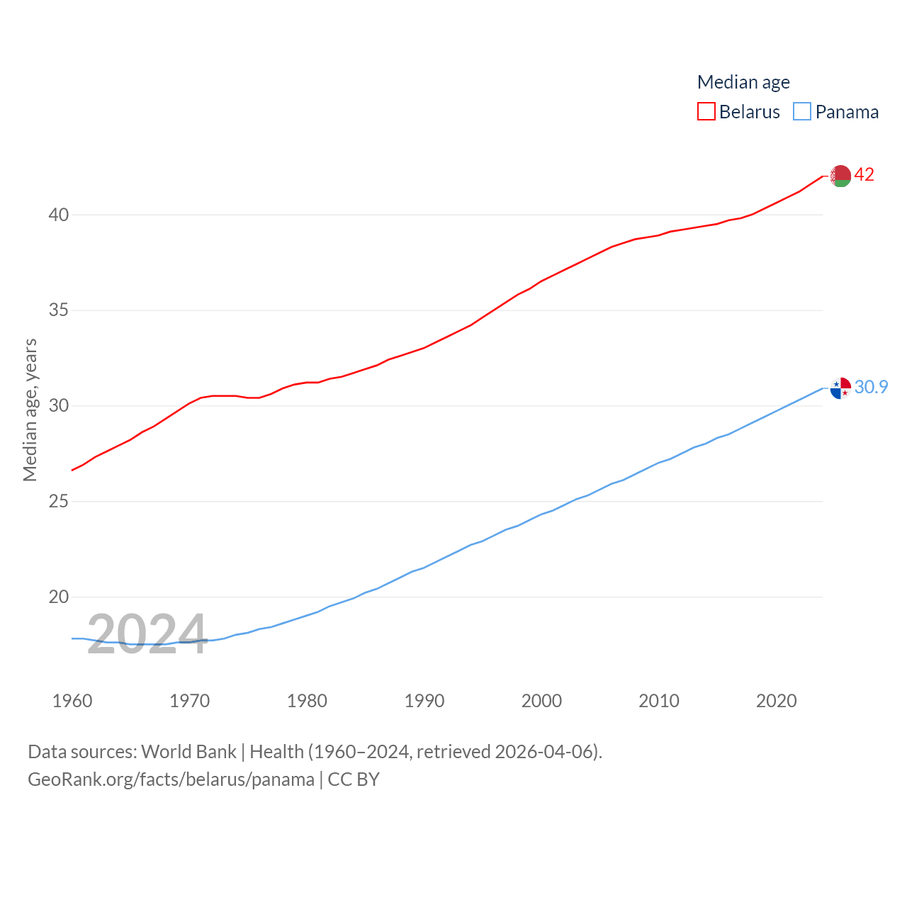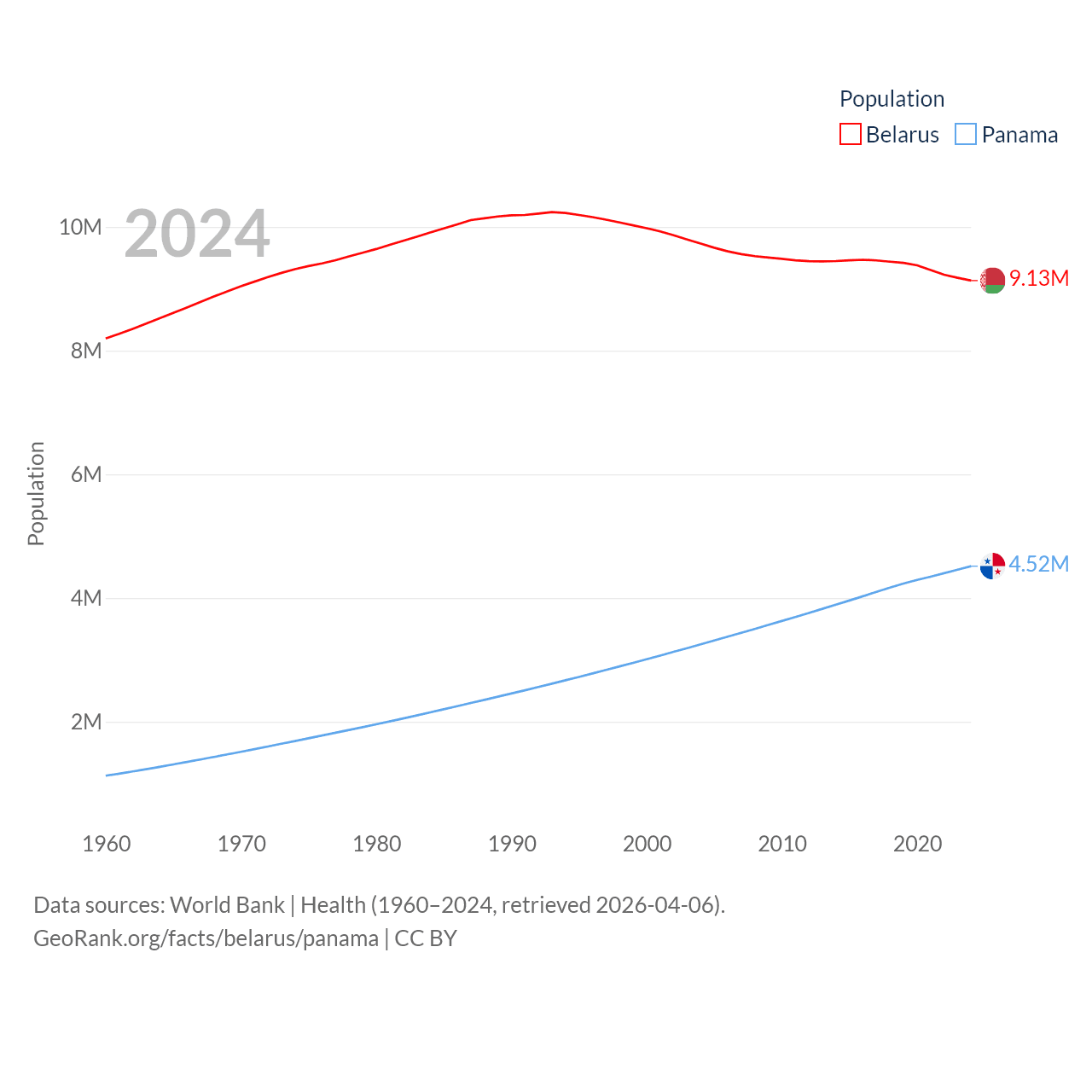 Belarus has a population of 9.13M (ranked 100/197), compared with 4.52M in Panama (ranked 128/197). Belarus' land area is 78,372 sq mi versus 28,641 sq mi for Panama (ranked 83rd vs. 115th).