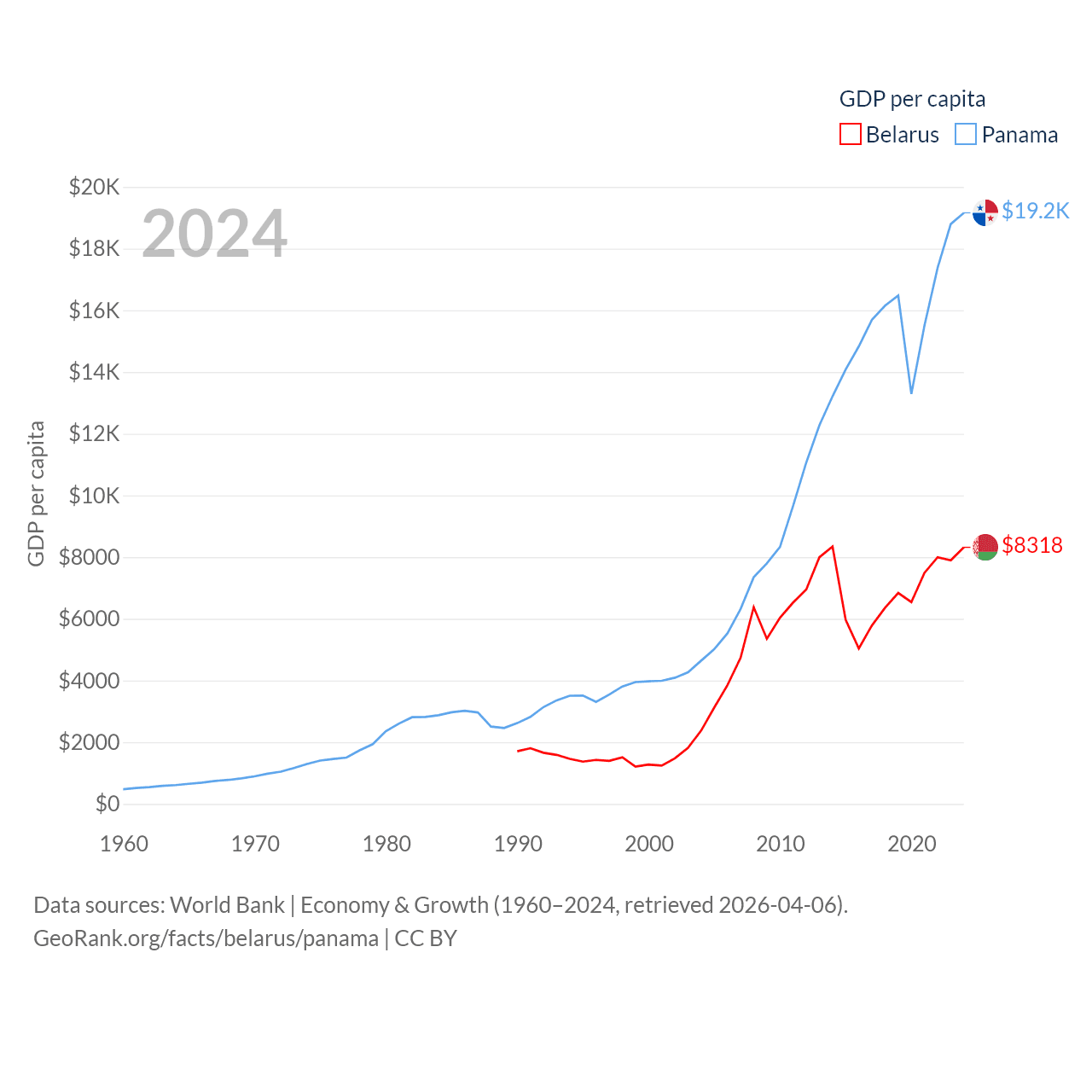 By GDP, Belarus ranks 83/197 ($76B) and Panama ranks 78/197 ($86.5B). By GDP per capita, Belarus ranks 92/197 ($8,318), while Panama ranks 60/197 ($19,161).