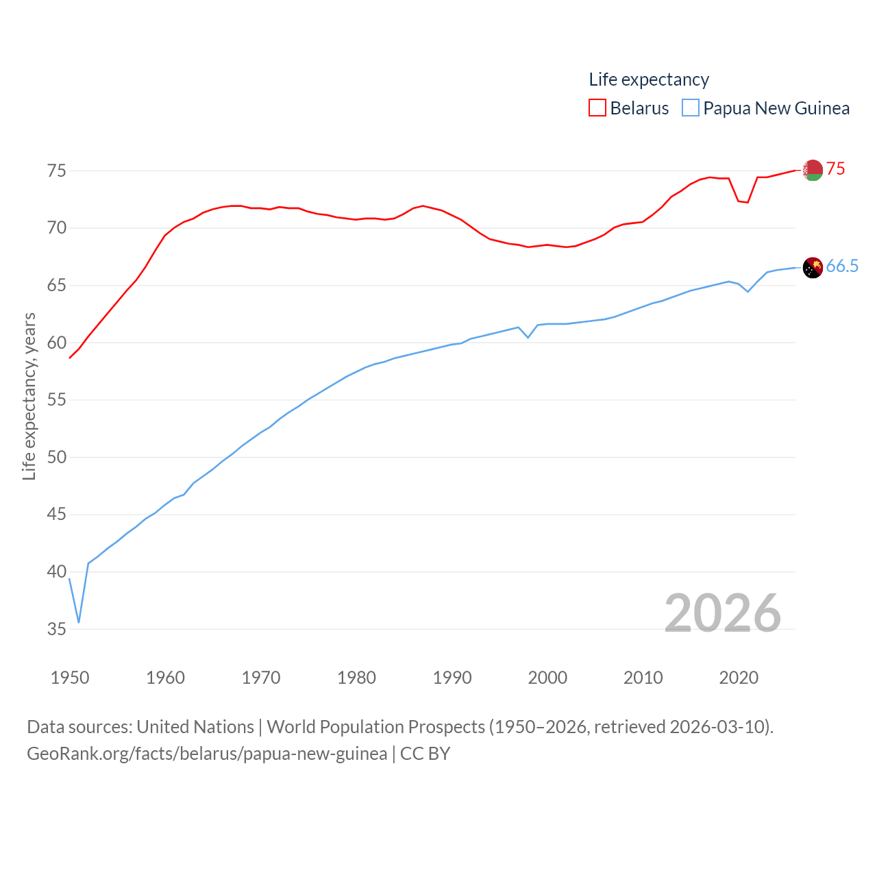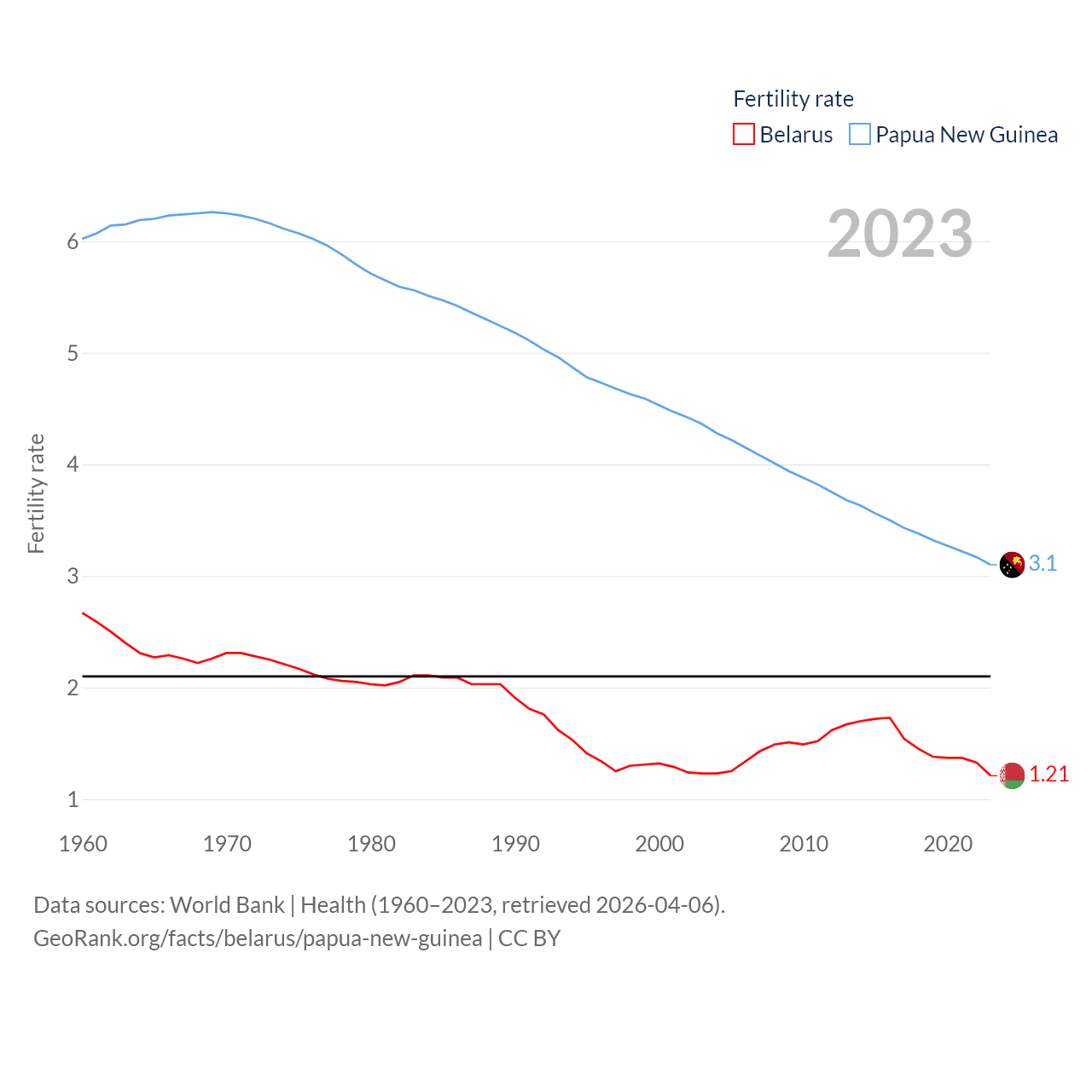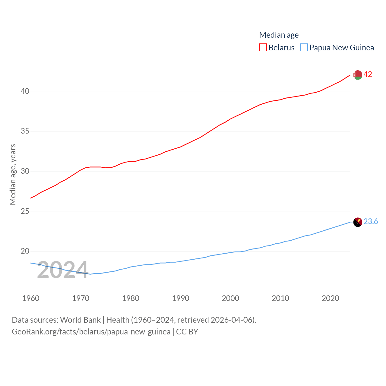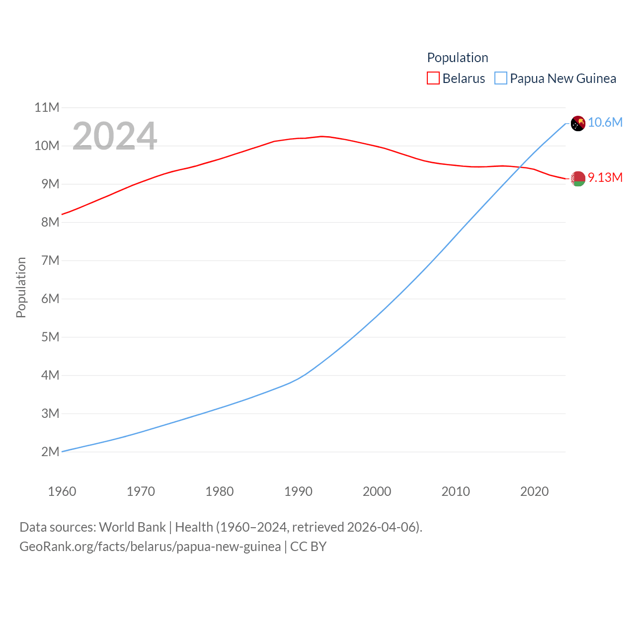 Belarus has a population of 9.13M (ranked 100/197), compared with 10.6M in Papua New Guinea (ranked 92/197). Belarus' land area is 78,372 sq mi versus 174,850 sq mi for Papua New Guinea (ranked 83rd vs. 54th).