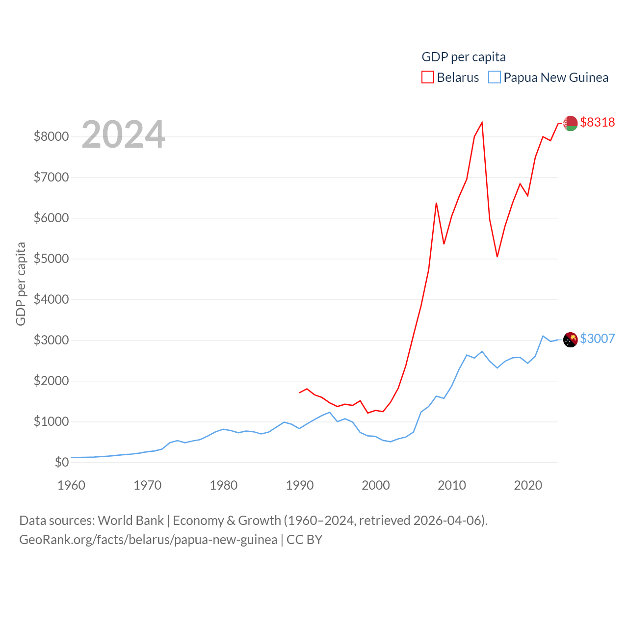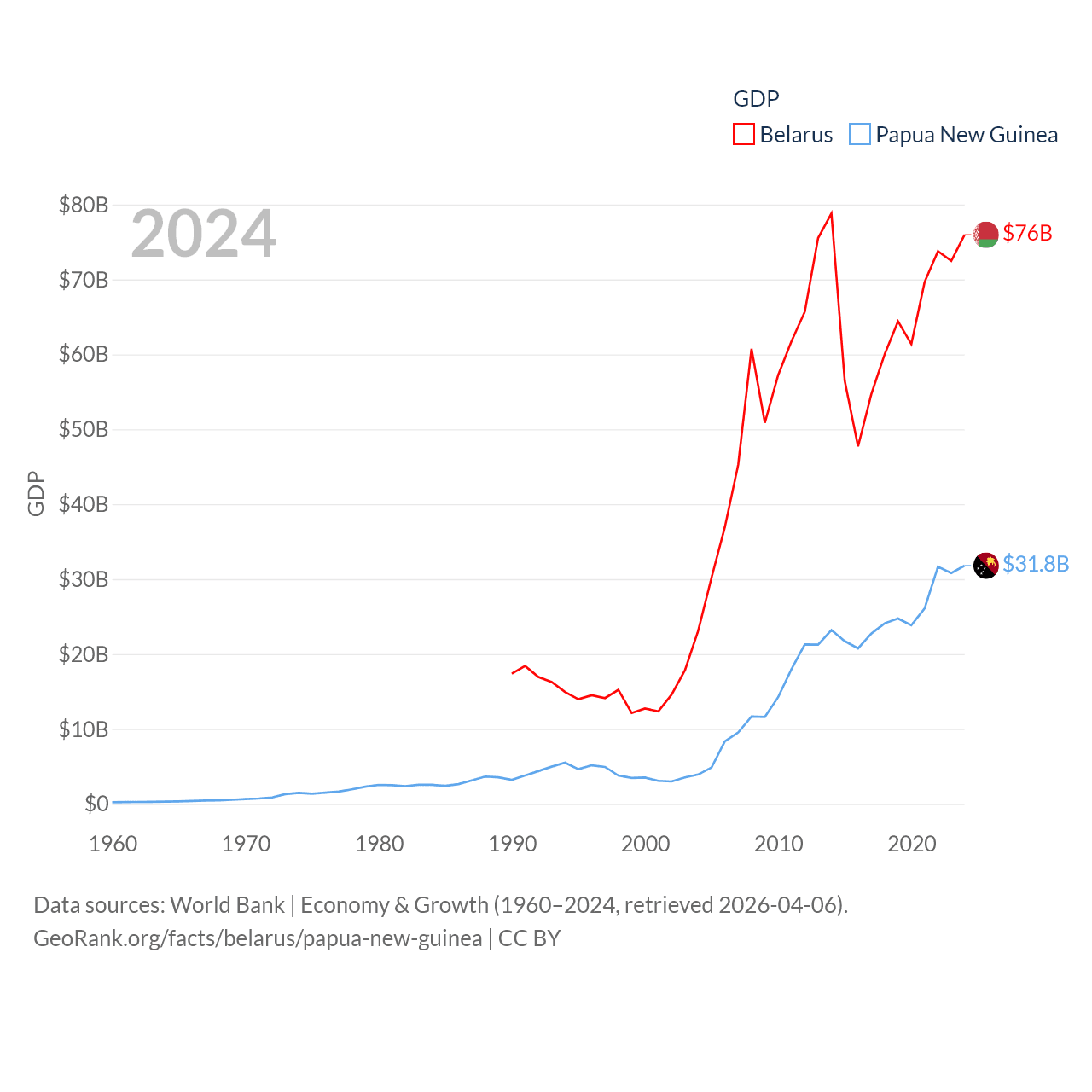 By GDP, Belarus ranks 83/197 ($76B) and Papua New Guinea ranks 110/197 ($31.8B). By GDP per capita, Belarus ranks 92/197 ($8,318), while Papua New Guinea ranks 140/197 ($3,007).