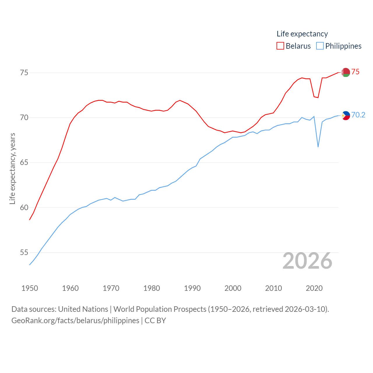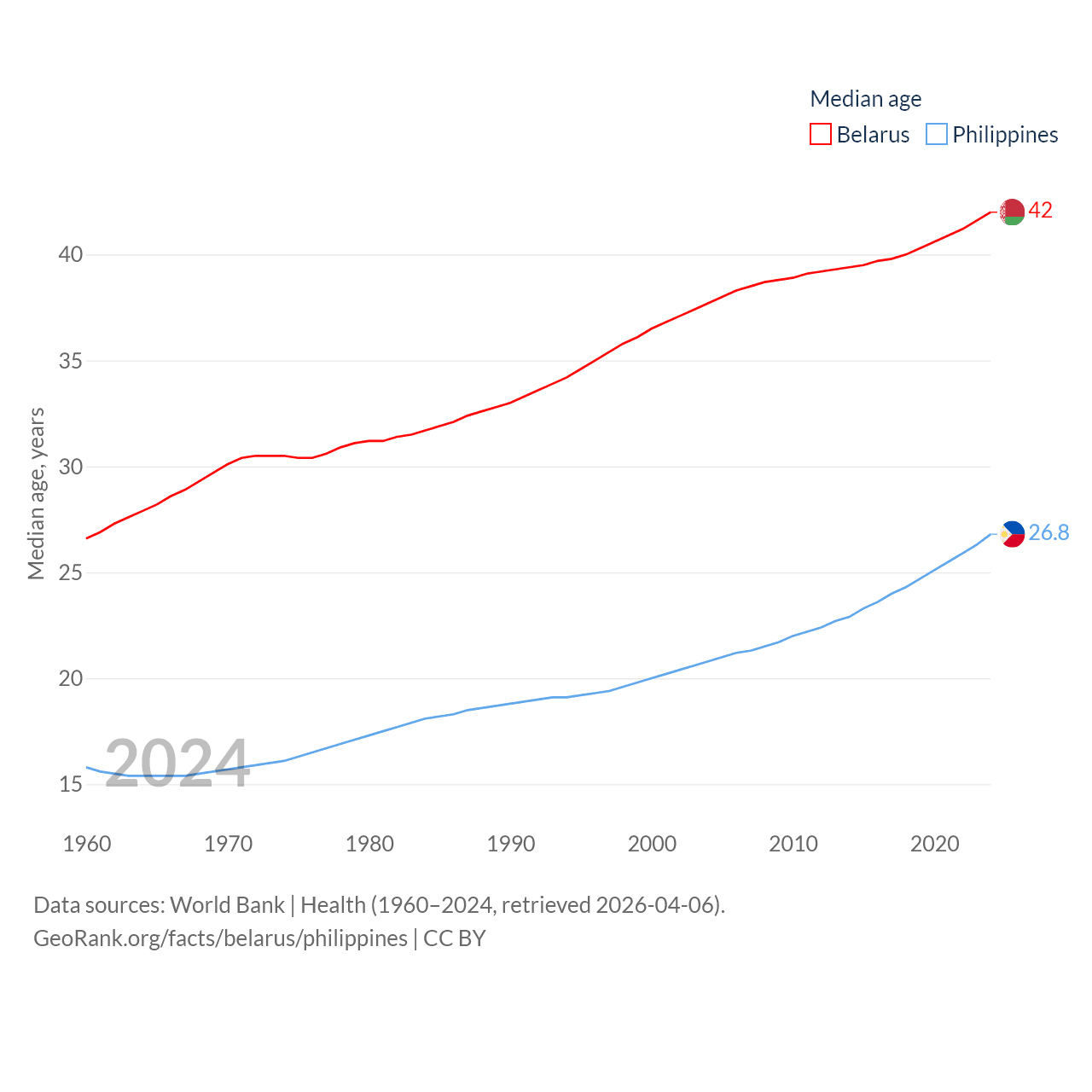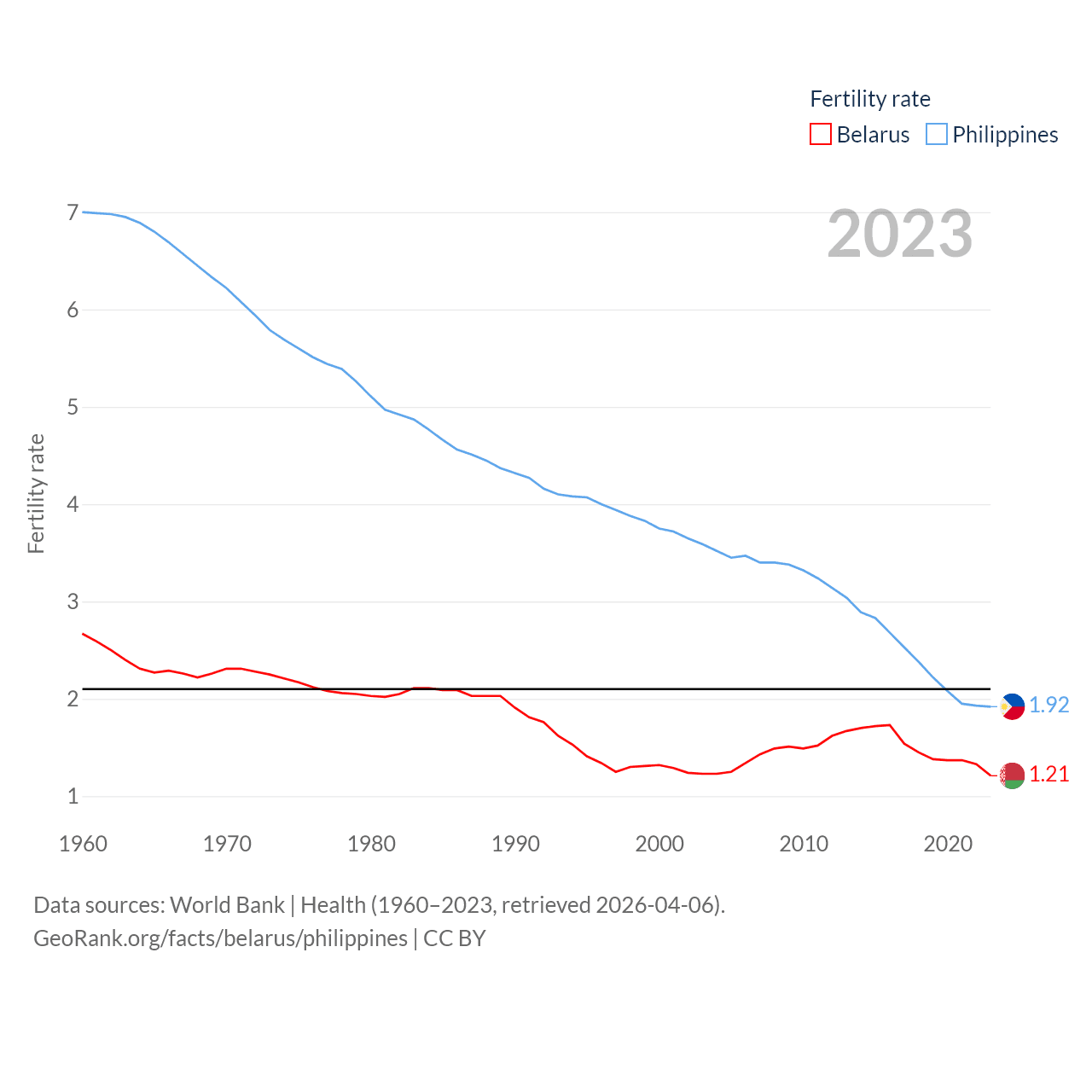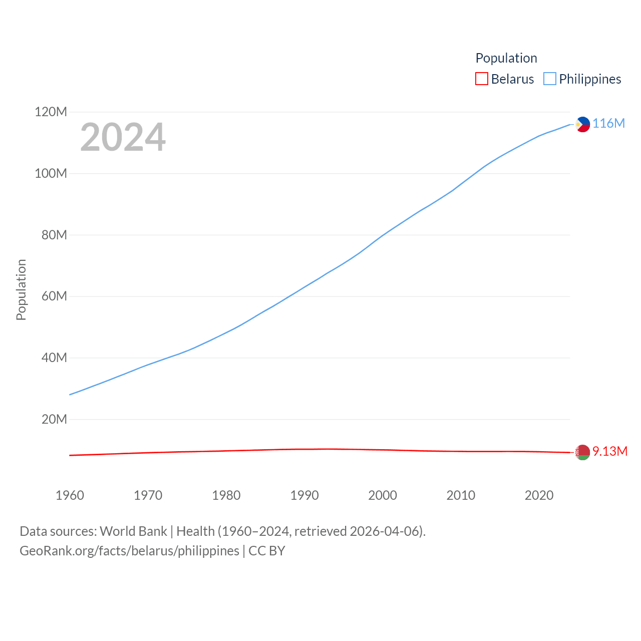 Belarus has a population of 9.13M (ranked 100/197), compared with 116M in The Philippines (ranked 14/197). Belarus' land area is 78,372 sq mi versus 115,124 sq mi for The Philippines (ranked 83rd vs. 71st).