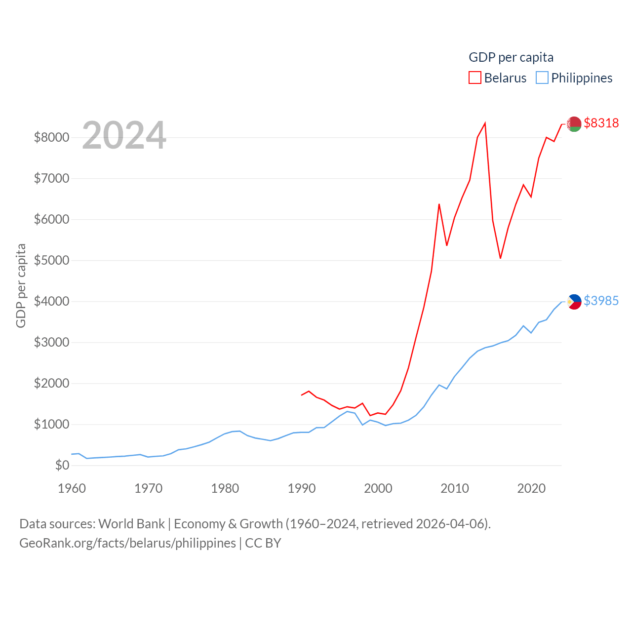 By GDP, Belarus ranks 83/197 ($76B) and The Philippines ranks 35/197 ($462B). By GDP per capita, Belarus ranks 92/197 ($8,318), while The Philippines ranks 130/197 ($3,985).