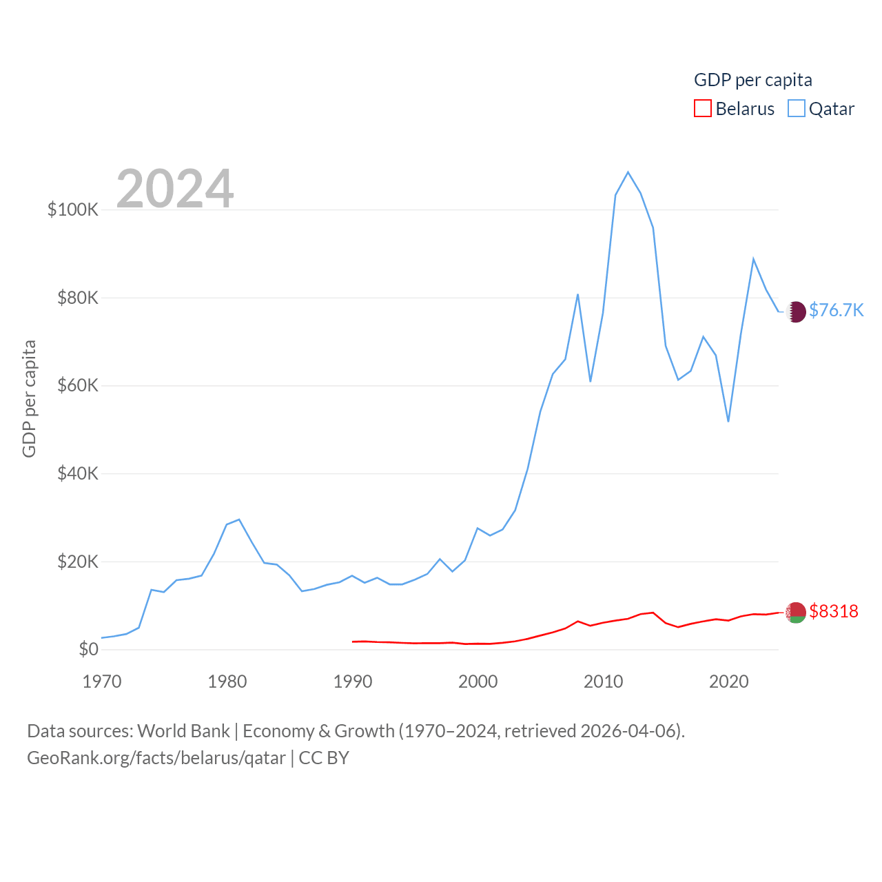 By GDP, Belarus ranks 83/197 ($76B) and Qatar ranks 56/197 ($219B). By GDP per capita, Belarus ranks 92/197 ($8,318), while Qatar ranks 11/197 ($76,689).