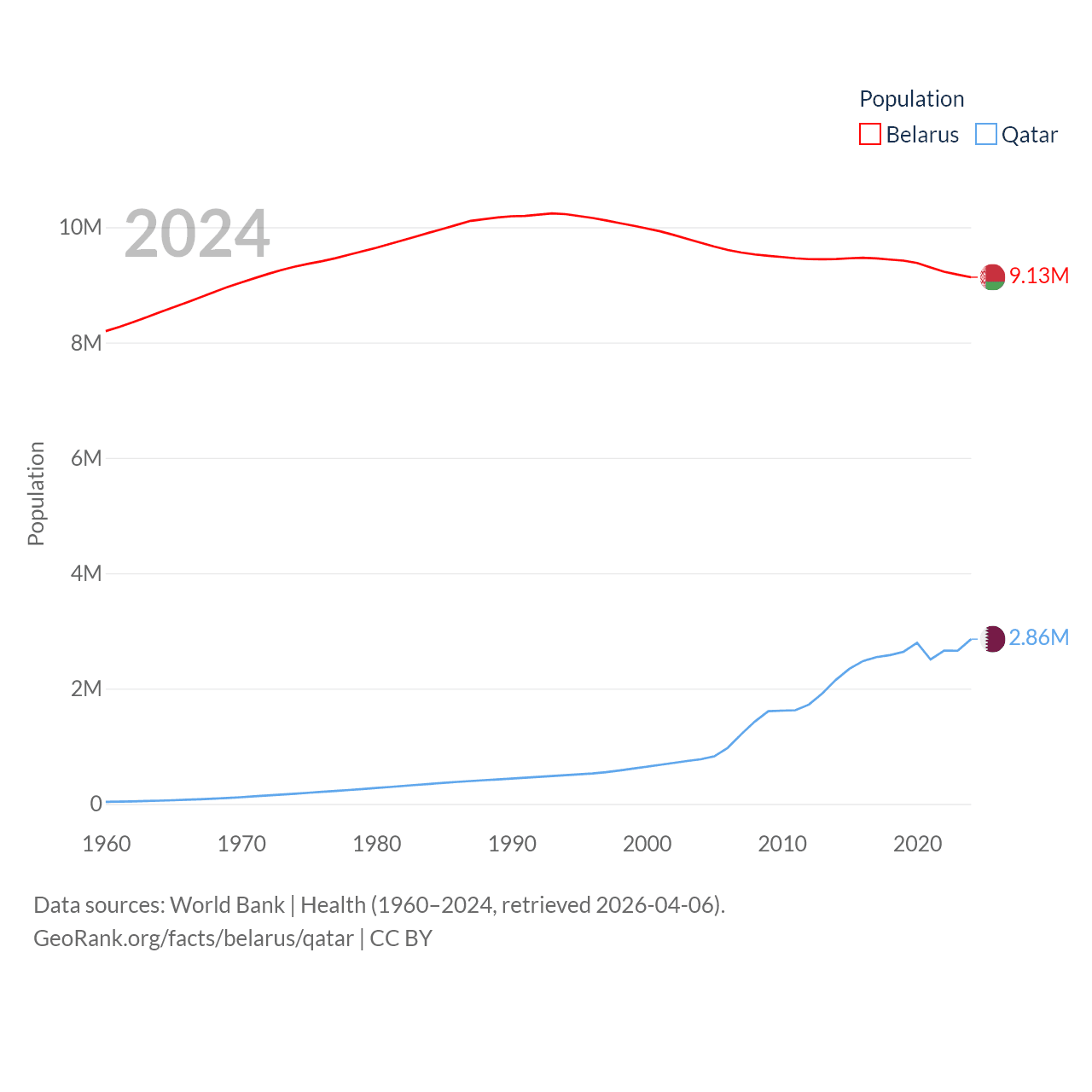 Belarus has a population of 9.13M (ranked 100/197), compared with 2.86M in Qatar (ranked 138/197). Belarus' land area is 78,372 sq mi versus 4,436 sq mi for Qatar (ranked 83rd vs. 158th).