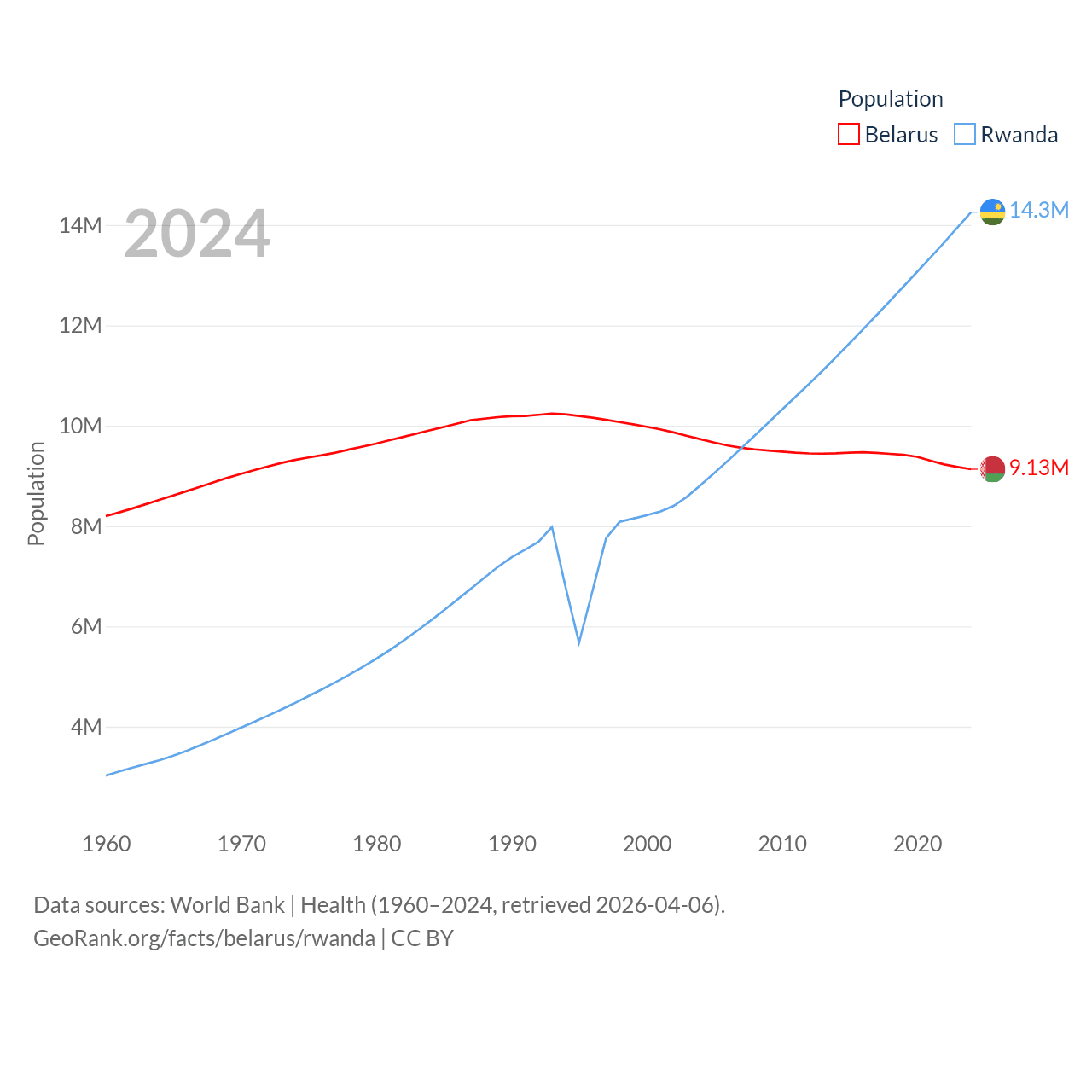 Belarus has a population of 9.13M (ranked 100/197), compared with 14.3M in Rwanda (ranked 77/197). Belarus' land area is 78,372 sq mi versus 9,525 sq mi for Rwanda (ranked 83rd vs. 146th).