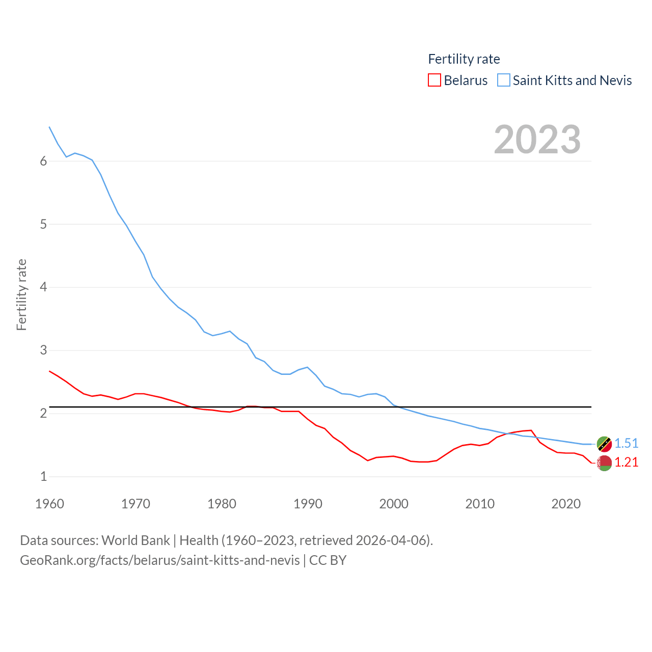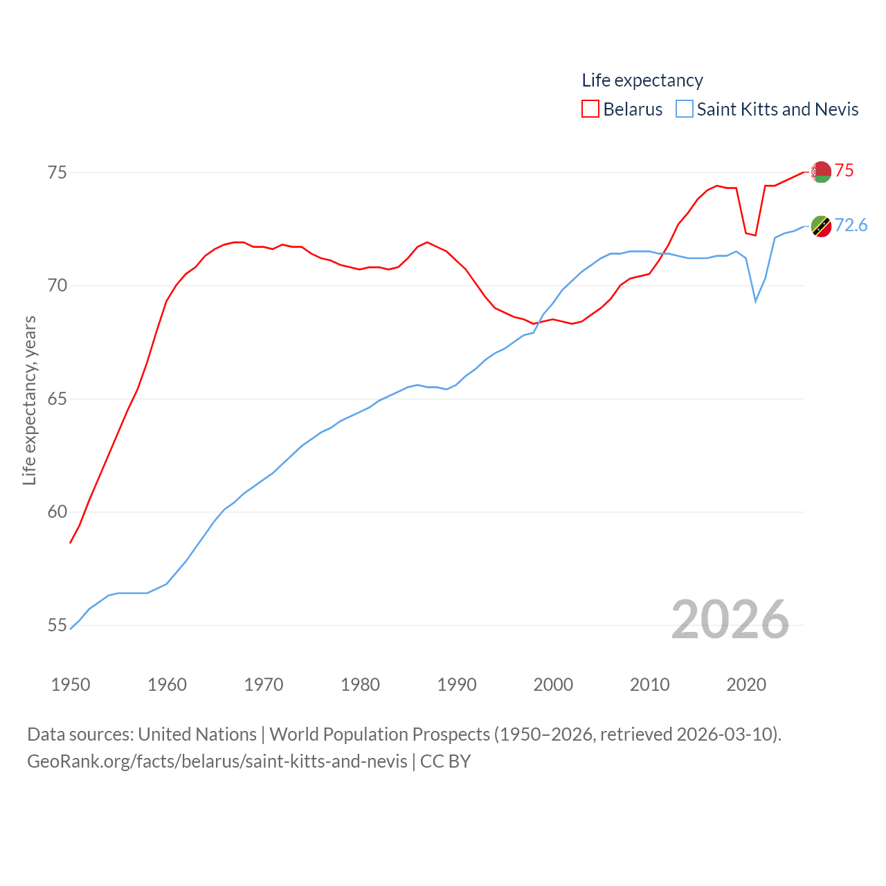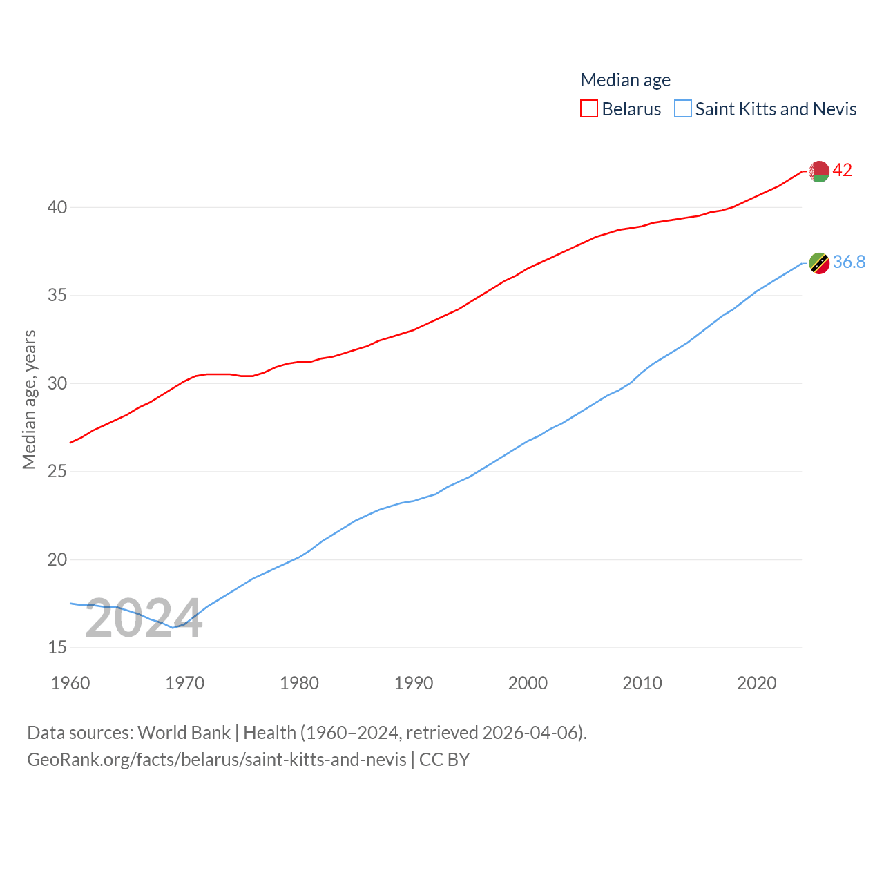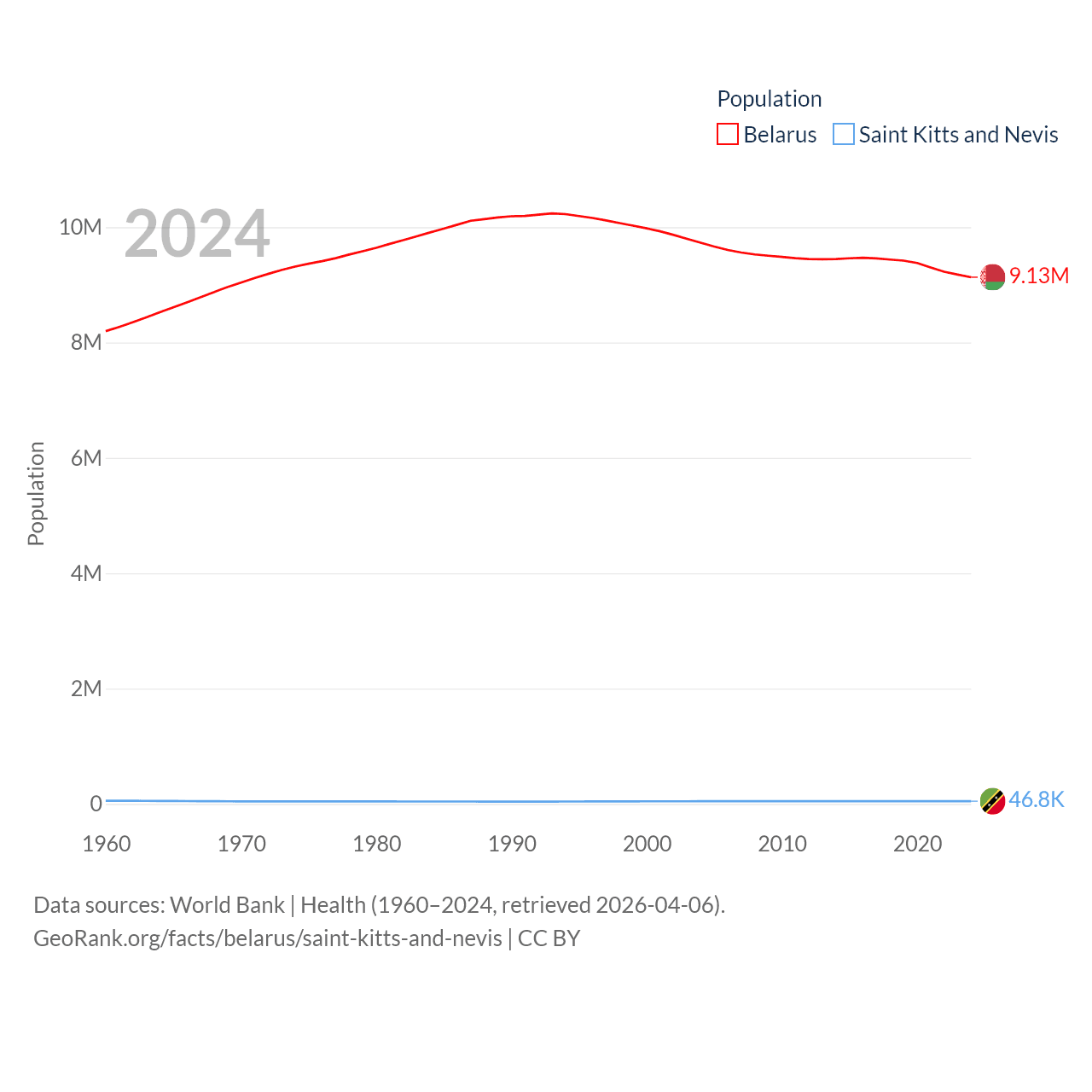 Belarus has a population of 9.13M (ranked 100/197), compared with 46.8K in Saint Kitts and Nevis (ranked 189/197). Belarus' land area is 78,372 sq mi versus 100.4 sq mi for Saint Kitts and Nevis (ranked 83rd vs. 189th).