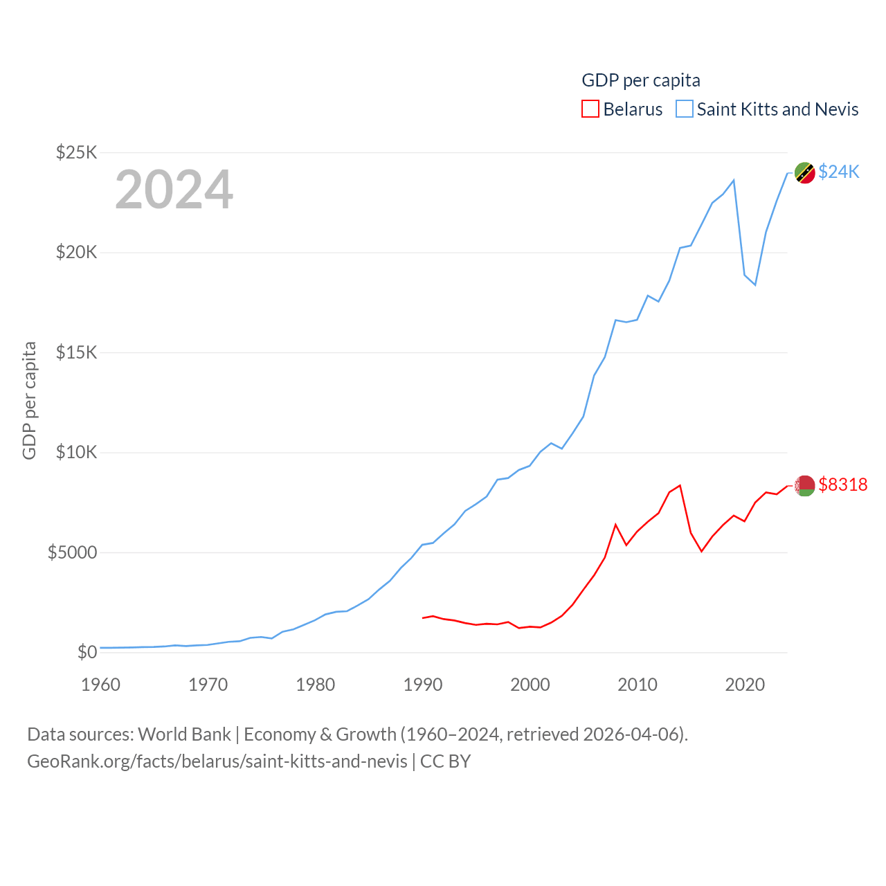 By GDP, Belarus ranks 83/197 ($76B) and Saint Kitts and Nevis ranks 187/197 ($1.12B). By GDP per capita, Belarus ranks 92/197 ($8,318), while Saint Kitts and Nevis ranks 51/197 ($23,961).
