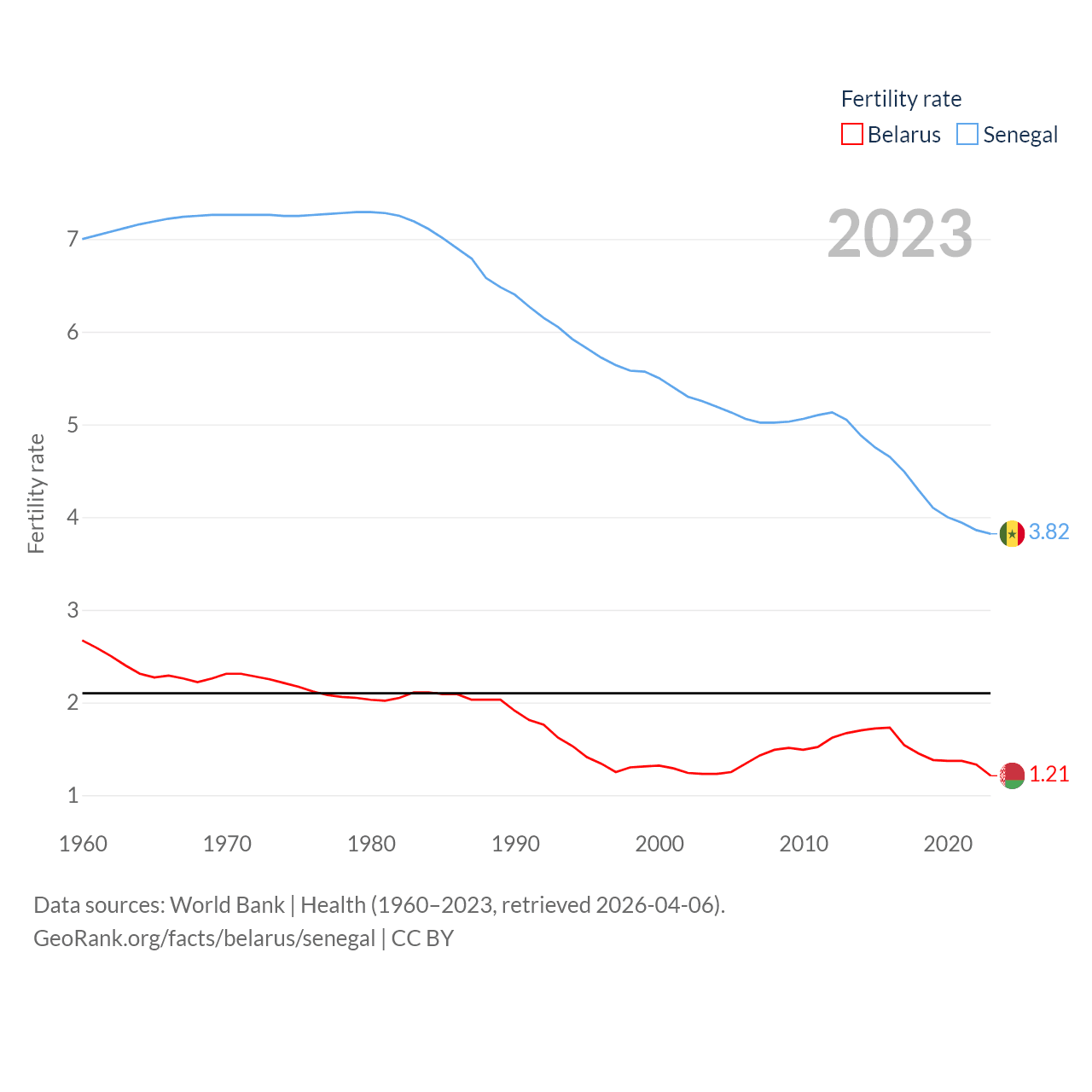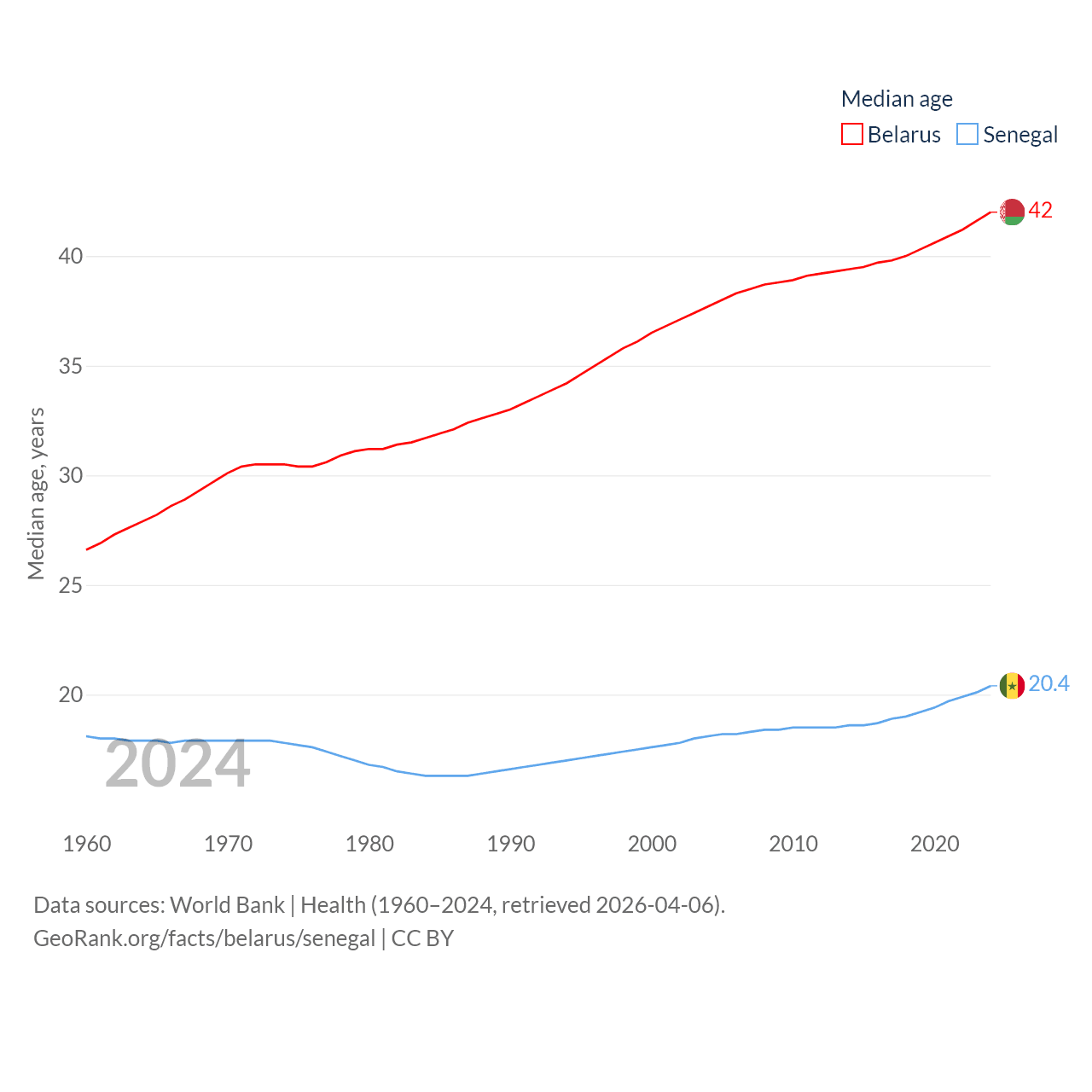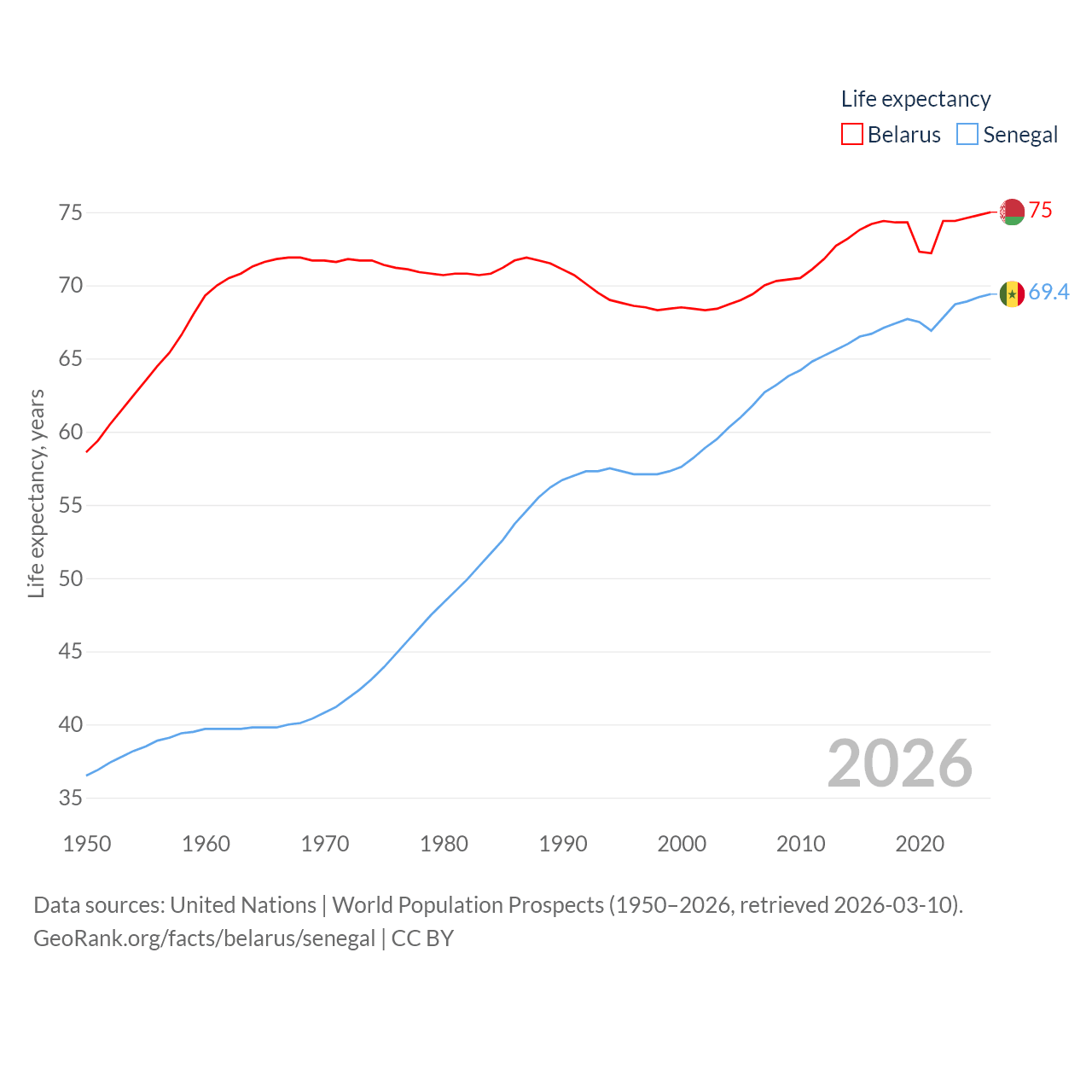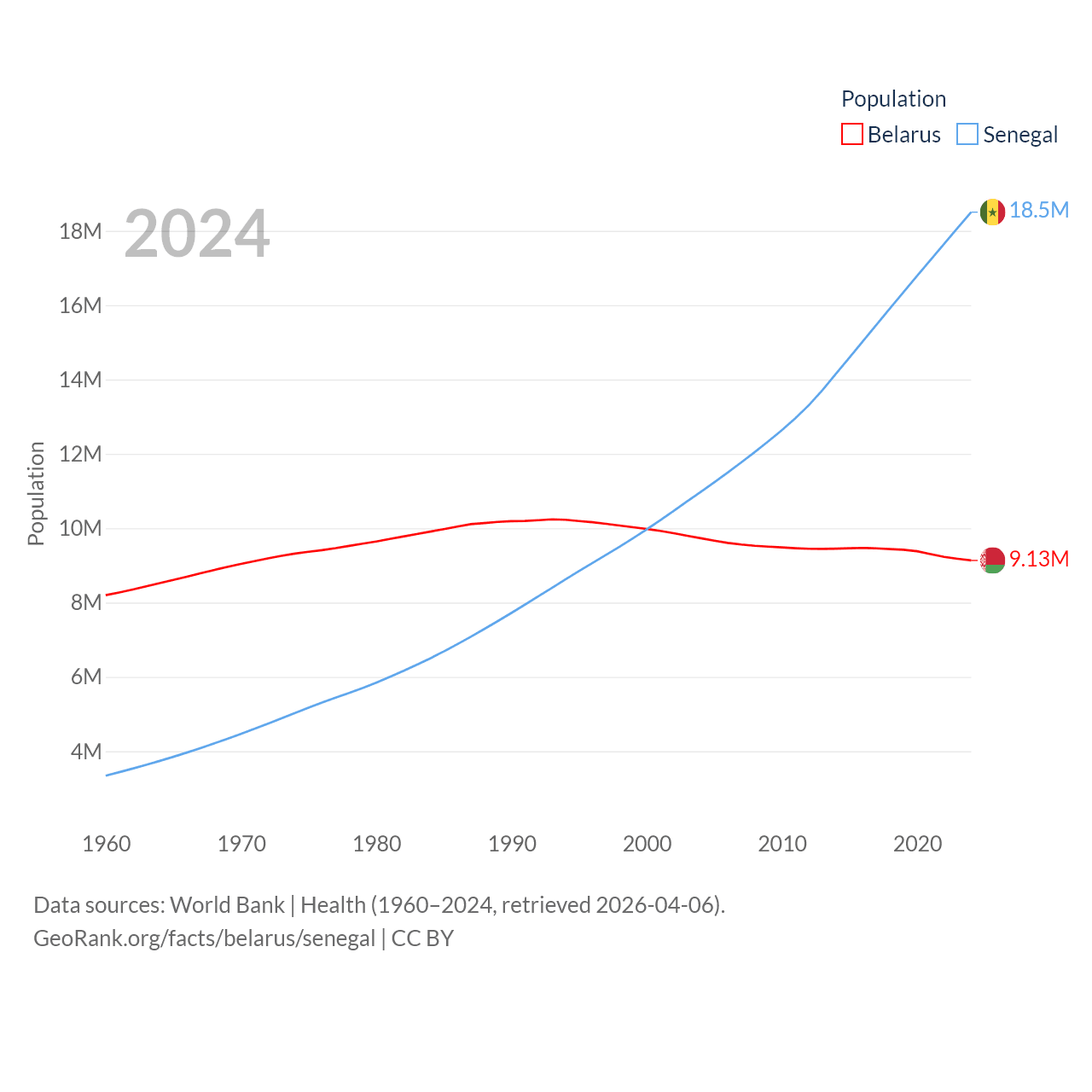 Belarus has a population of 9.13M (ranked 100/197), compared with 18.5M in Senegal (ranked 69/197). Belarus' land area is 78,372 sq mi versus 74,336 sq mi for Senegal (ranked 83rd vs. 85th).