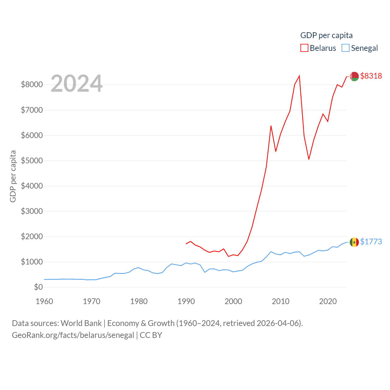 By GDP, Belarus ranks 83/197 ($76B) and Senegal ranks 109/197 ($32.8B). By GDP per capita, Belarus ranks 92/197 ($8,318), while Senegal ranks 159/197 ($1,773).