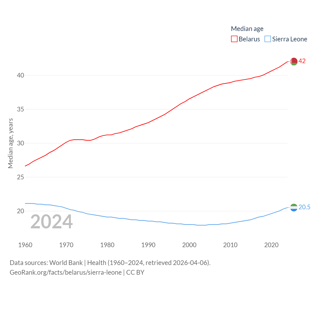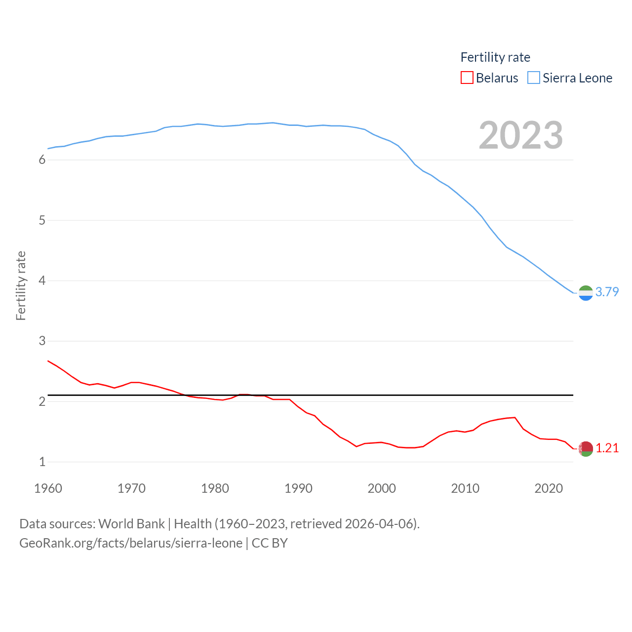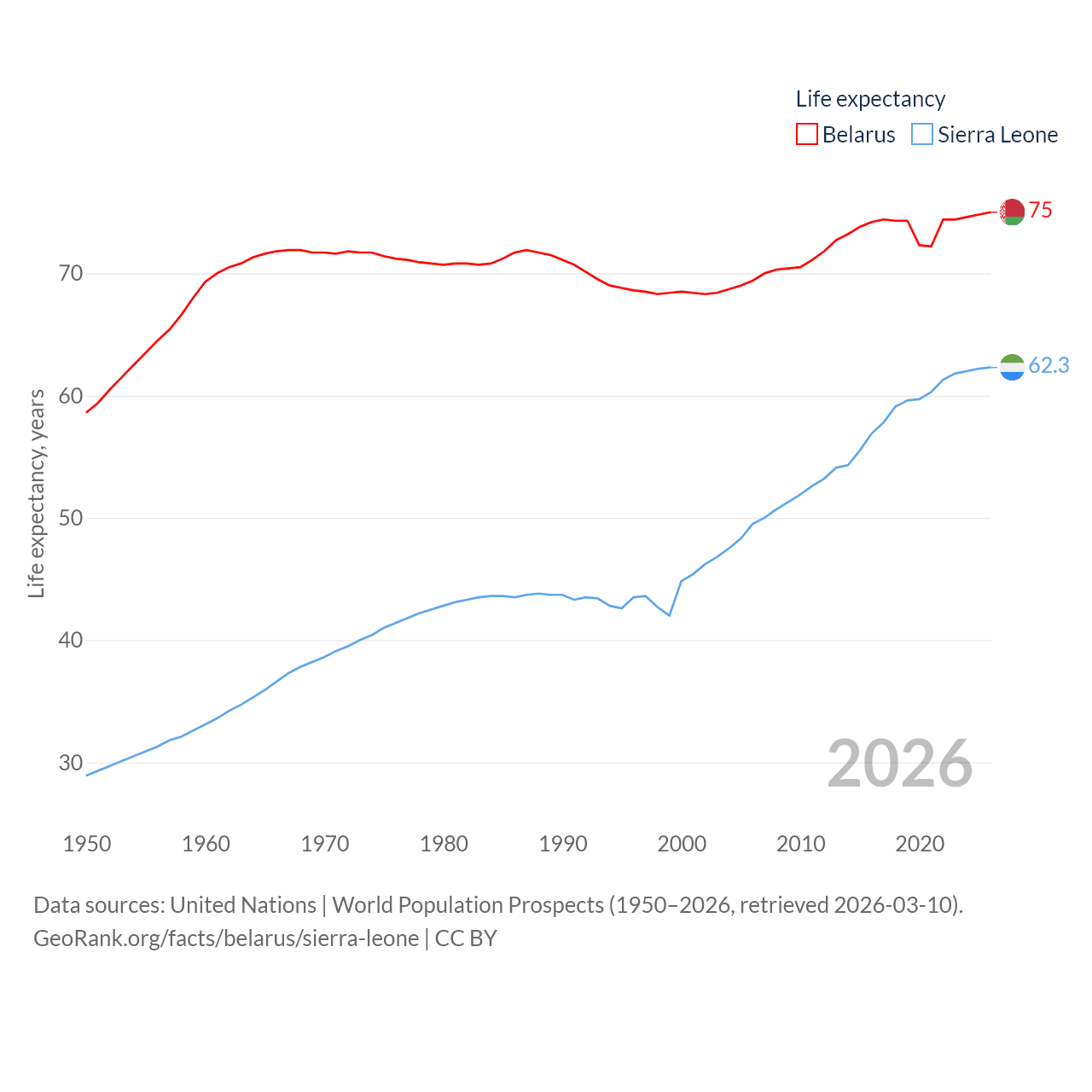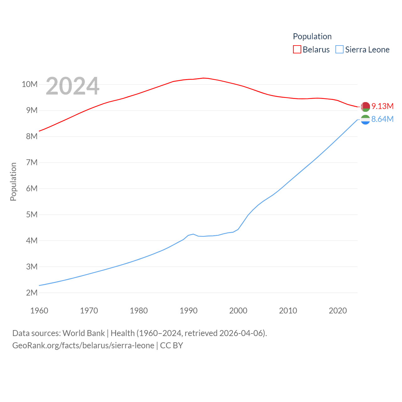 Belarus has a population of 9.13M (ranked 100/197), compared with 8.64M in Sierra Leone (ranked 102/197). Belarus' land area is 78,372 sq mi versus 27,869 sq mi for Sierra Leone (ranked 83rd vs. 116th).