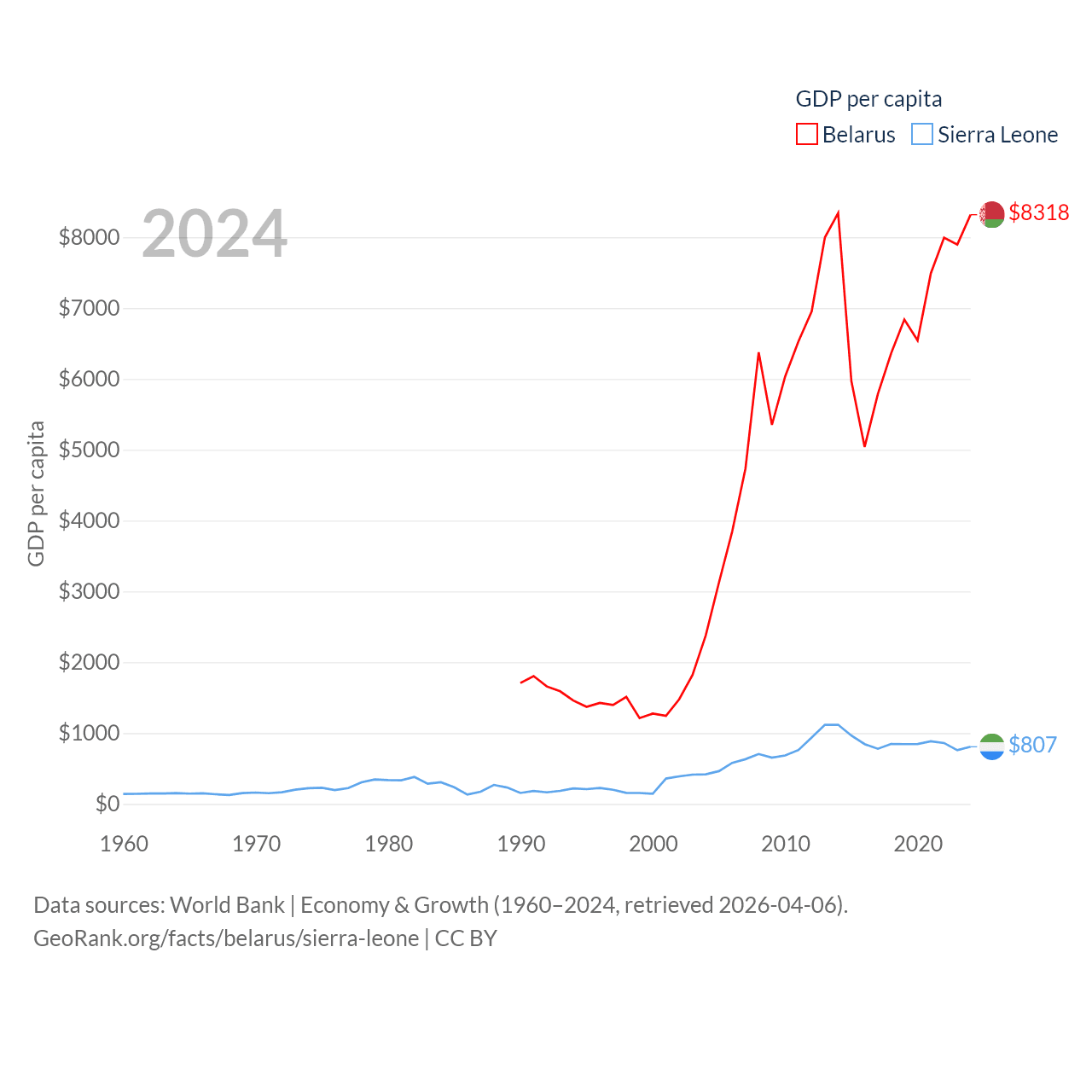 By GDP, Belarus ranks 83/197 ($76B) and Sierra Leone ranks 160/197 ($6.97B). By GDP per capita, Belarus ranks 92/197 ($8,318), while Sierra Leone ranks 186/197 ($807).