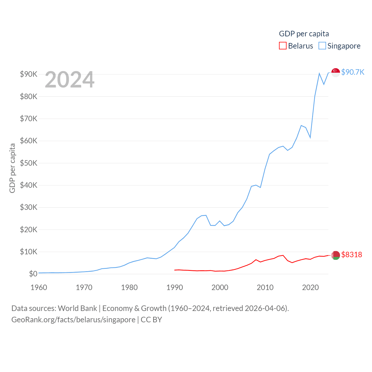 By GDP, Belarus ranks 83/197 ($76B) and Singapore ranks 28/197 ($547B). By GDP per capita, Belarus ranks 92/197 ($8,318), while Singapore ranks 7/197 ($90,674).
