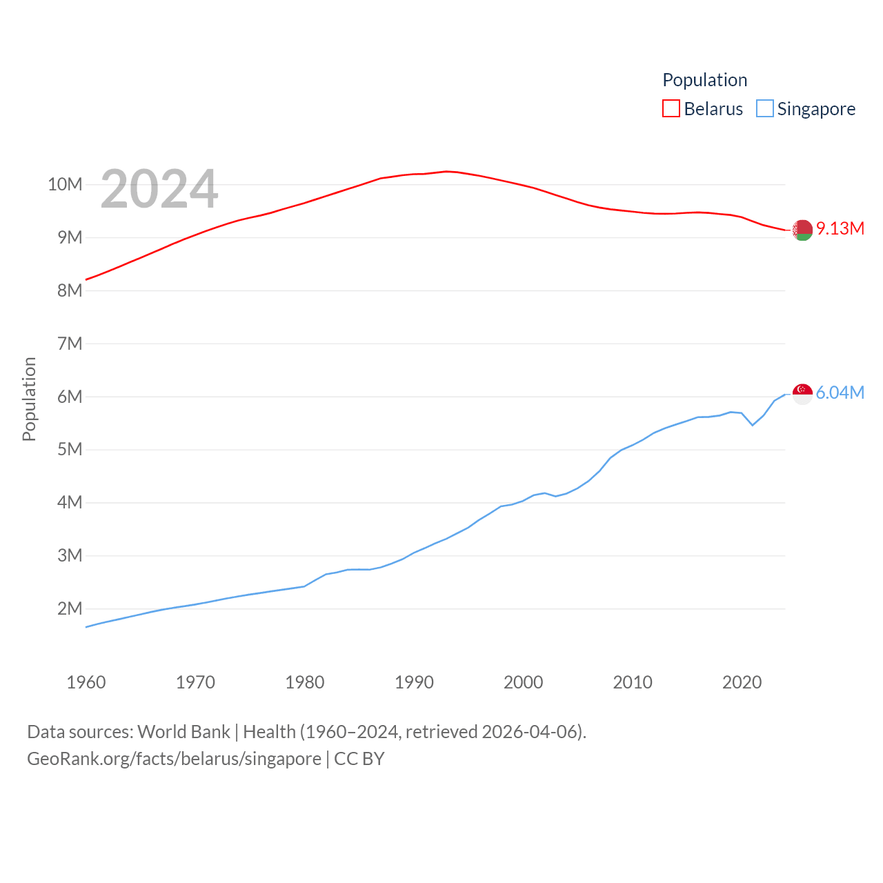 Belarus has a population of 9.13M (ranked 100/197), compared with 6.04M in Singapore (ranked 113/197). Belarus' land area is 78,372 sq mi versus 277.2 sq mi for Singapore (ranked 83rd vs. 177th).