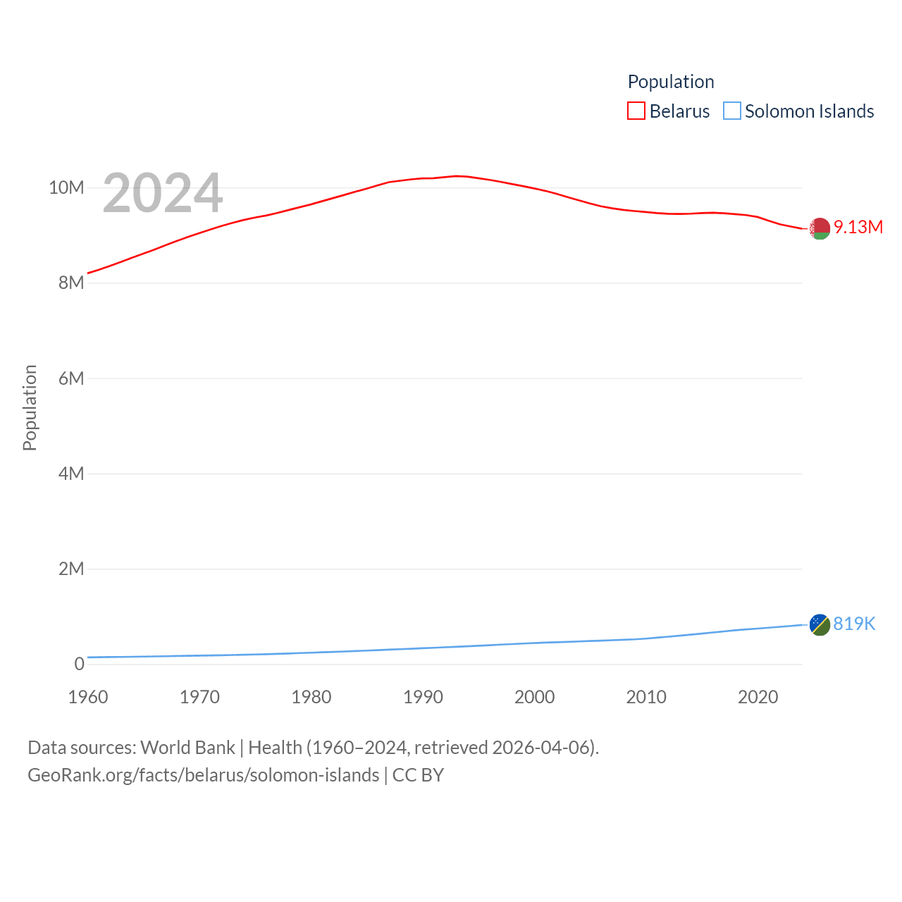 Belarus has a population of 9.13M (ranked 100/197), compared with 819K in The Solomon Islands (ranked 162/197). Belarus' land area is 78,372 sq mi versus 10,807 sq mi for The Solomon Islands (ranked 83rd vs. 141st).
