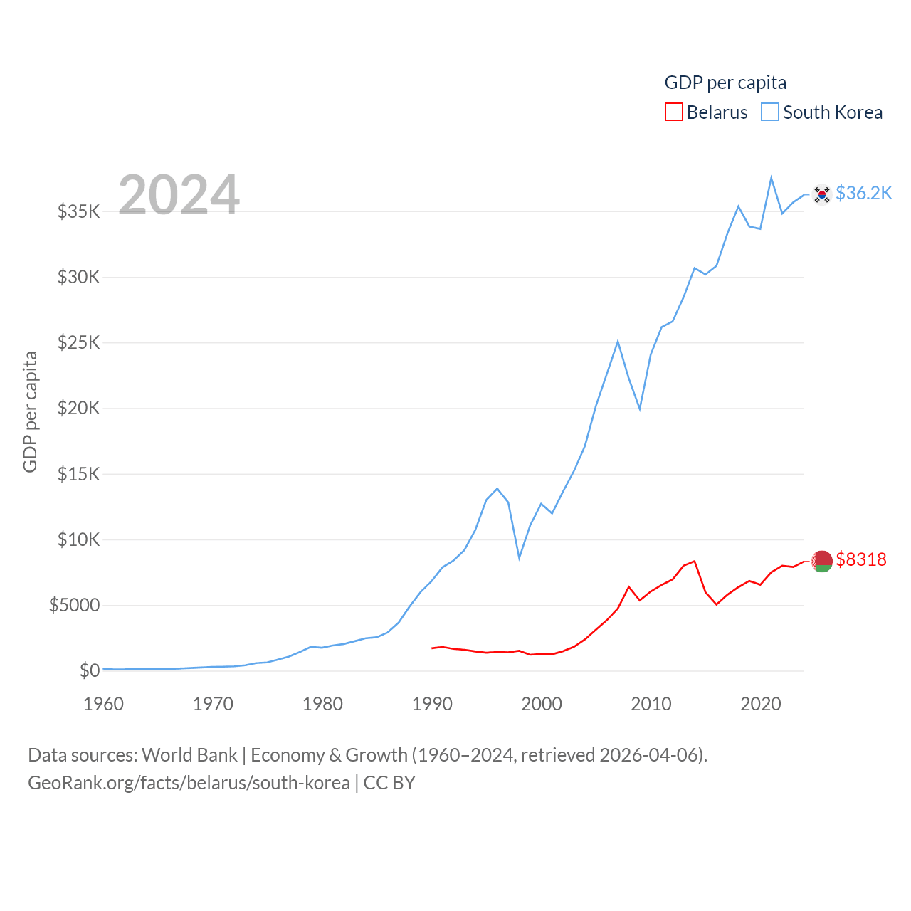By GDP, Belarus ranks 83/197 ($76B) and South Korea ranks 12/197 ($1.88T). By GDP per capita, Belarus ranks 92/197 ($8,318), while South Korea ranks 31/197 ($36,239).