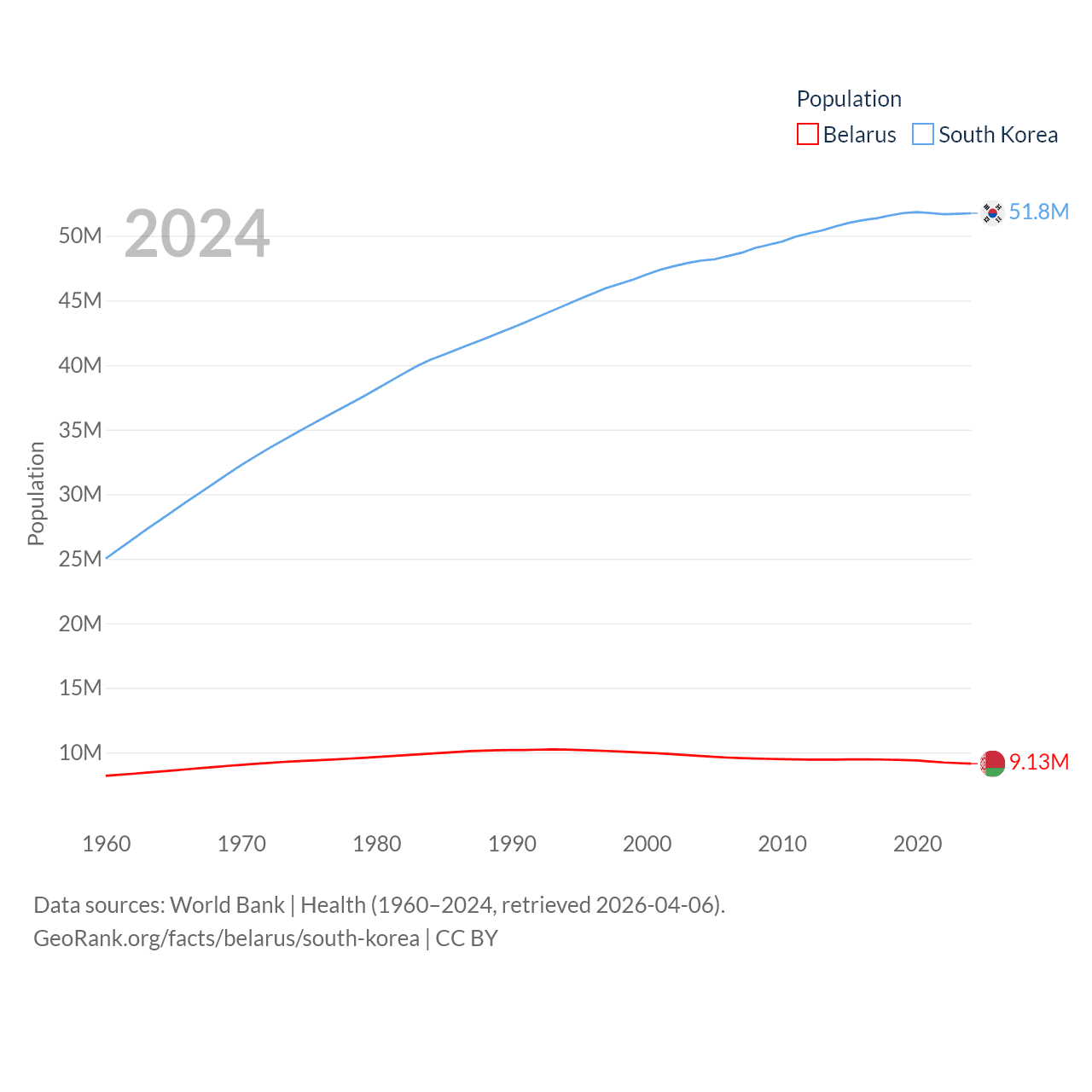 Belarus has a population of 9.13M (ranked 100/197), compared with 51.8M in South Korea (ranked 29/197). Belarus' land area is 78,372 sq mi versus 37,684 sq mi for South Korea (ranked 83rd vs. 105th).