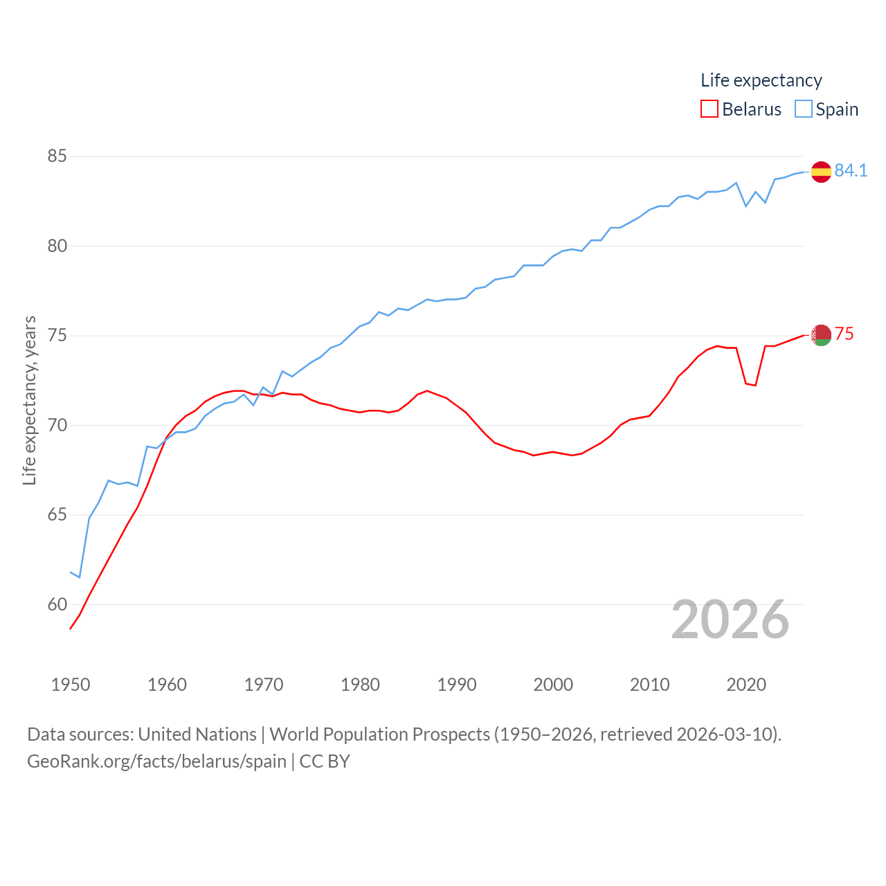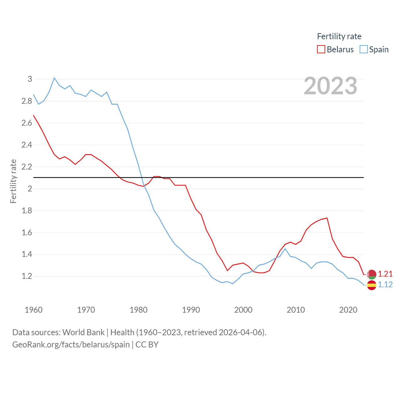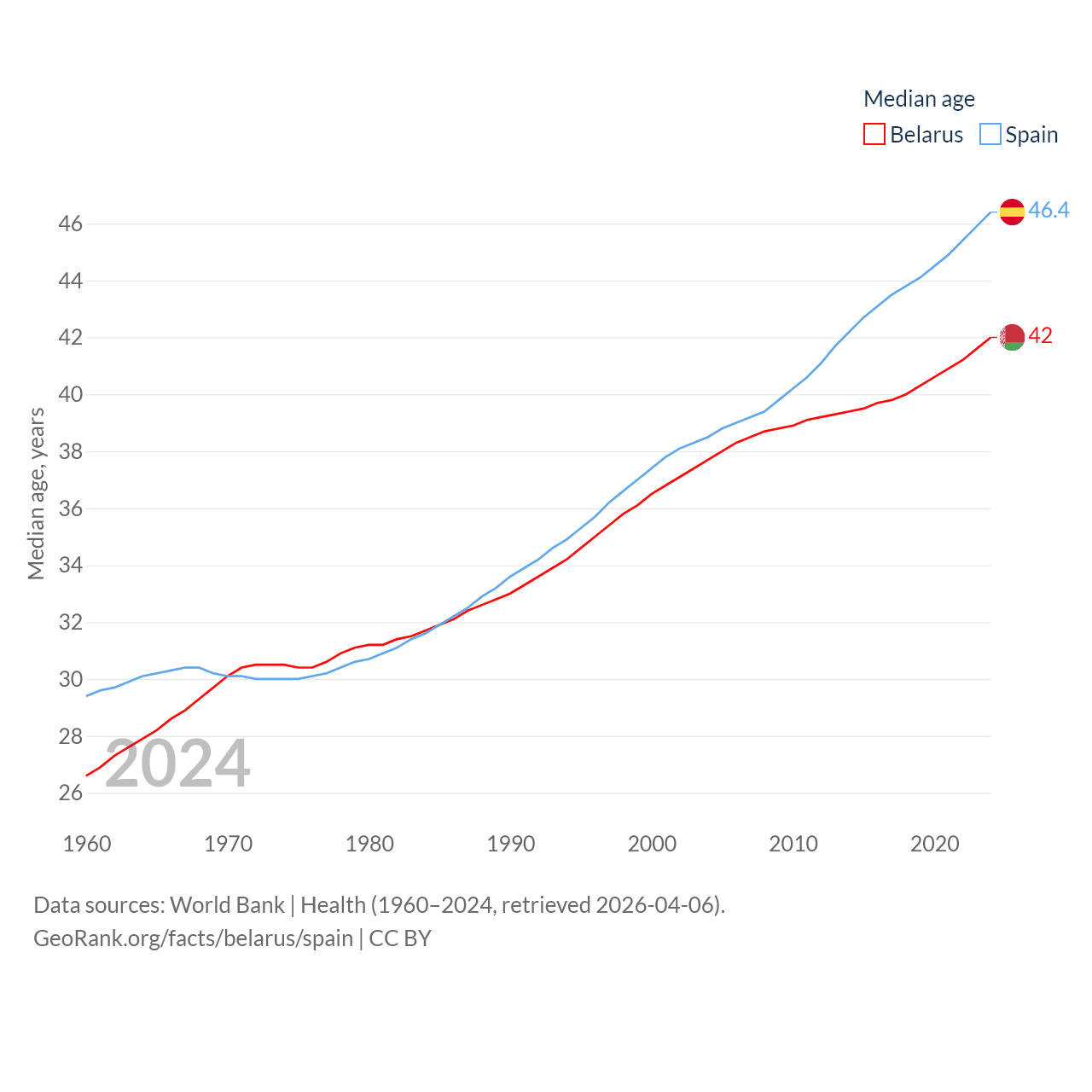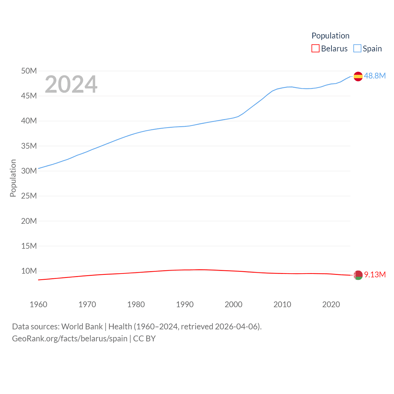 Belarus has a population of 9.13M (ranked 100/197), compared with 48.8M in Spain (ranked 32/197). Belarus' land area is 78,372 sq mi versus 192,934 sq mi for Spain (ranked 83rd vs. 51st).