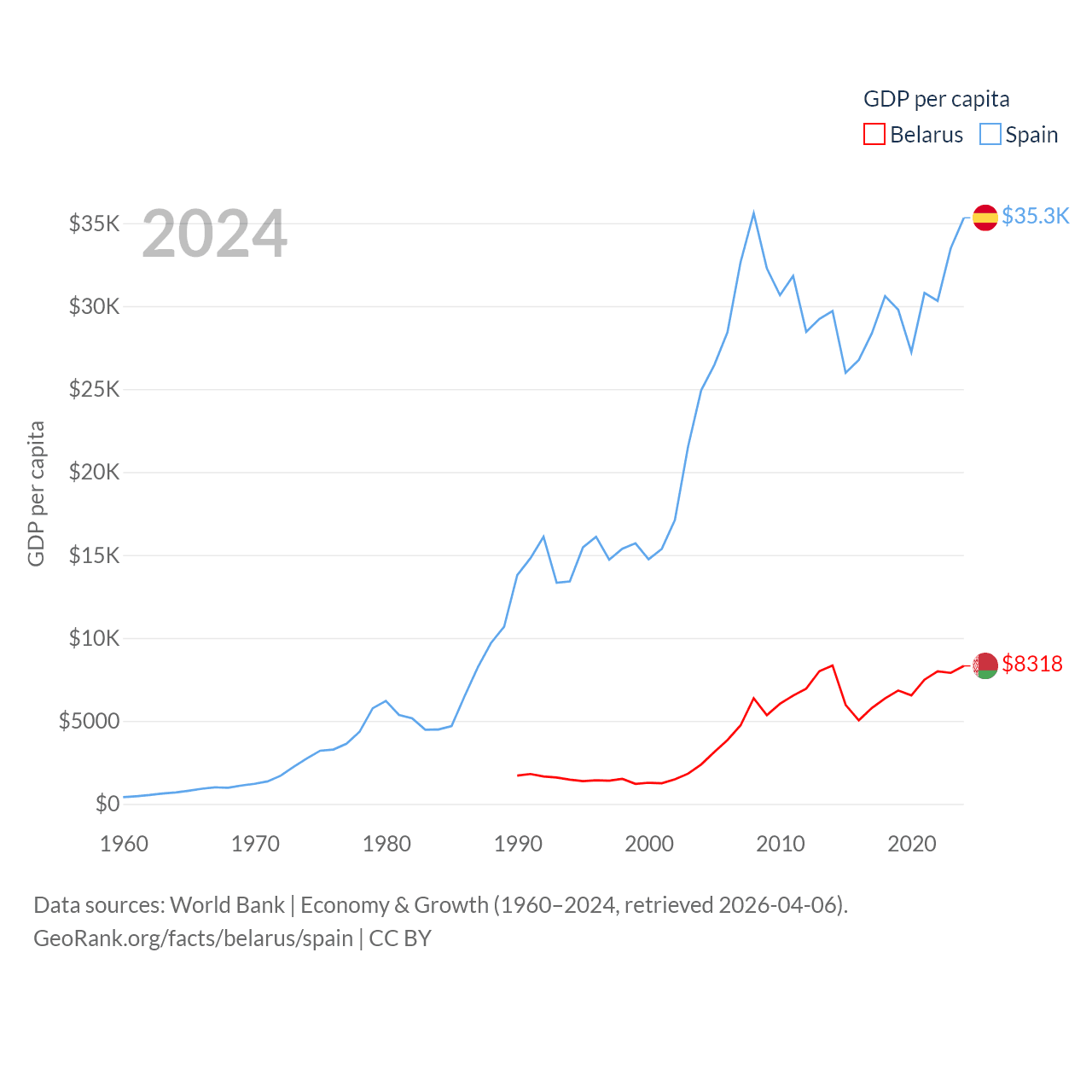 By GDP, Belarus ranks 83/197 ($76B) and Spain ranks 15/197 ($1.73T). By GDP per capita, Belarus ranks 92/197 ($8,318), while Spain ranks 32/197 ($35,327).
