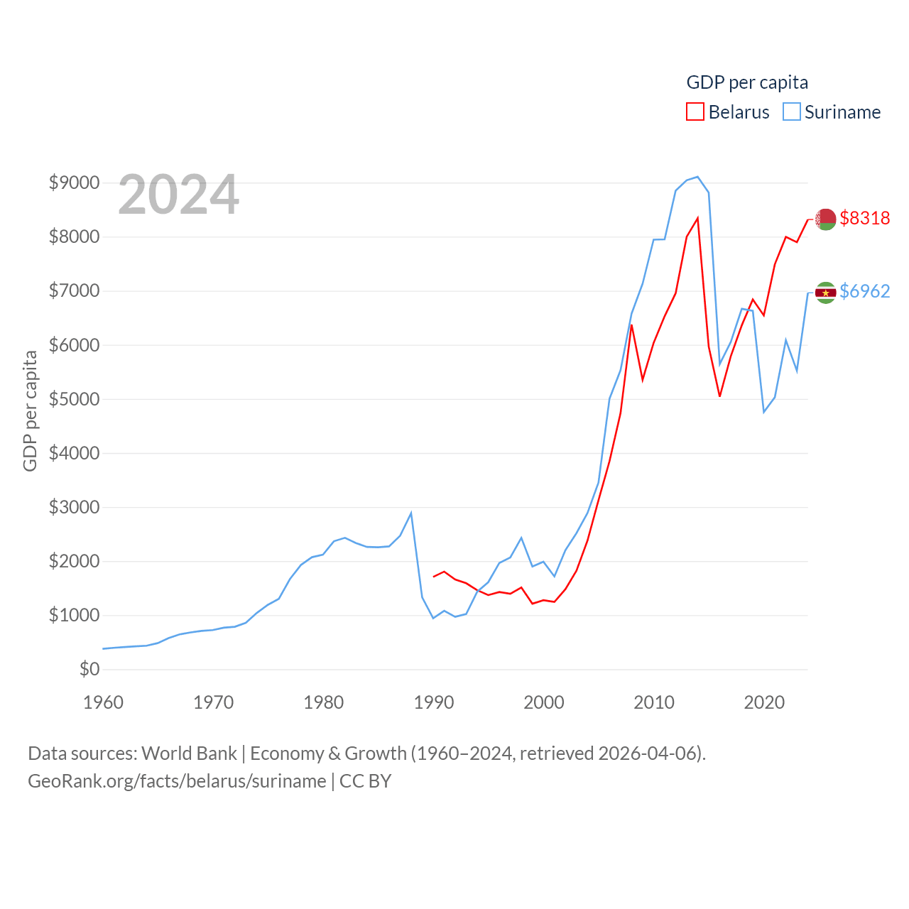 By GDP, Belarus ranks 83/197 ($76B) and Suriname ranks 164/197 ($4.42B). By GDP per capita, Belarus ranks 92/197 ($8,318), while Suriname ranks 102/197 ($6,962).