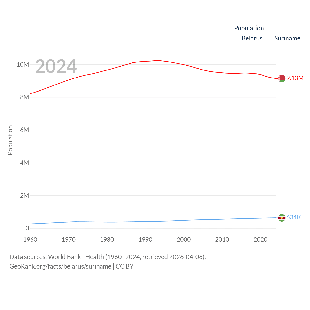 Belarus has a population of 9.13M (ranked 100/197), compared with 634K in Suriname (ranked 165/197). Belarus' land area is 78,372 sq mi versus 61,972 sq mi for Suriname (ranked 83rd vs. 90th).