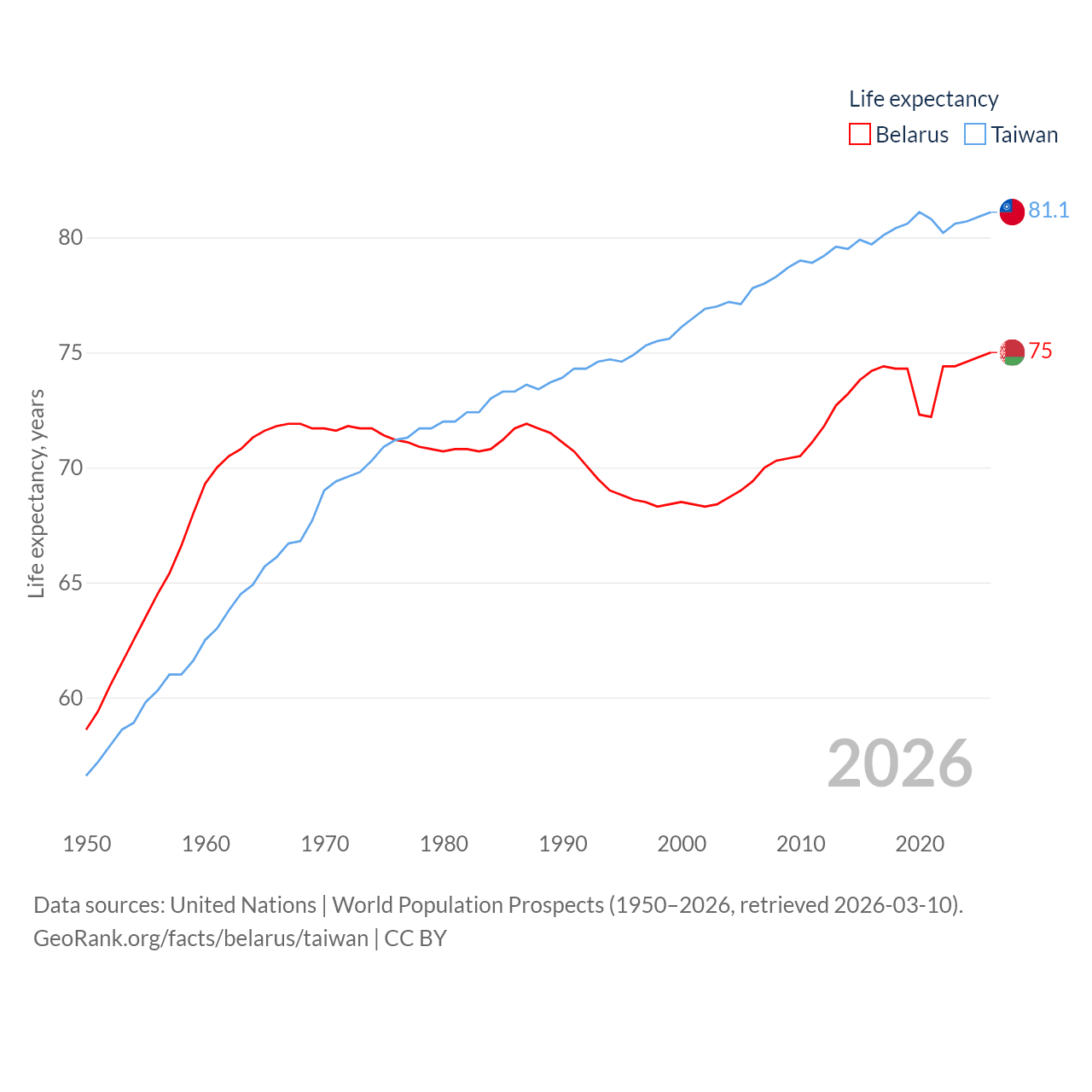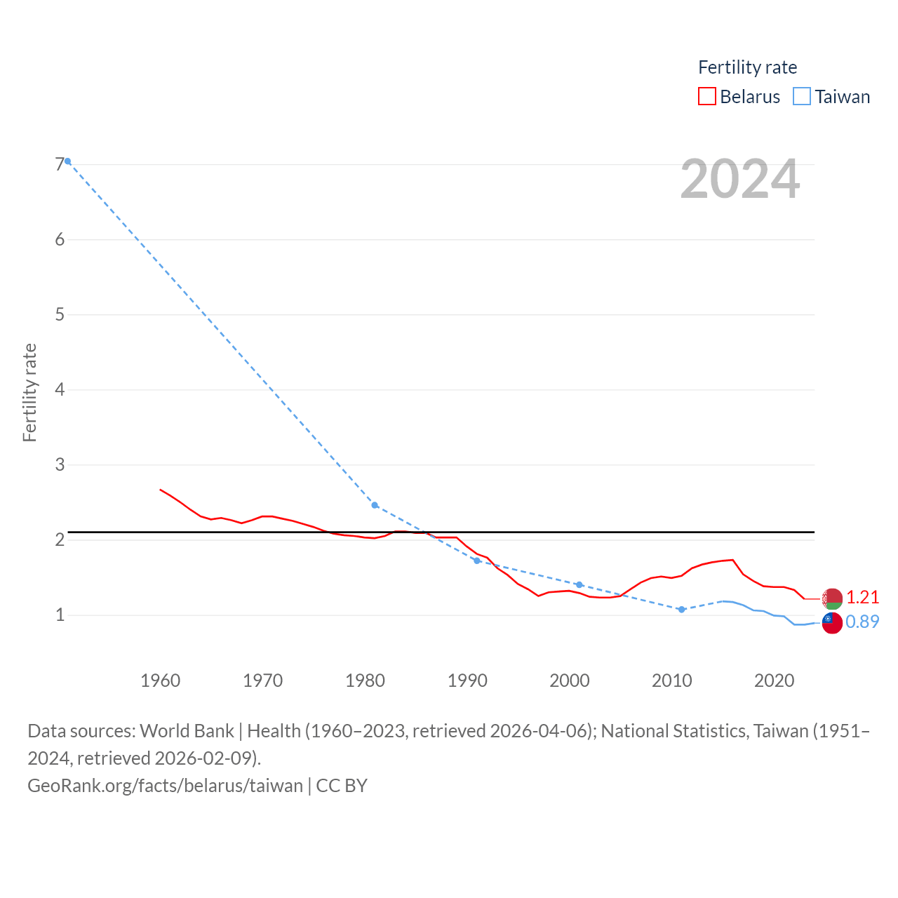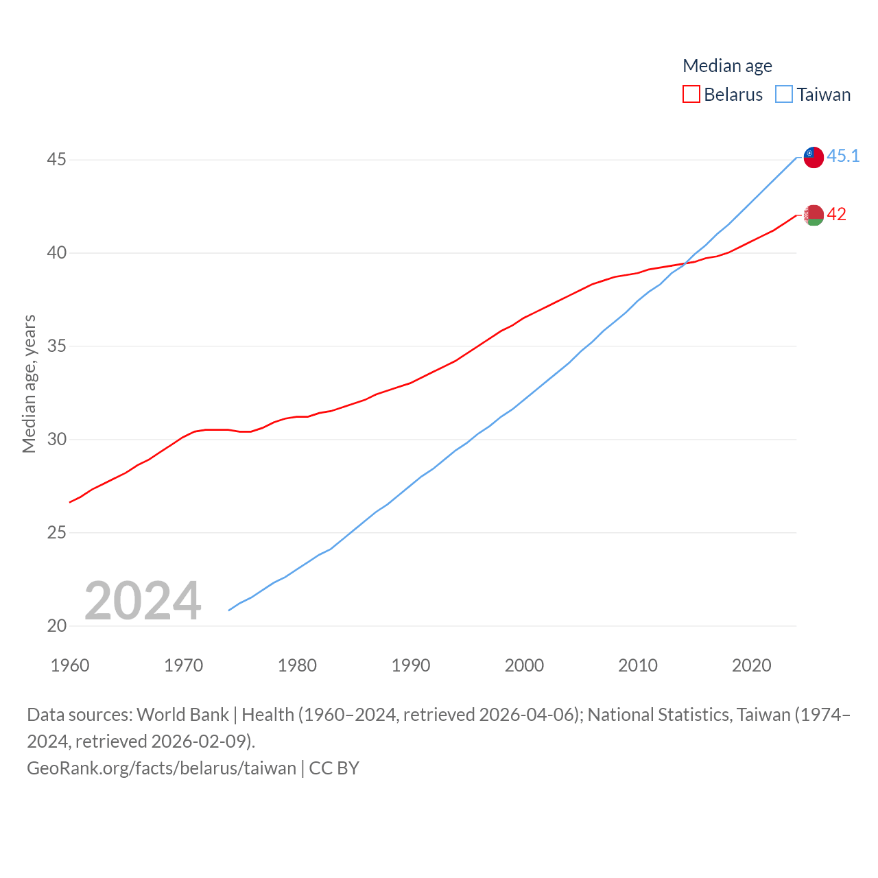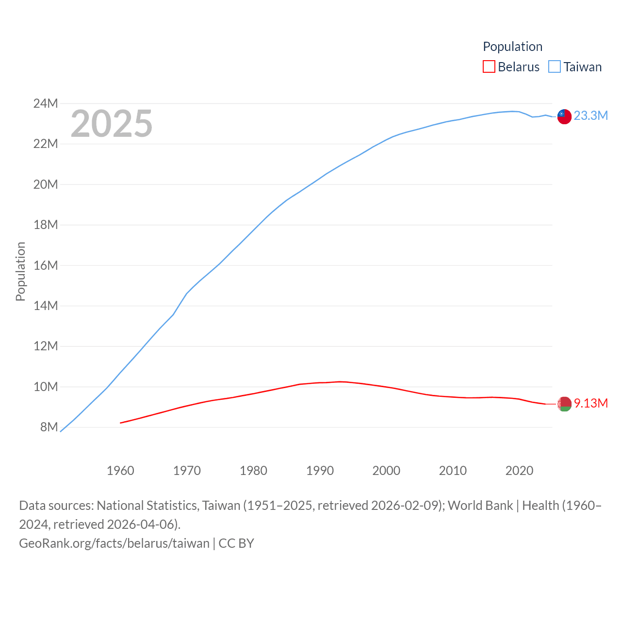 Belarus has a population of 9.13M (ranked 100/197), compared with 23.3M in Taiwan (ranked 60/197). Belarus' land area is 78,372 sq mi versus 13,976 sq mi for Taiwan (ranked 83rd vs. 133rd).