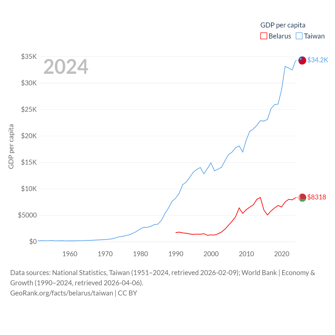By GDP, Belarus ranks 83/197 ($76B) and Taiwan ranks 22/197 ($802B). By GDP per capita, Belarus ranks 92/197 ($8,318), while Taiwan ranks 35/197 ($34,238).