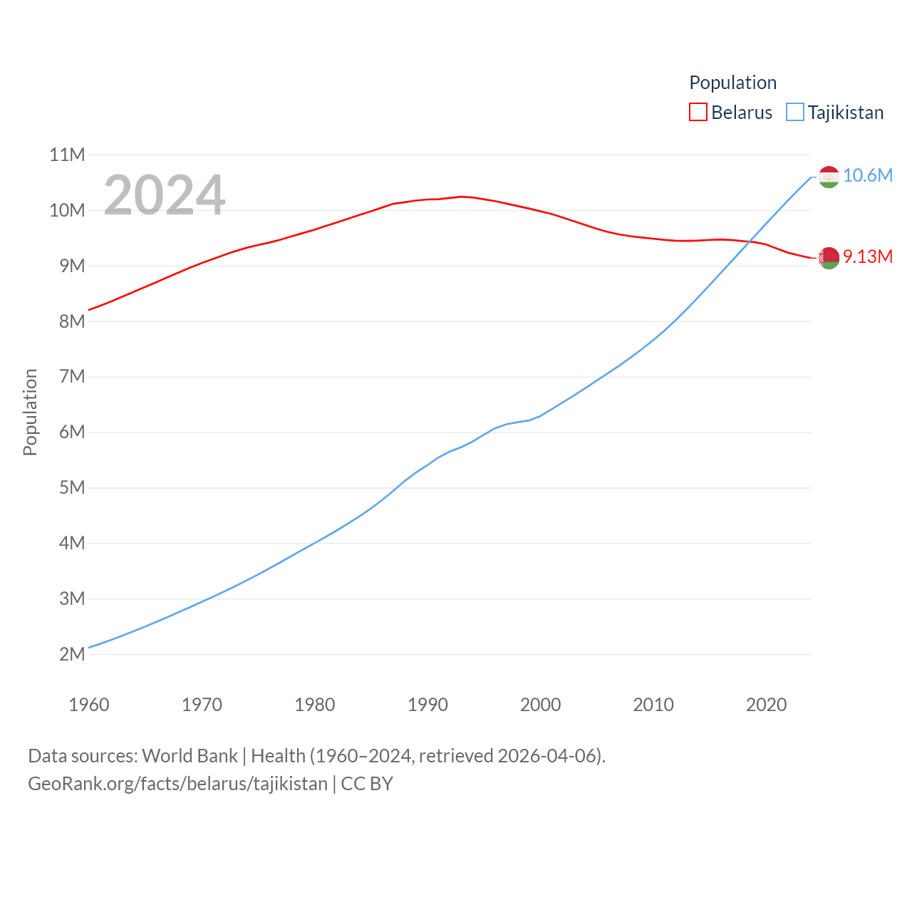 Belarus has a population of 9.13M (ranked 100/197), compared with 10.6M in Tajikistan (ranked 91/197). Belarus' land area is 78,372 sq mi versus 53,587 sq mi for Tajikistan (ranked 83rd vs. 93rd).
