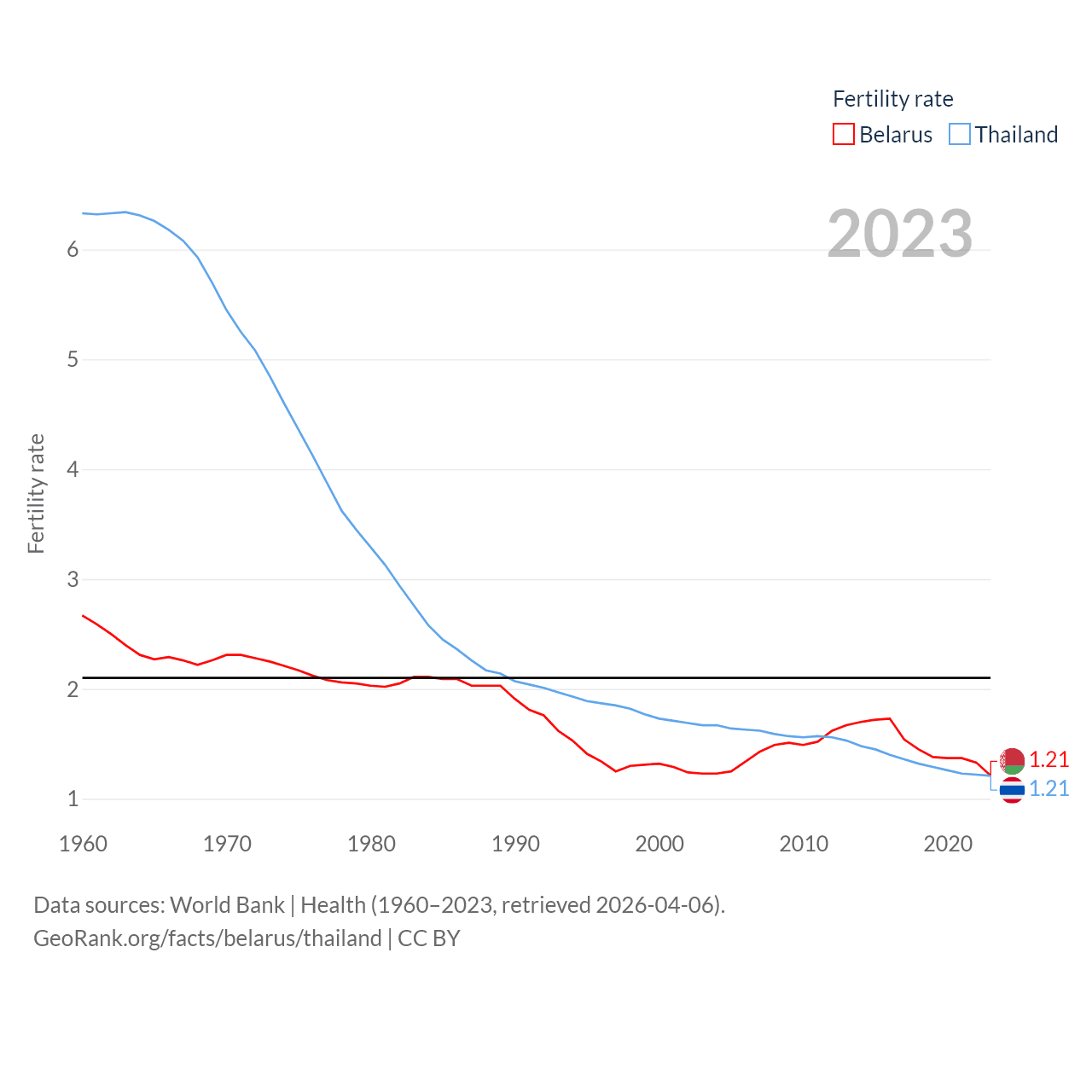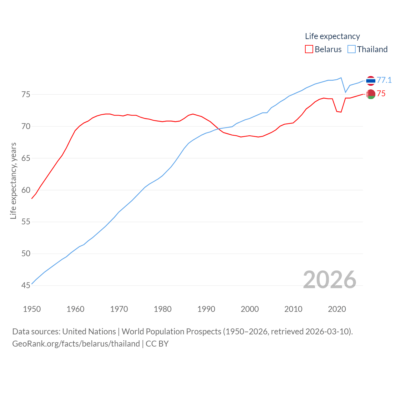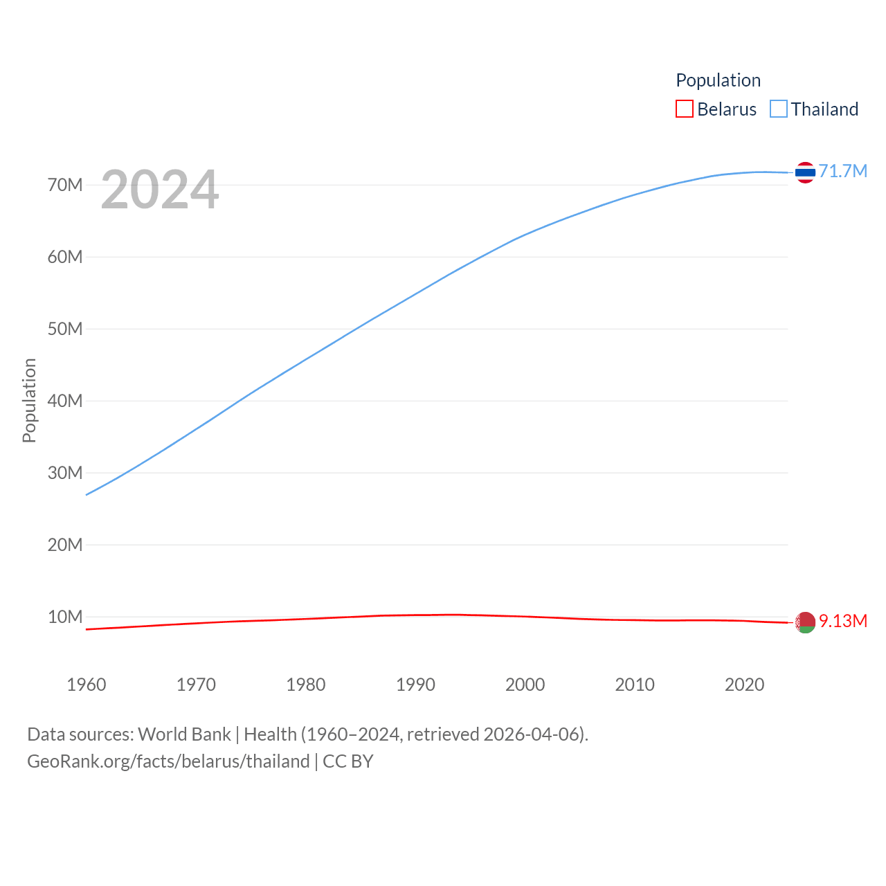 Belarus has a population of 9.13M (ranked 100/197), compared with 71.7M in Thailand (ranked 20/197). Belarus' land area is 78,372 sq mi versus 197,256 sq mi for Thailand (ranked 83rd vs. 50th).