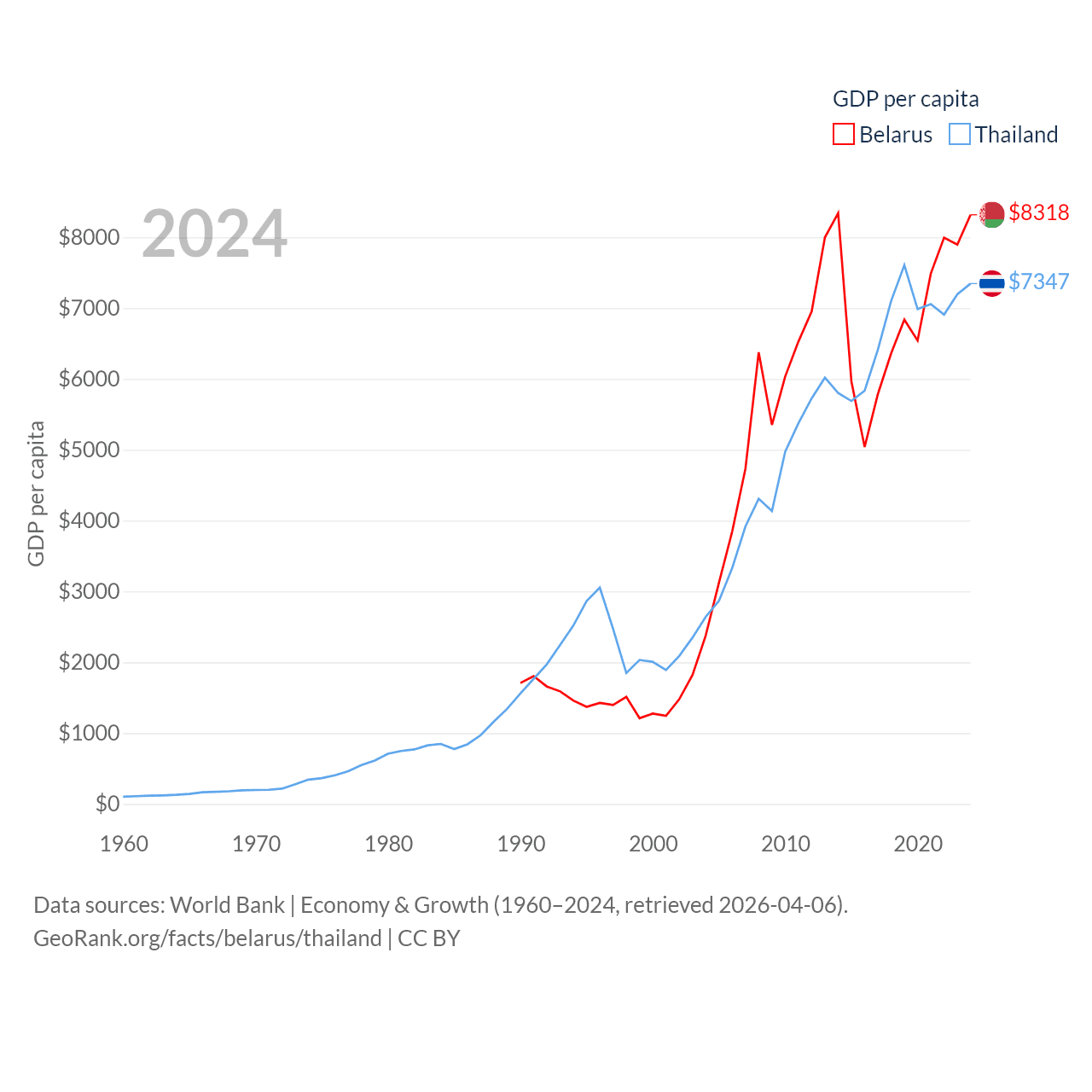 By GDP, Belarus ranks 83/197 ($76B) and Thailand ranks 31/197 ($527B). By GDP per capita, Belarus ranks 92/197 ($8,318), while Thailand ranks 100/197 ($7,347).