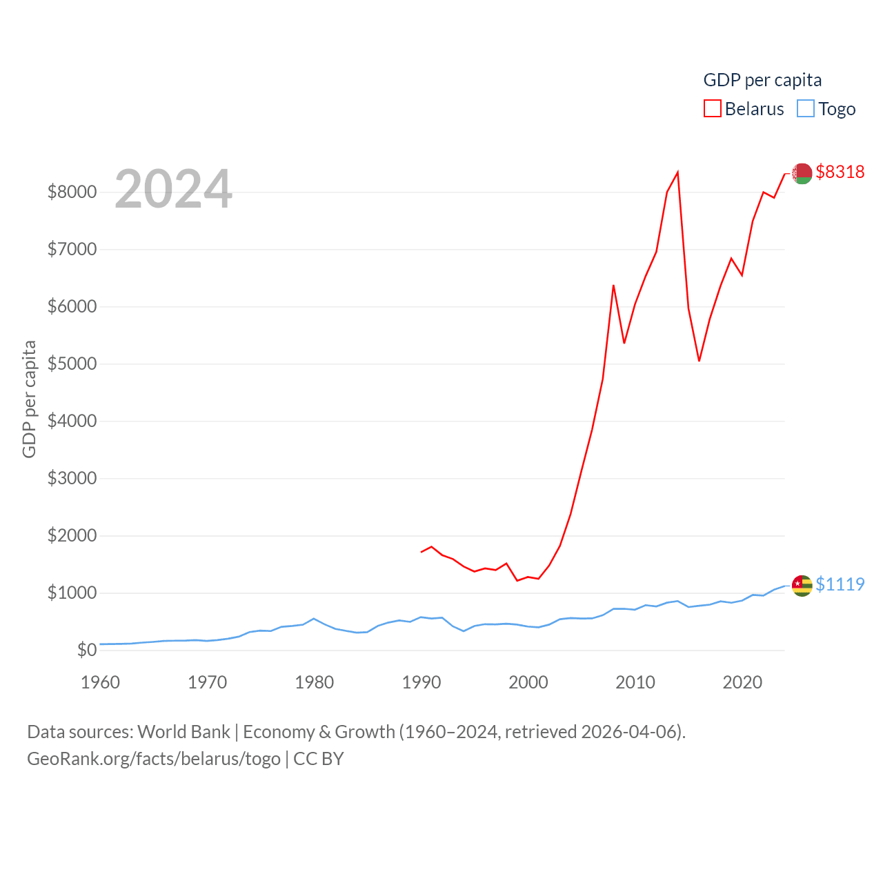 By GDP, Belarus ranks 83/197 ($76B) and Togo ranks 154/197 ($10.7B). By GDP per capita, Belarus ranks 92/197 ($8,318), while Togo ranks 172/197 ($1,119).