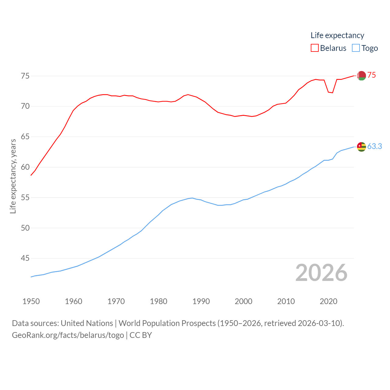 Belarus has a population of 9.13M (ranked 100/197), compared with 9.52M in Togo (ranked 98/197). Belarus' land area is 78,372 sq mi versus 21,000 sq mi for Togo (ranked 83rd vs. 124th).