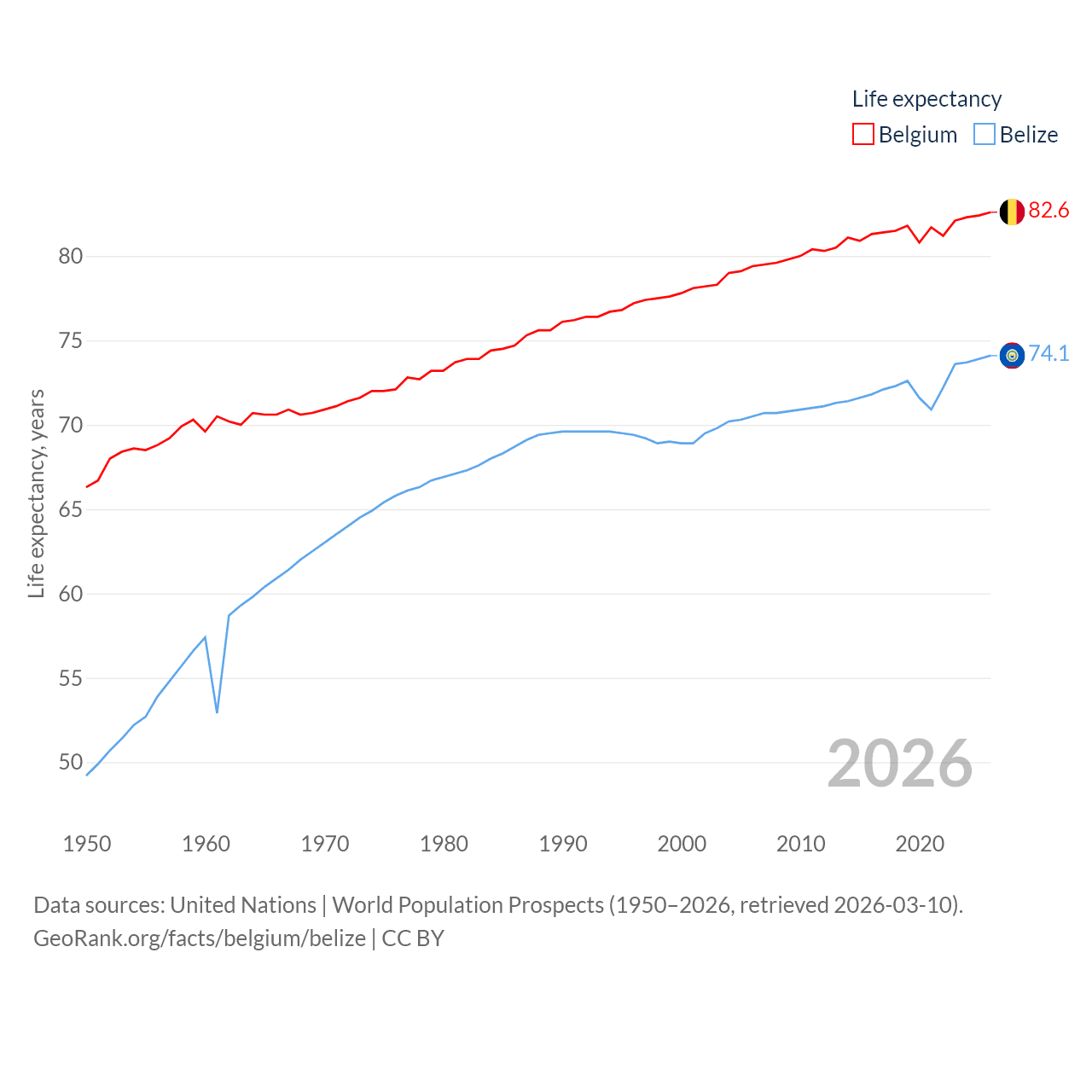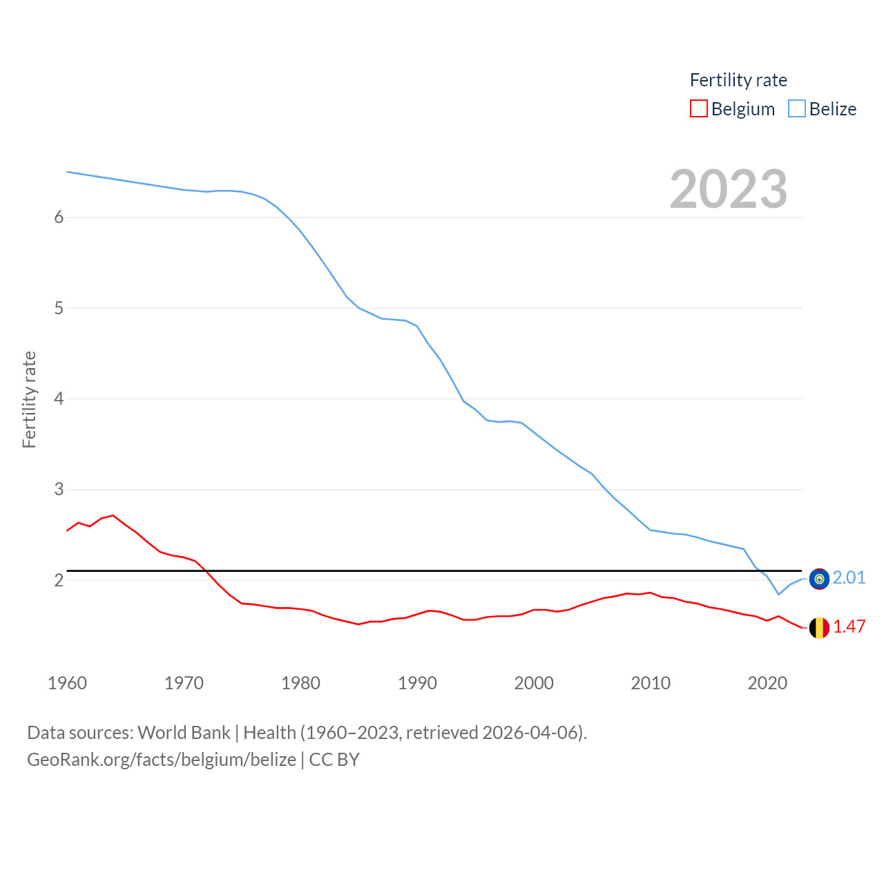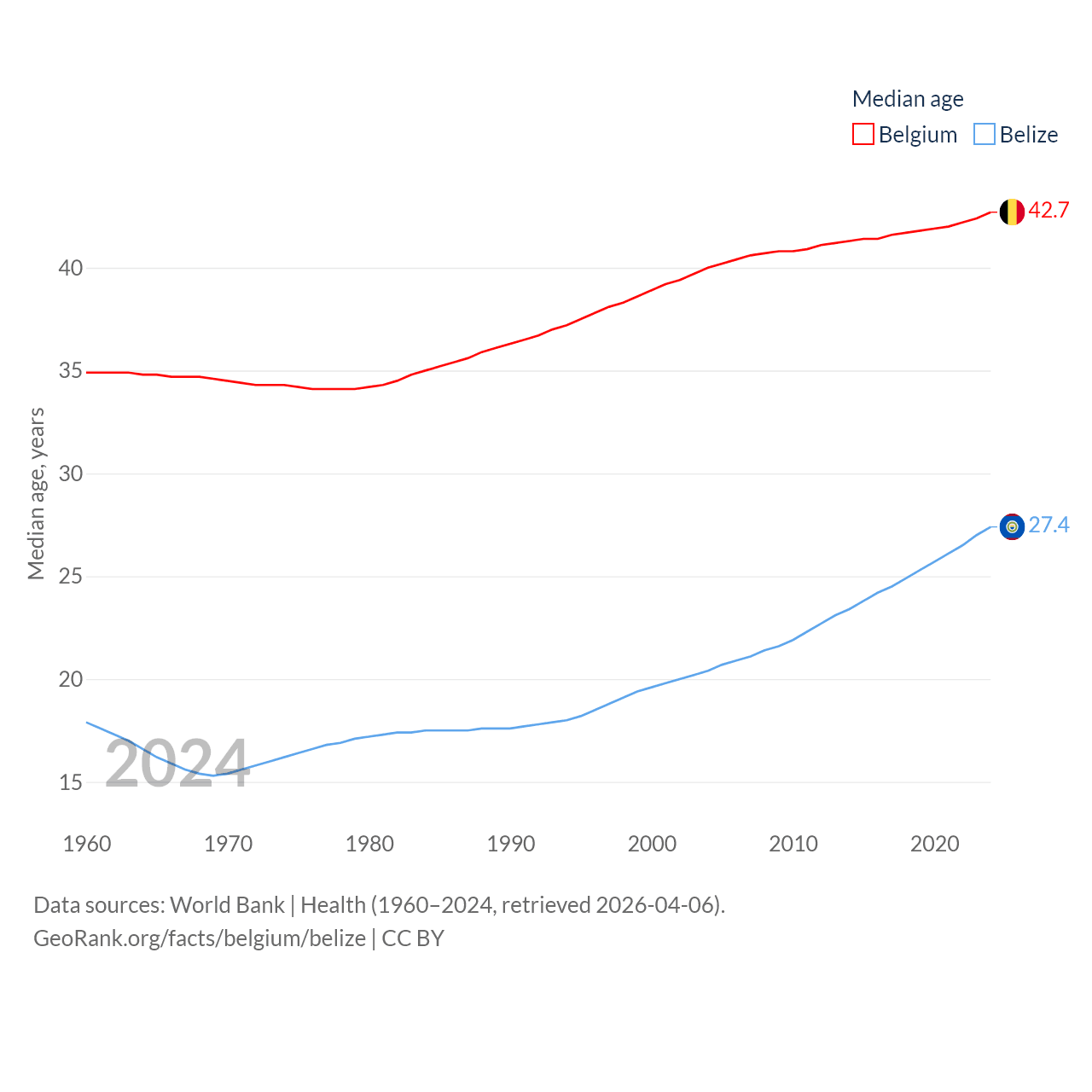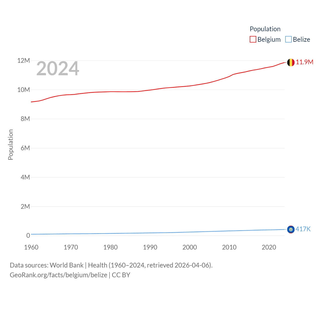 Belgium has a population of 11.9M (ranked 82/197), compared with 417K in Belize (ranked 171/197). Belgium's land area is 11,774 sq mi versus 8,807 sq mi for Belize (ranked 136th vs. 148th).