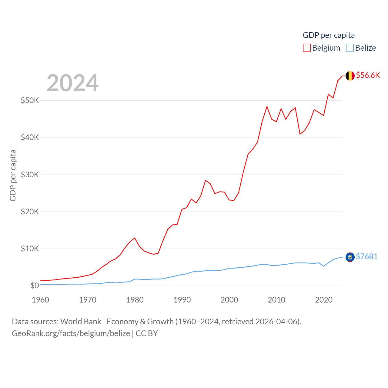By GDP, Belgium ranks 23/197 ($671B) and Belize ranks 168/197 ($3.2B). By GDP per capita, Belgium ranks 18/197 ($56,615), while Belize ranks 98/197 ($7,681).