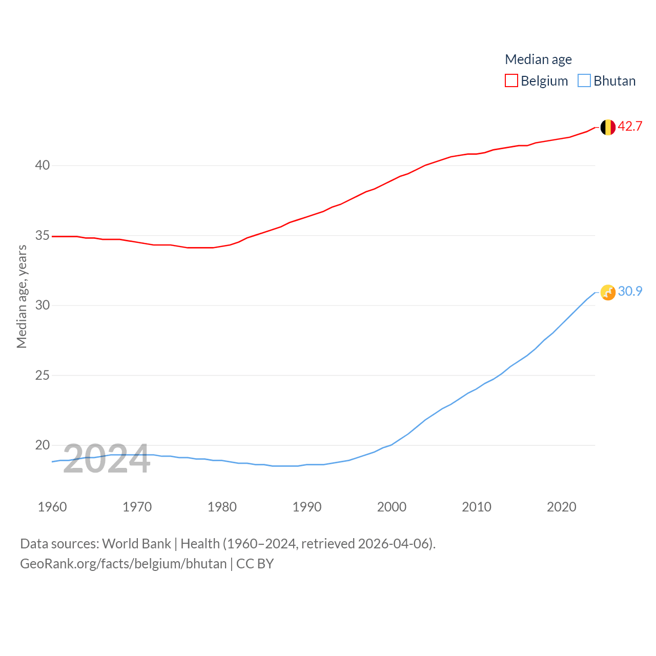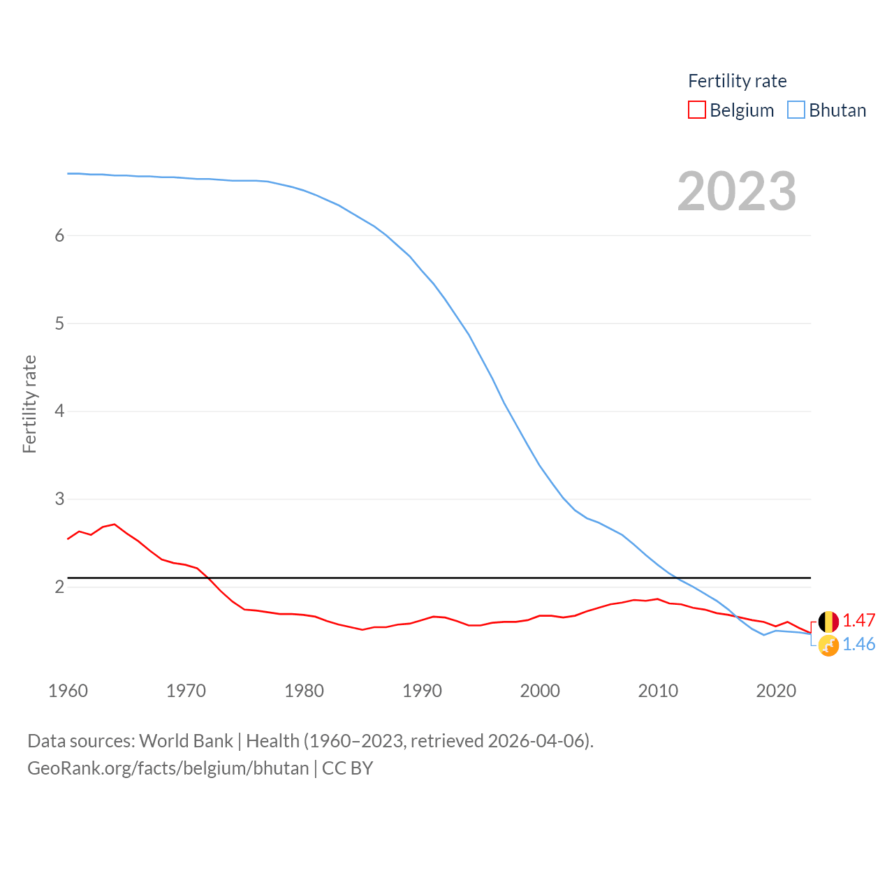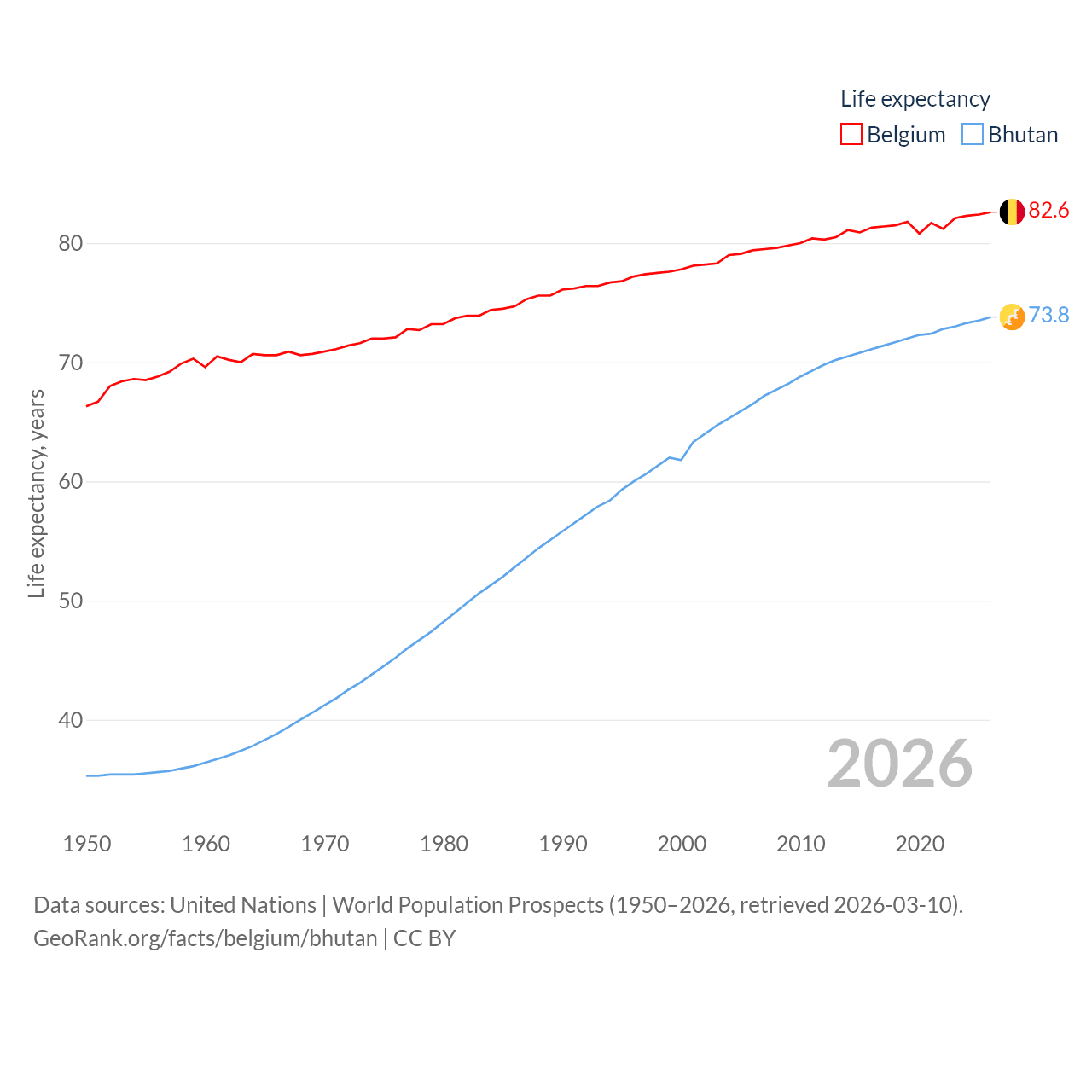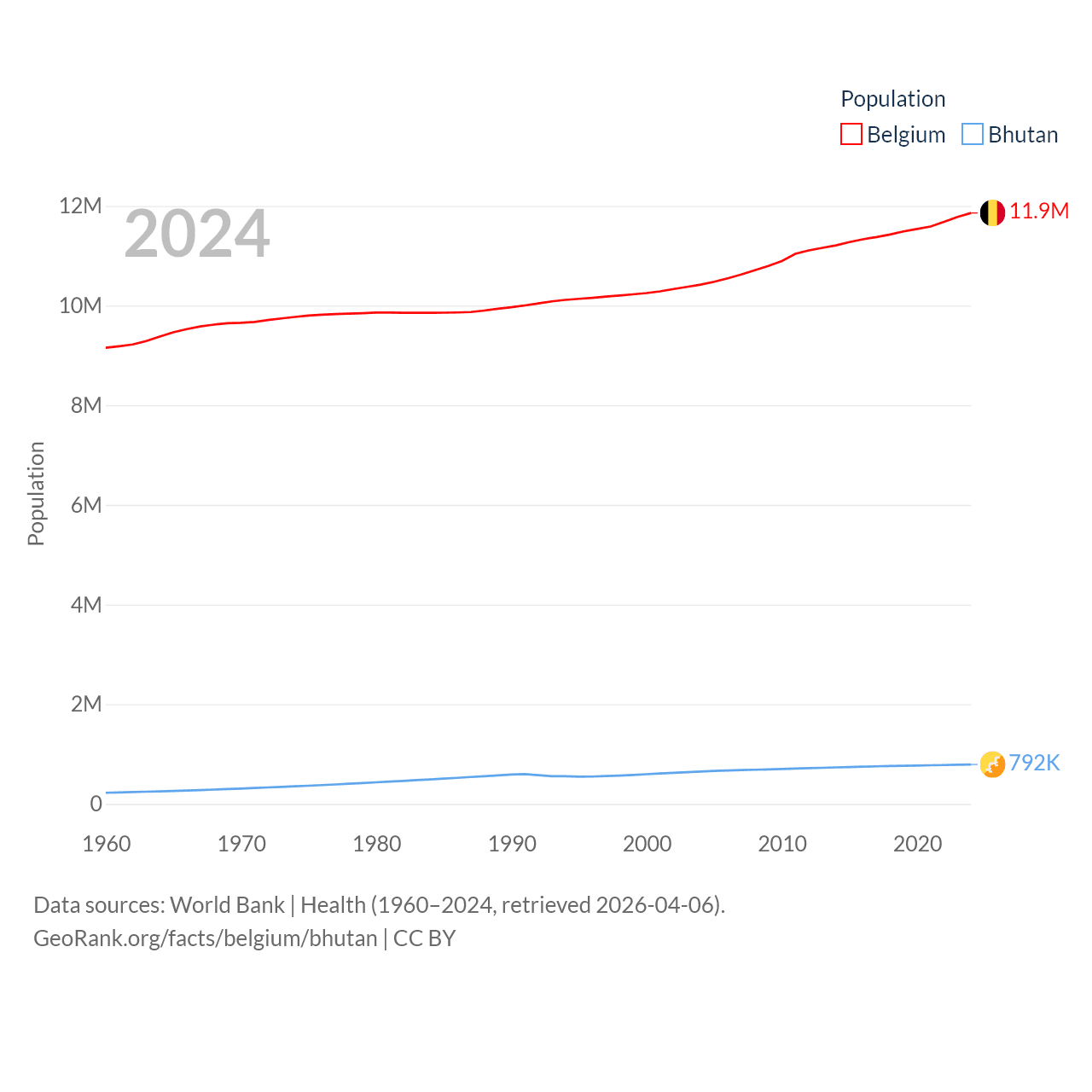 Belgium has a population of 11.9M (ranked 82/197), compared with 792K in Bhutan (ranked 163/197). Belgium's land area is 11,774 sq mi versus 14,726 sq mi for Bhutan (ranked 136th vs. 132nd).