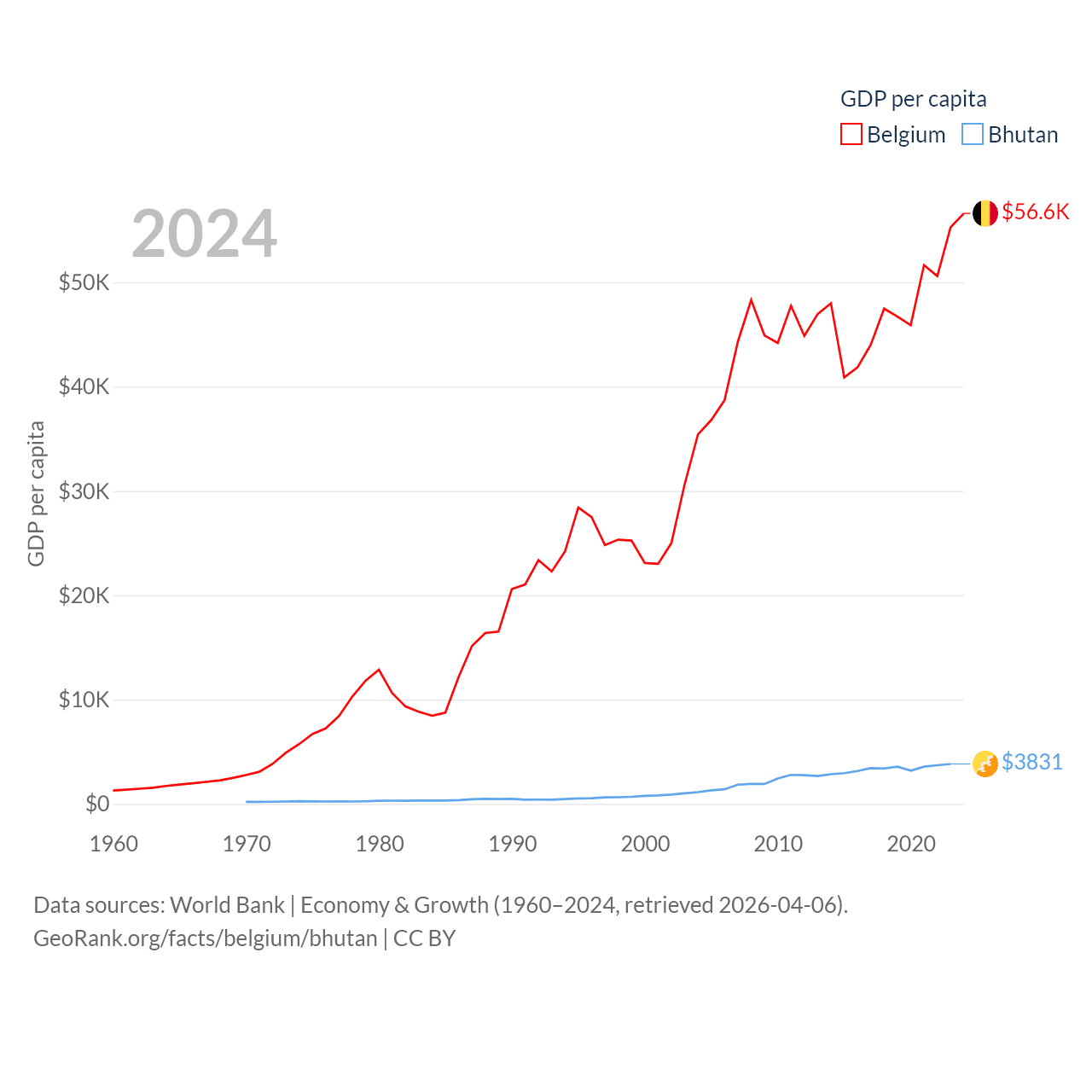 By GDP, Belgium ranks 23/197 ($671B) and Bhutan ranks 170/197 ($3.01B). By GDP per capita, Belgium ranks 18/197 ($56,615), while Bhutan ranks 132/197 ($3,831).