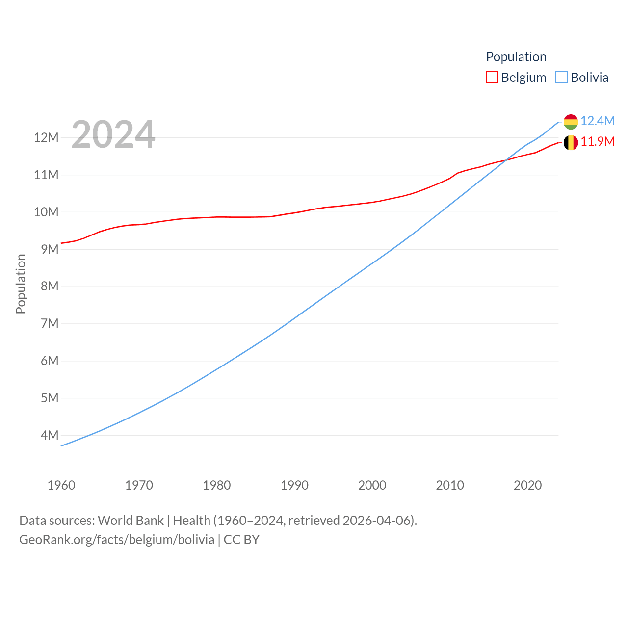Belgium has a population of 11.9M (ranked 82/197), compared with 12.4M in Bolivia (ranked 79/197). Belgium's land area is 11,774 sq mi versus 418,264 sq mi for Bolivia (ranked 136th vs. 27th).