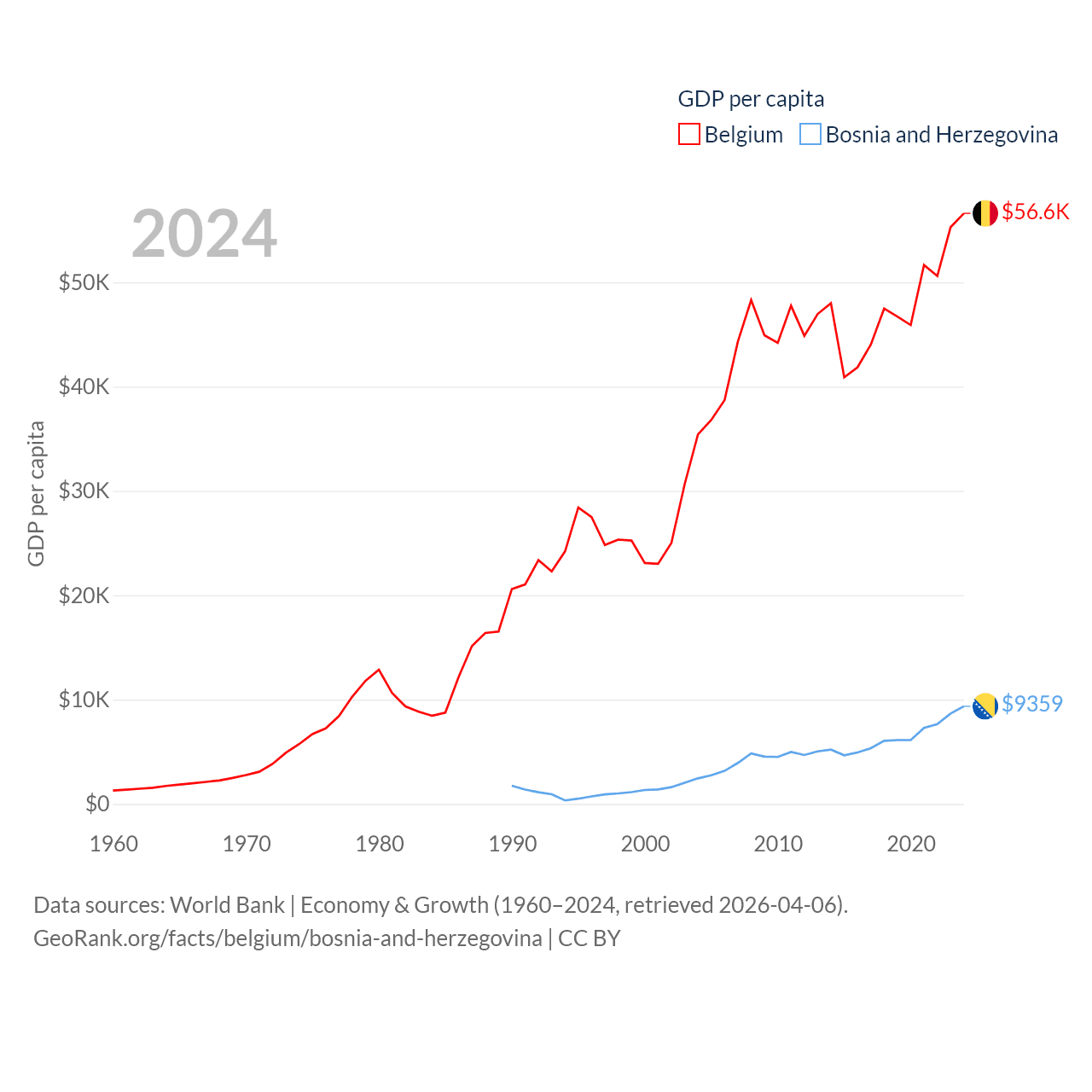By GDP, Belgium ranks 23/197 ($671B) and Bosnia and Herzegovina ranks 111/197 ($29.6B). By GDP per capita, Belgium ranks 18/197 ($56,615), while Bosnia and Herzegovina ranks 87/197 ($9,359).