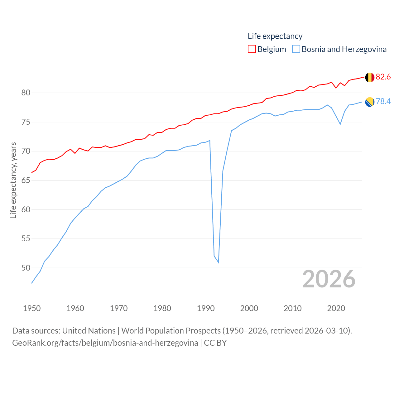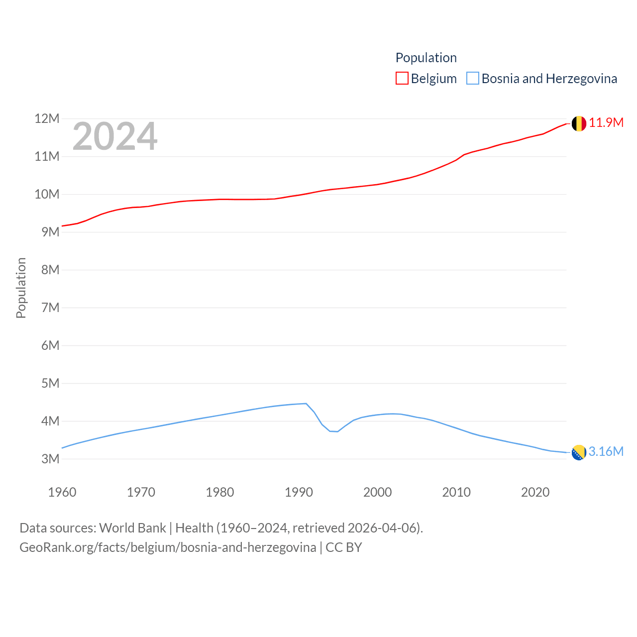 Belgium has a population of 11.9M (ranked 82/197), compared with 3.16M in Bosnia and Herzegovina (ranked 134/197). Belgium's land area is 11,774 sq mi versus 19,768 sq mi for Bosnia and Herzegovina (ranked 136th vs. 125th).