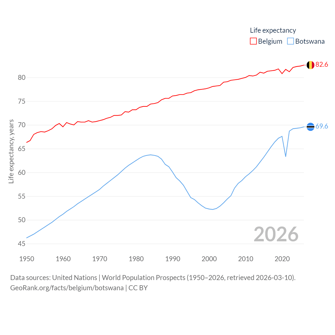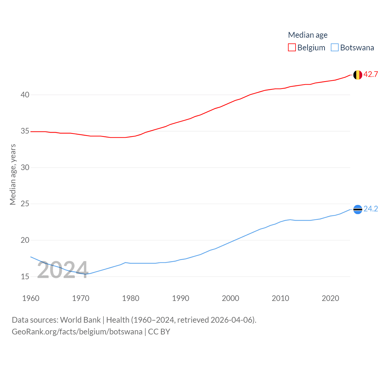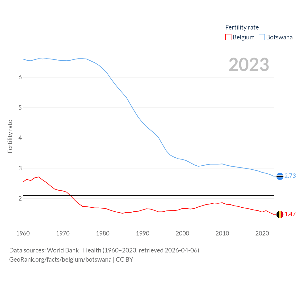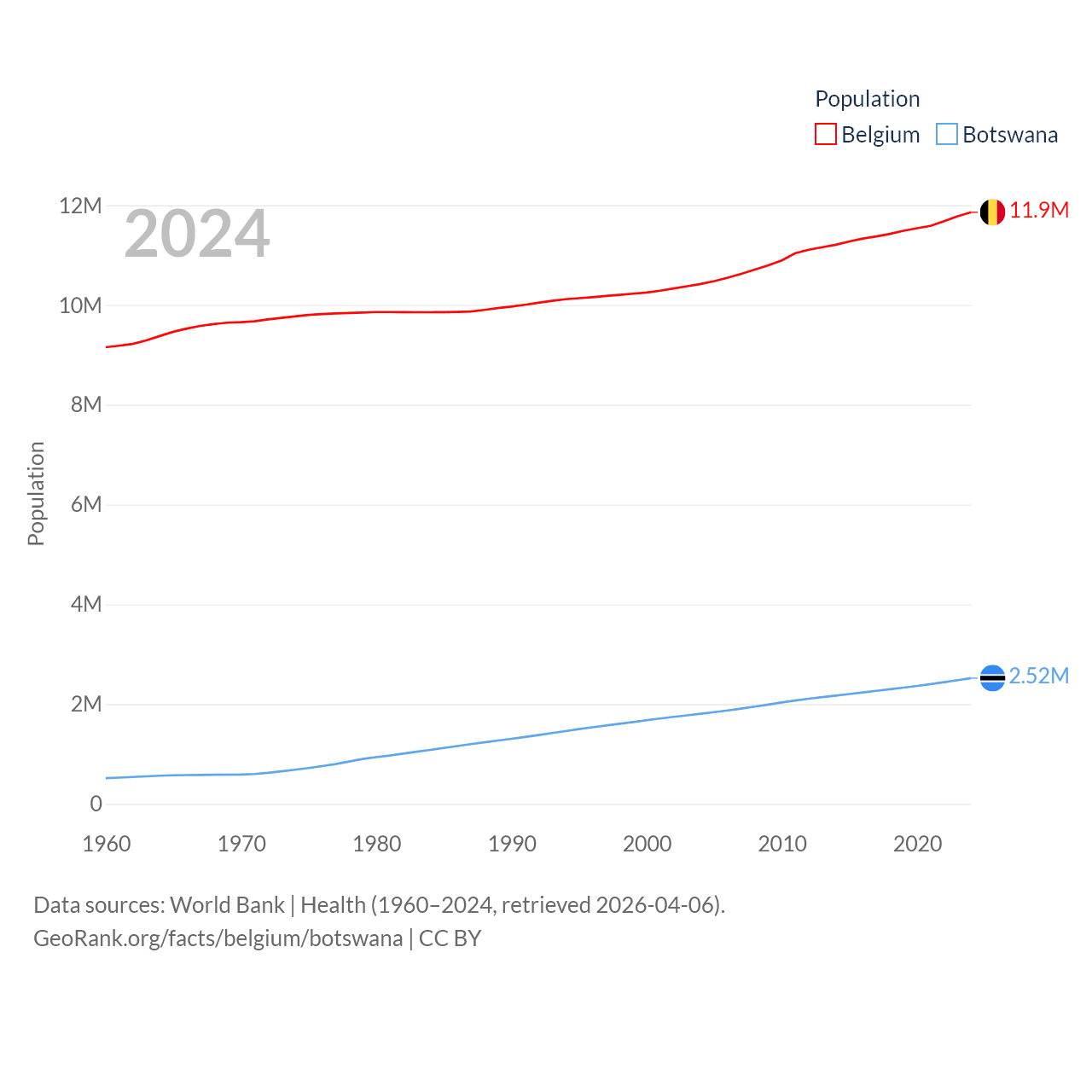 Belgium has a population of 11.9M (ranked 82/197), compared with 2.52M in Botswana (ranked 142/197). Belgium's land area is 11,774 sq mi versus 218,816 sq mi for Botswana (ranked 136th vs. 47th).