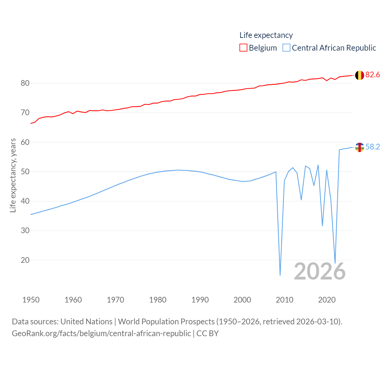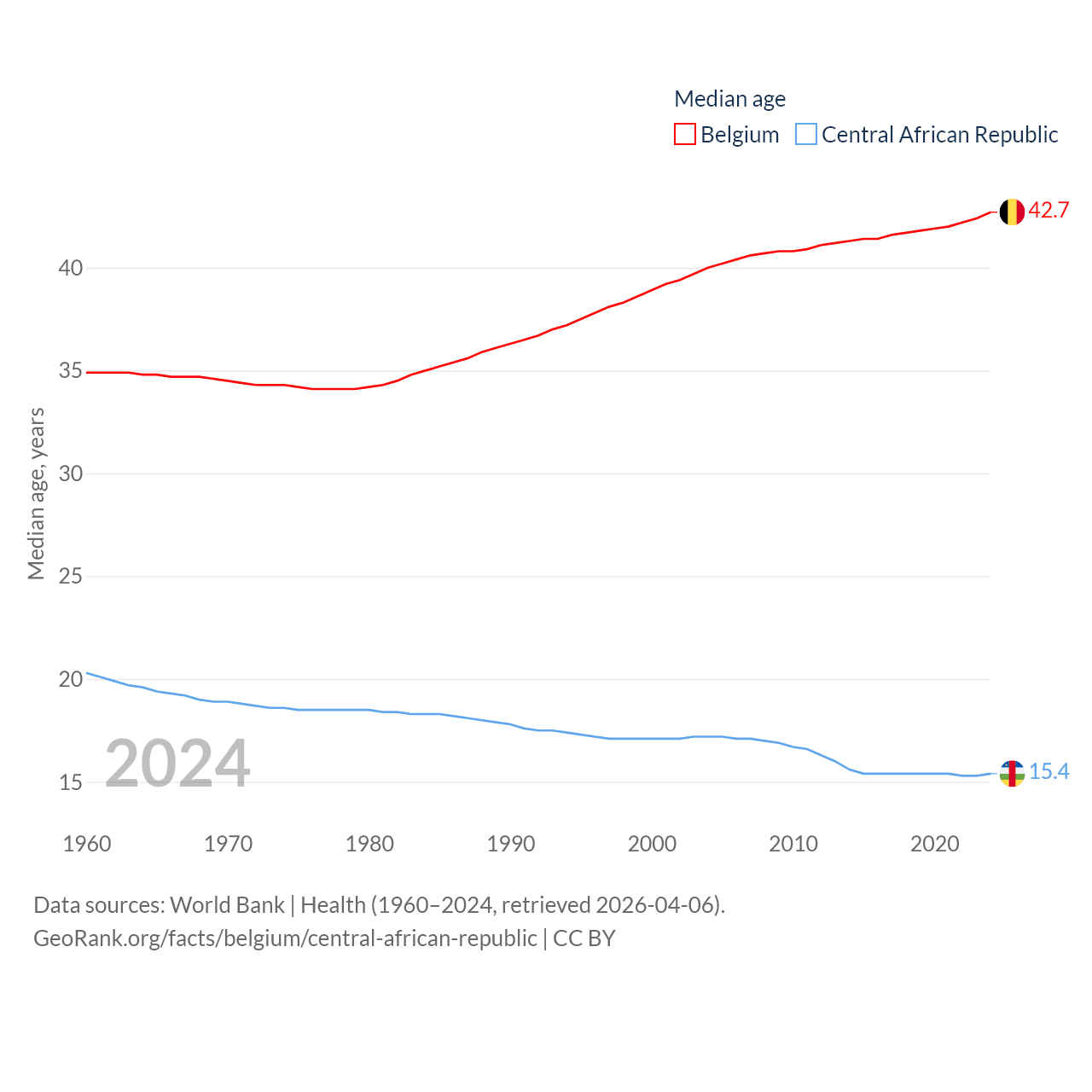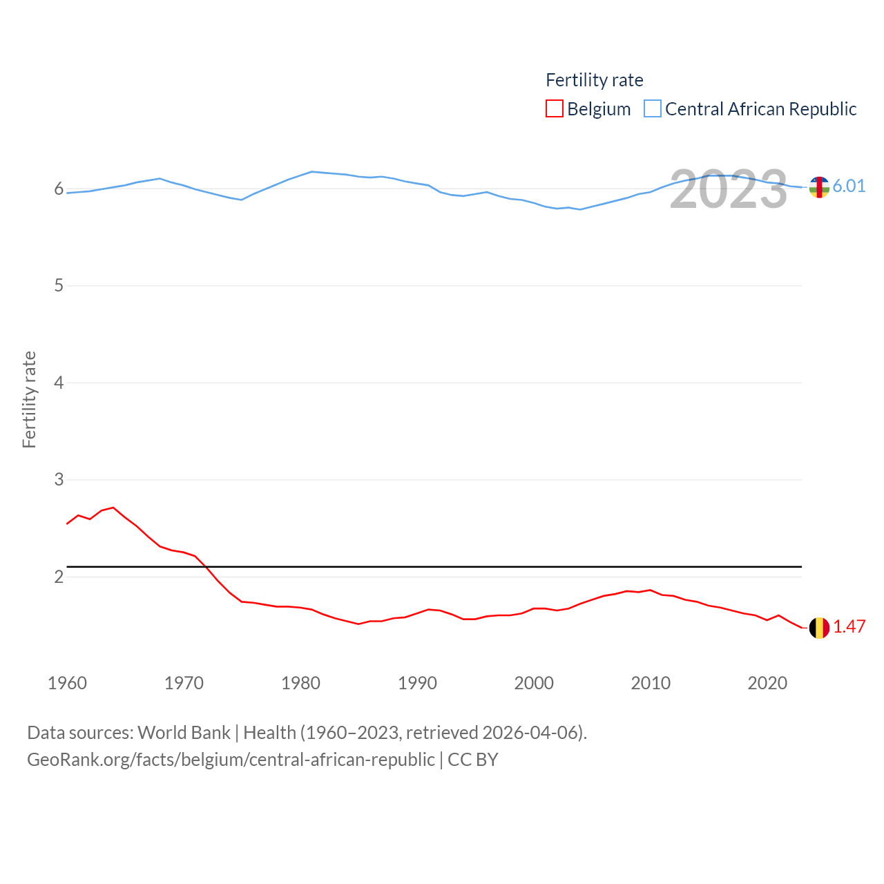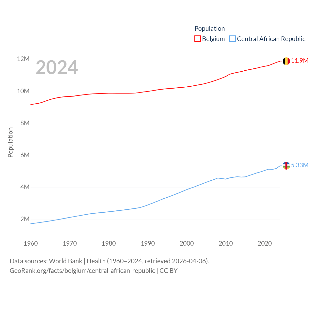Belgium has a population of 11.9M (ranked 82/197), compared with 5.33M in The Central African Republic (ranked 121/197). Belgium's land area is 11,774 sq mi versus 240,534 sq mi for The Central African Republic (ranked 136th vs. 43rd).