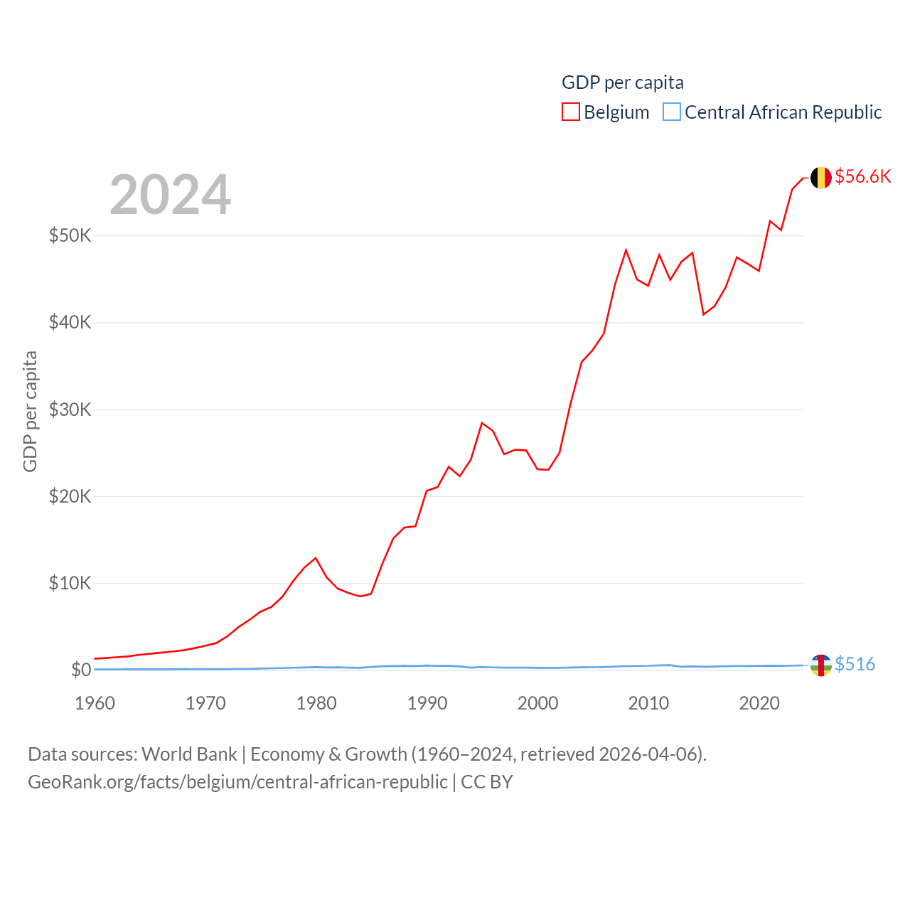 By GDP, Belgium ranks 23/197 ($671B) and The Central African Republic ranks 171/197 ($2.75B). By GDP per capita, Belgium ranks 18/197 ($56,615), while The Central African Republic ranks 195/197 ($516).