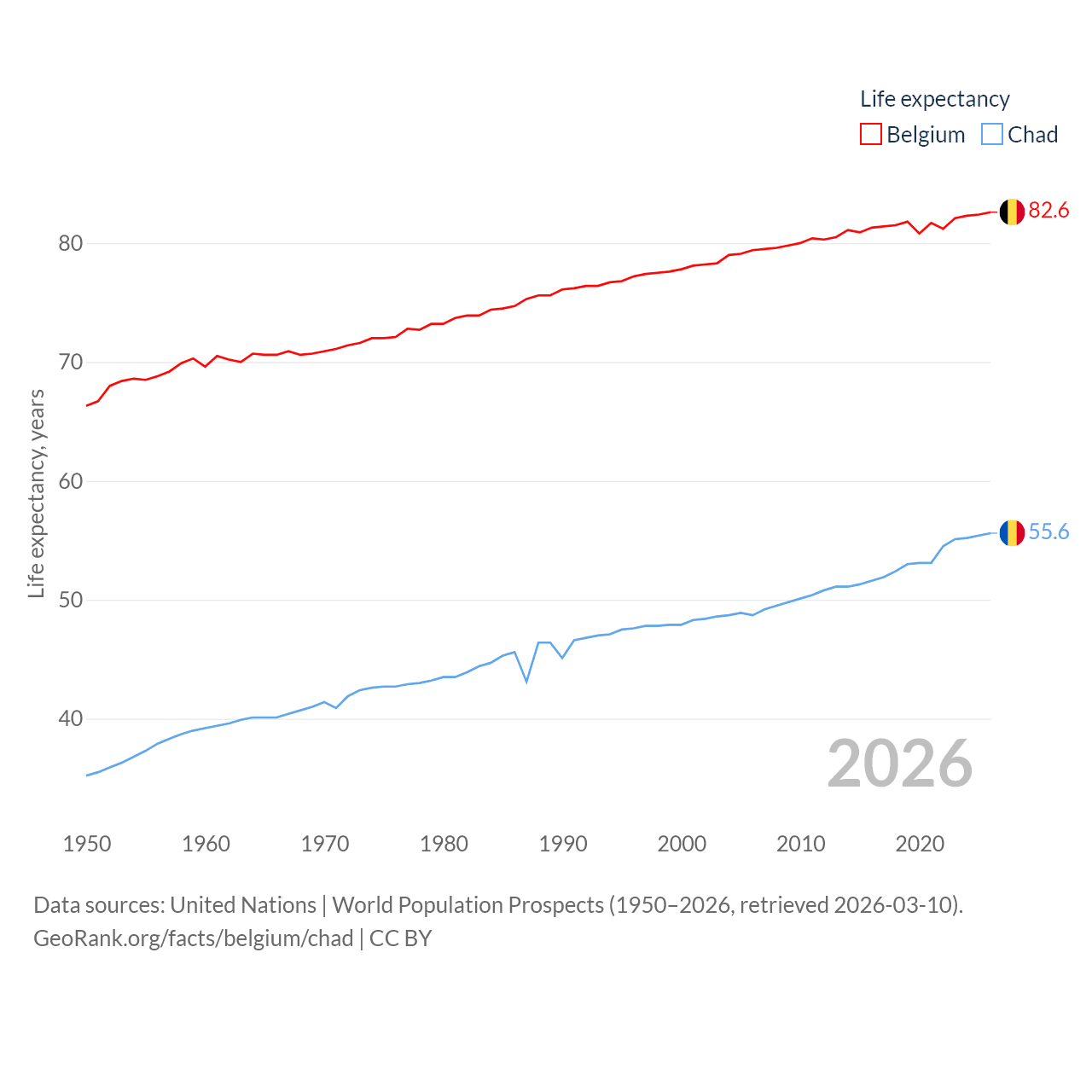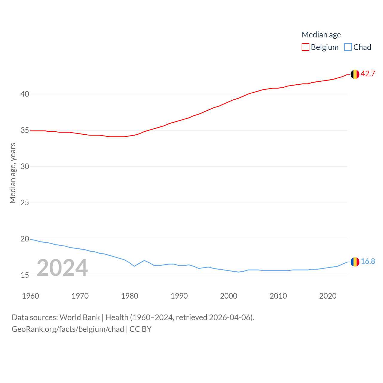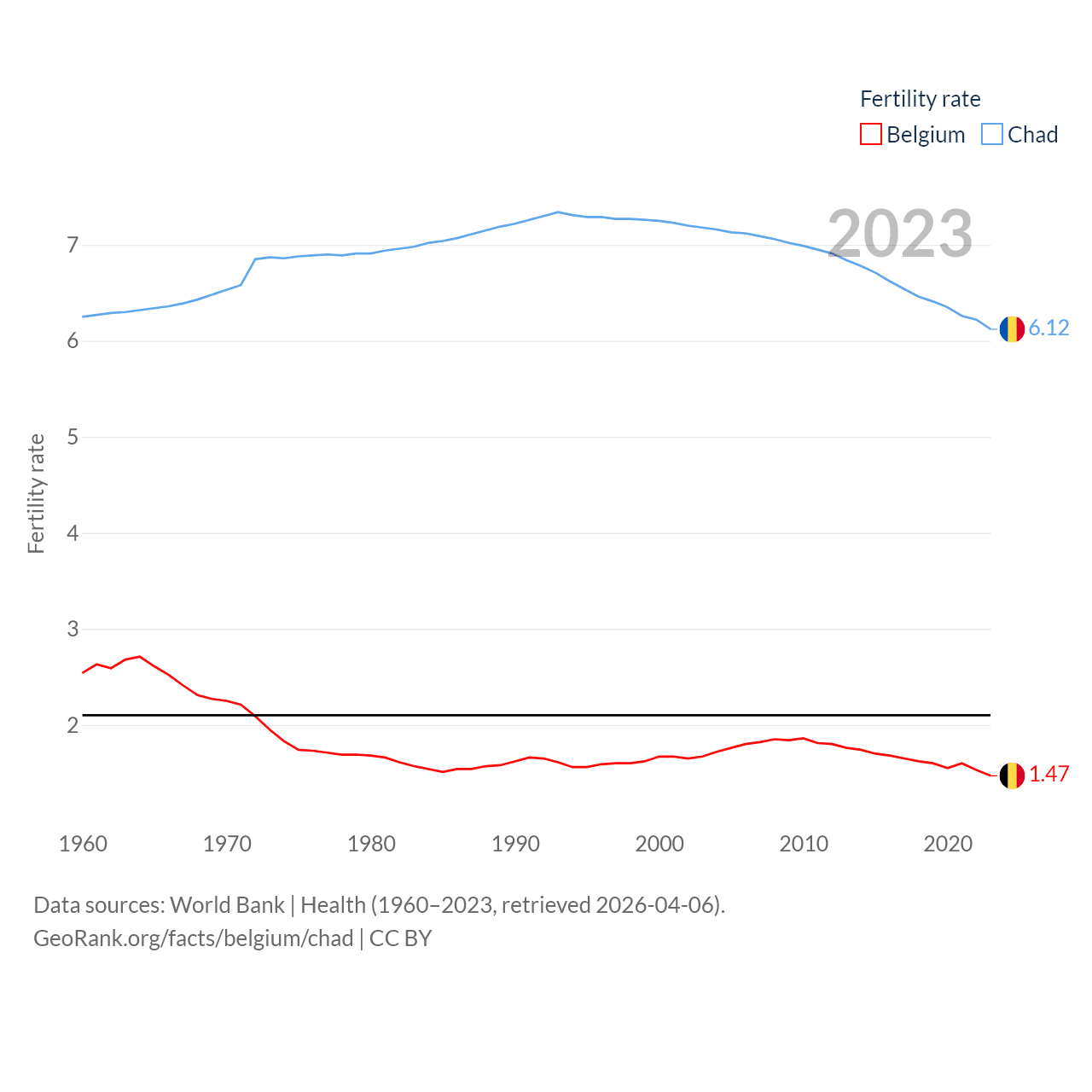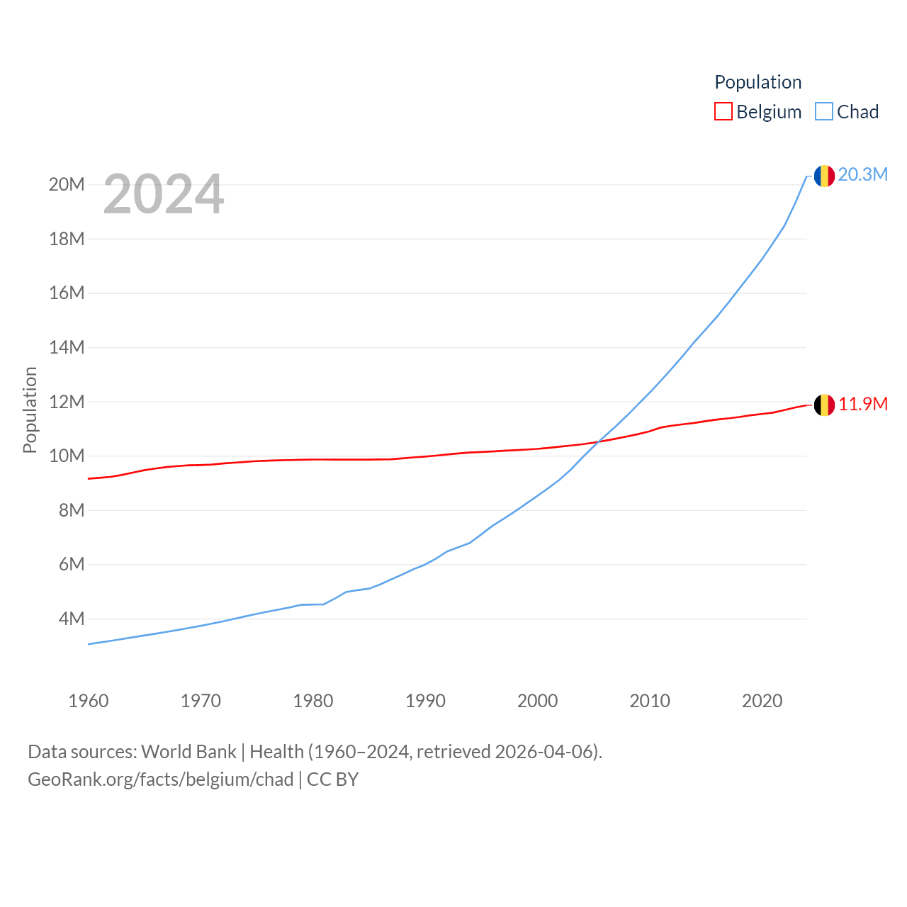 Belgium has a population of 11.9M (ranked 82/197), compared with 20.3M in Chad (ranked 65/197). Belgium's land area is 11,774 sq mi versus 486,180 sq mi for Chad (ranked 136th vs. 21st).