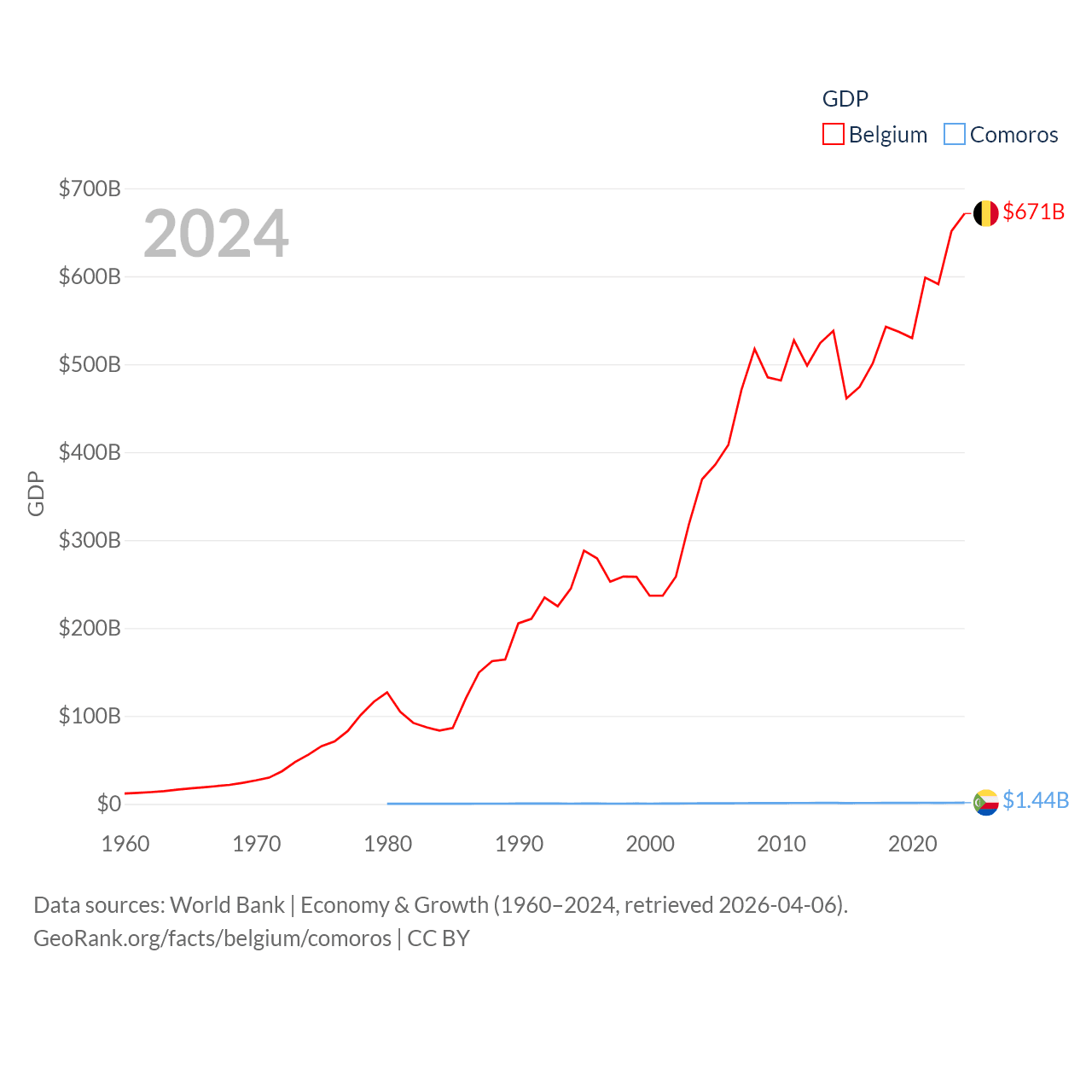 By GDP, Belgium ranks 23/197 ($671B) and Comoros ranks 183/197 ($1.44B). By GDP per capita, Belgium ranks 18/197 ($56,615), while Comoros ranks 161/197 ($1,663).