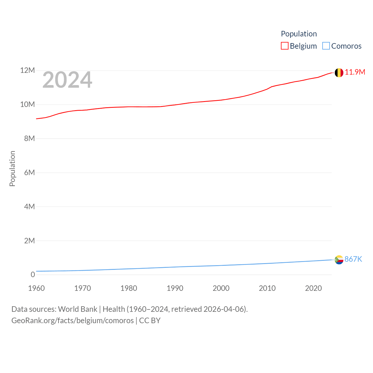 Belgium has a population of 11.9M (ranked 82/197), compared with 867K in Comoros (ranked 160/197). Belgium's land area is 11,774 sq mi versus 719 sq mi for Comoros (ranked 136th vs. 171st).