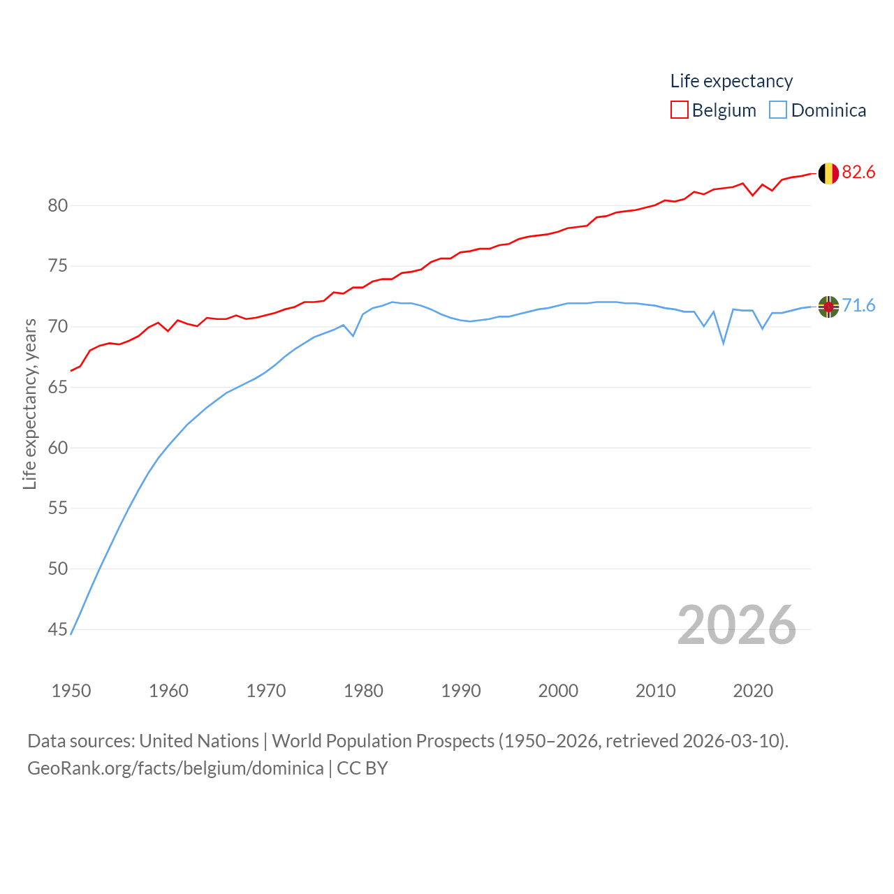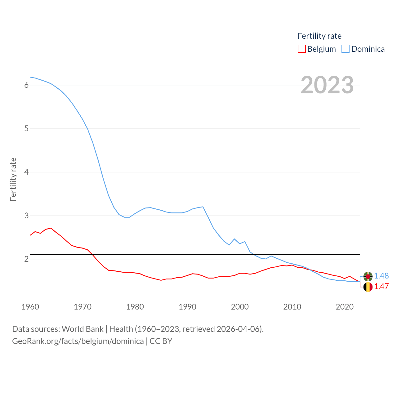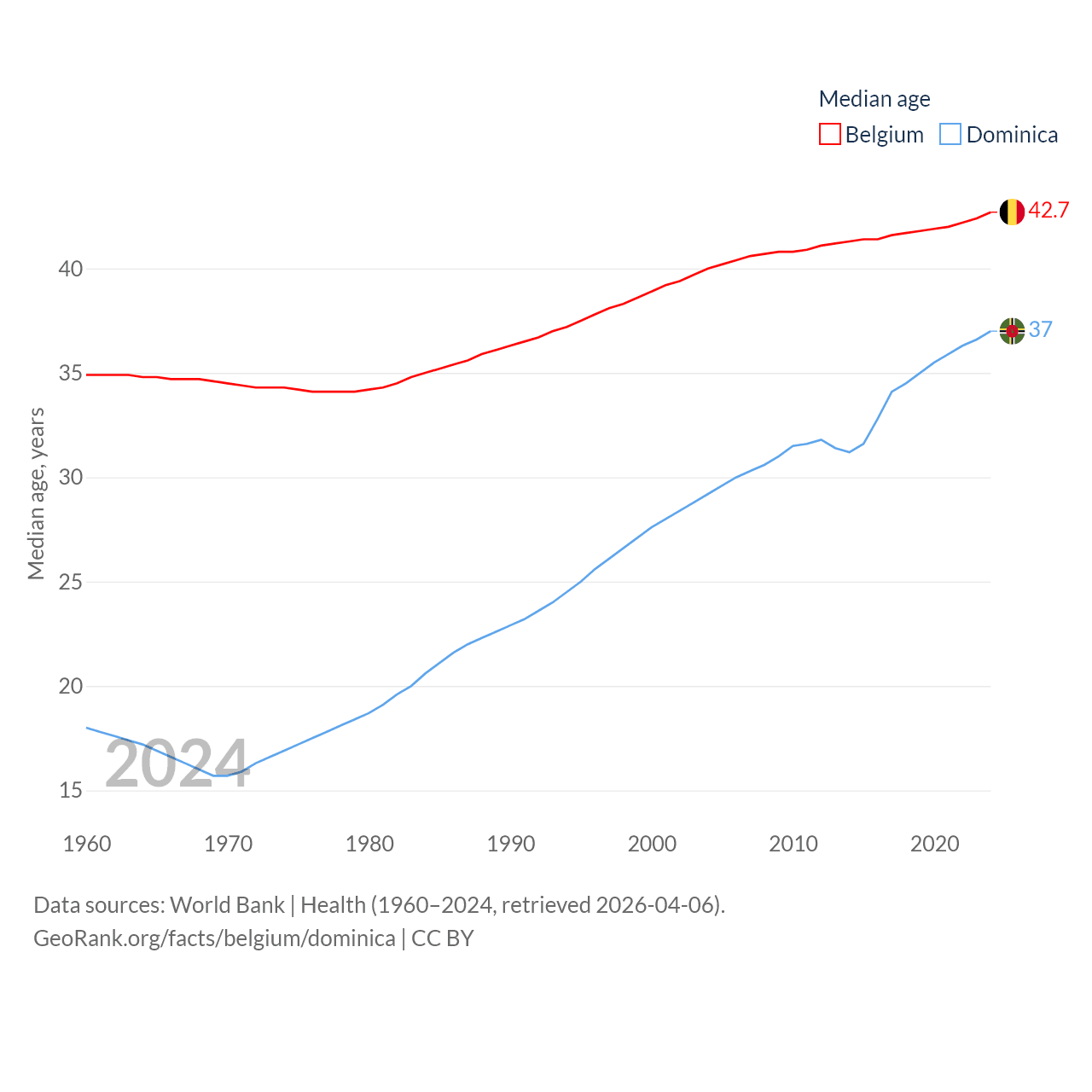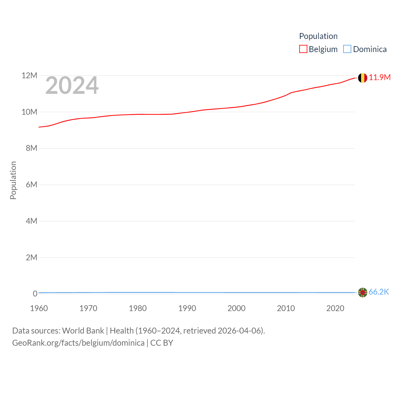 Belgium has a population of 11.9M (ranked 82/197), compared with 66.2K in Dominica (ranked 188/197). Belgium's land area is 11,774 sq mi versus 289.6 sq mi for Dominica (ranked 136th vs. 175th).