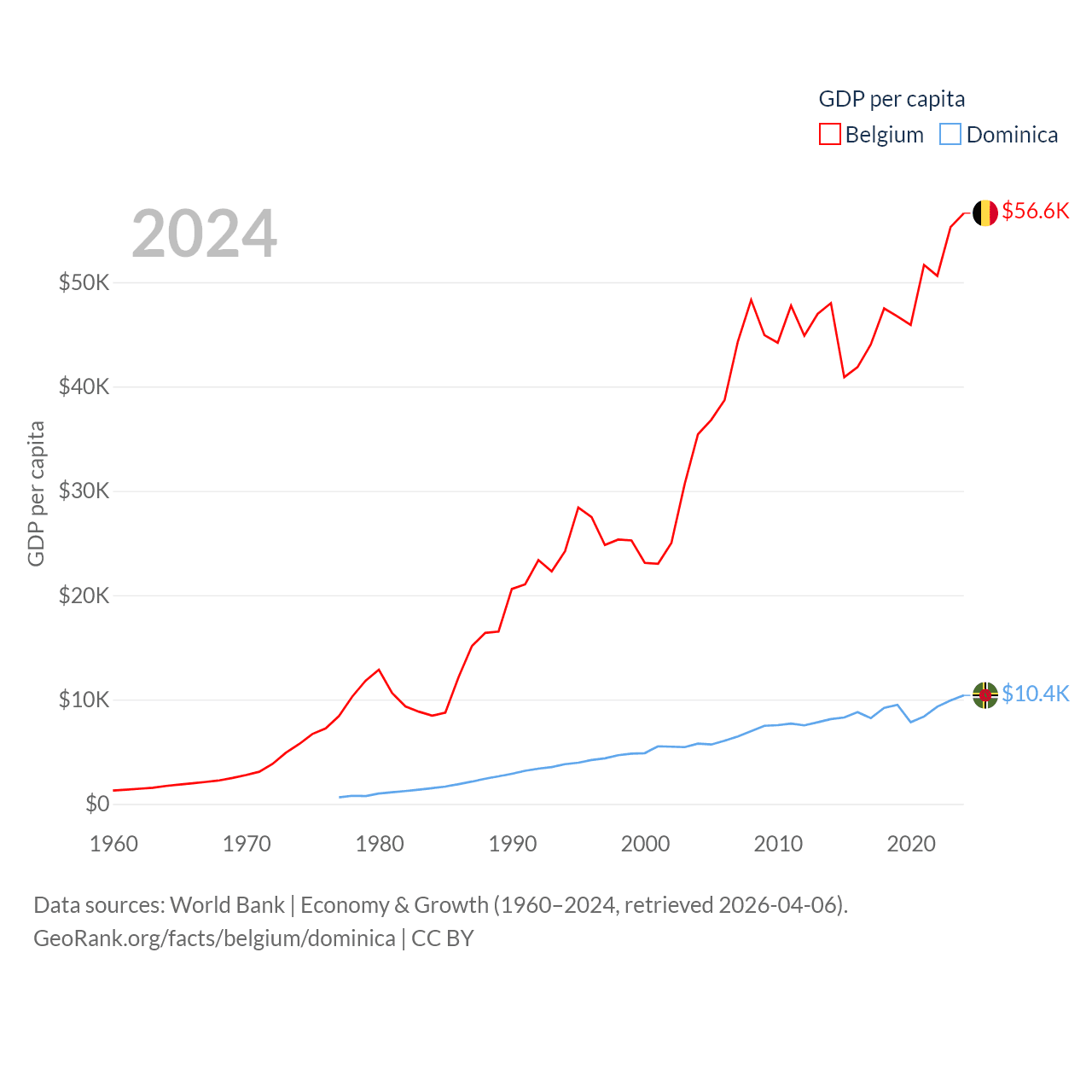 By GDP, Belgium ranks 23/197 ($671B) and Dominica ranks 190/197 ($689M). By GDP per capita, Belgium ranks 18/197 ($56,615), while Dominica ranks 84/197 ($10,405).